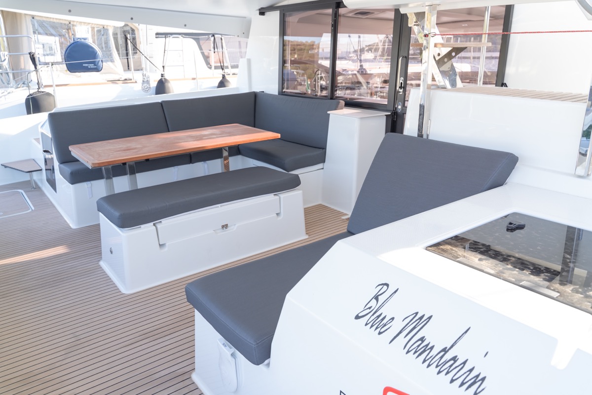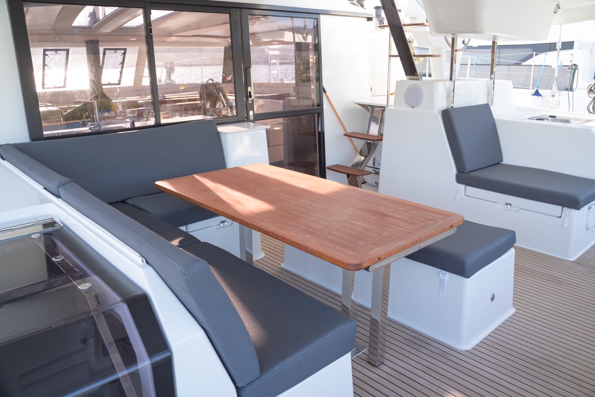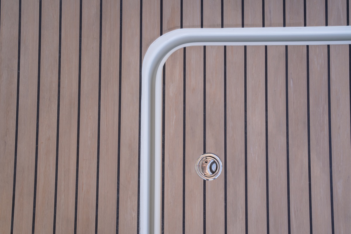 | Outside | Biminitop, Cockpitdusche, Cockpitlautsprecher, Cockpitpolster, Deckpolster, elektr. Ankerwinsch, elektr. Winsch, Grill, Teak im Cockpit |