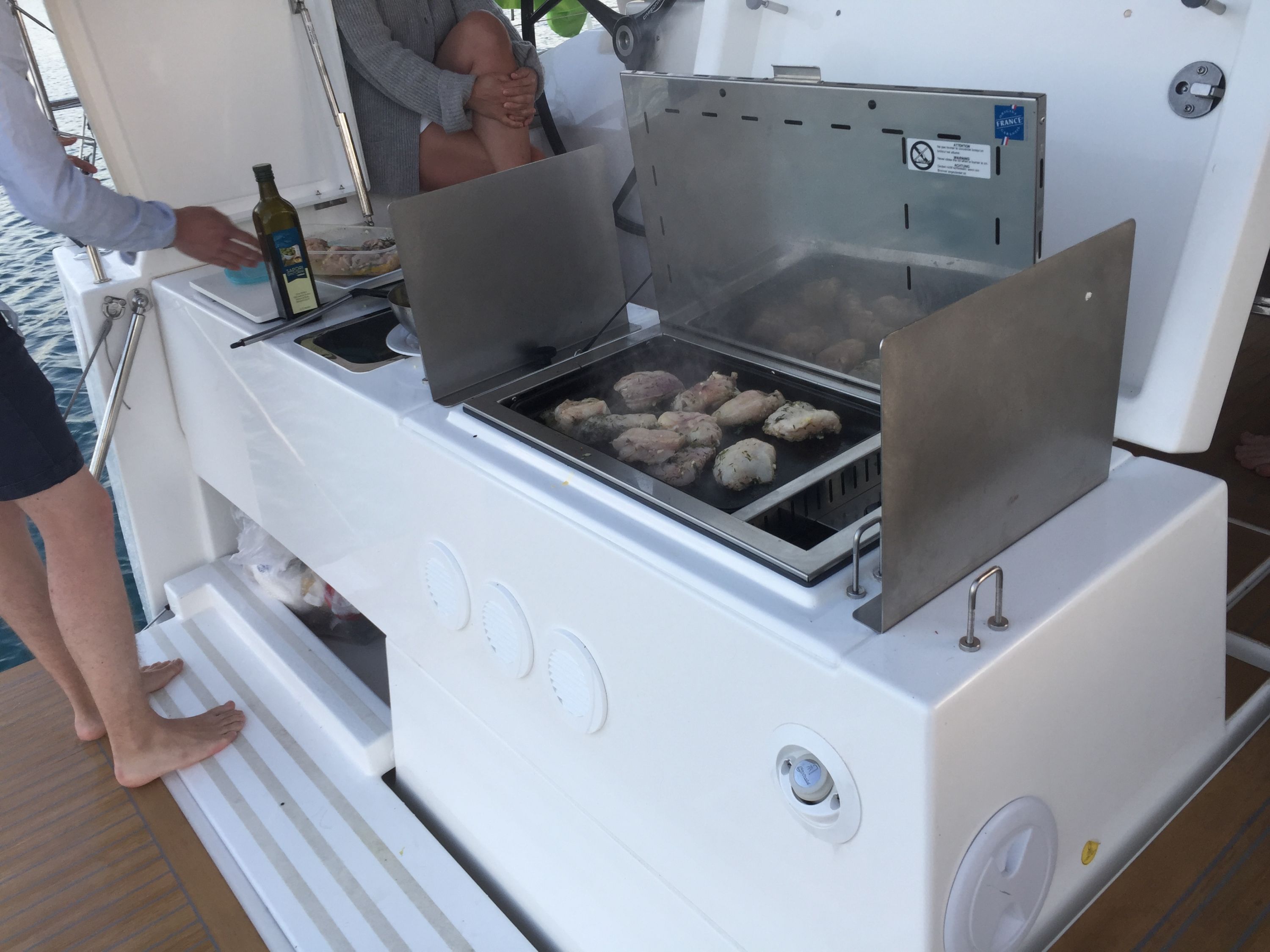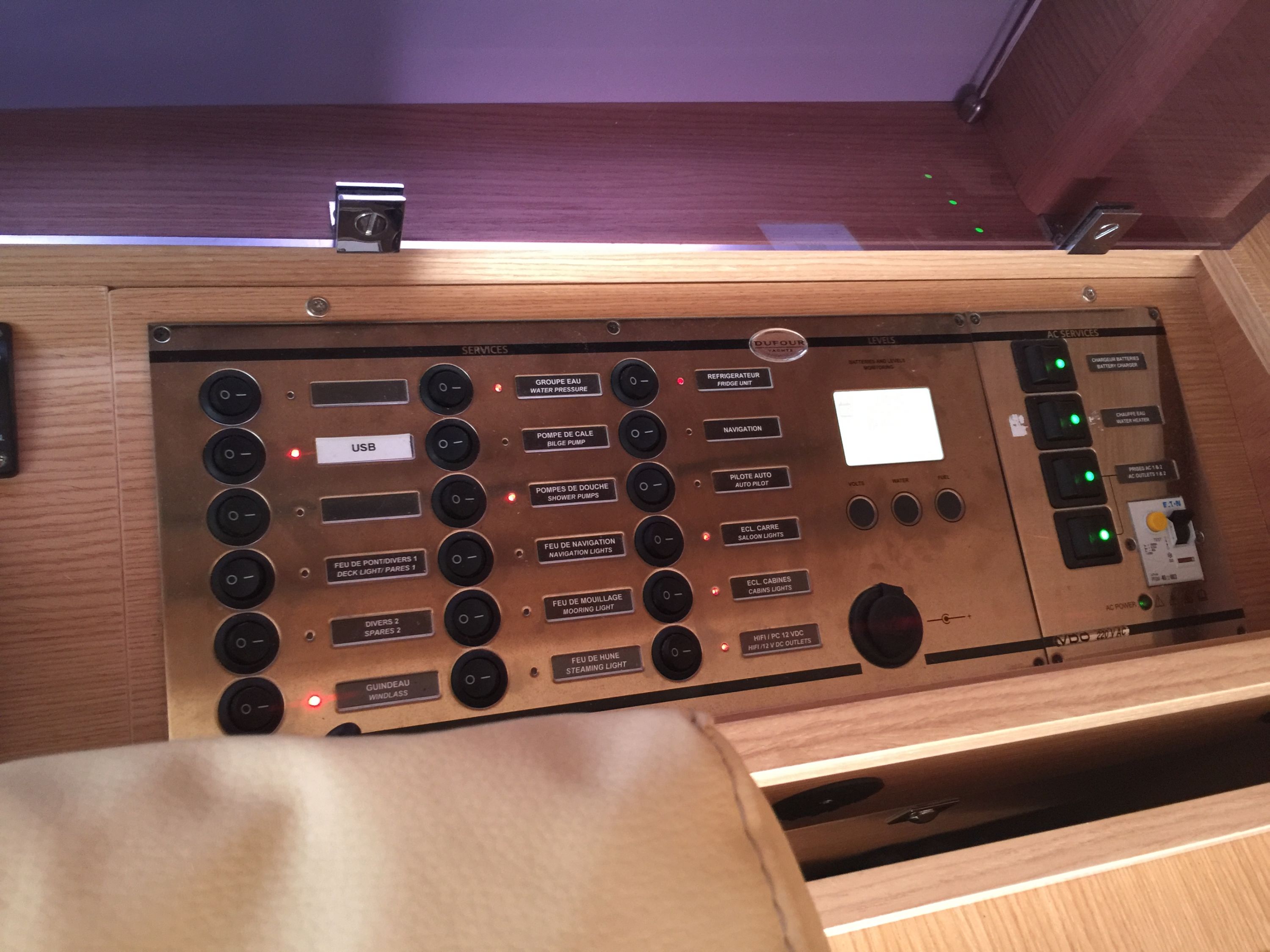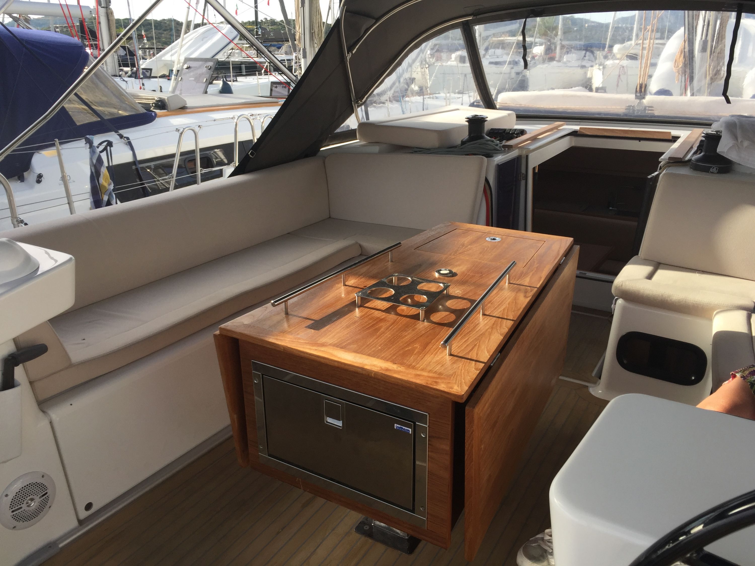 | Outside | Anker mit Kette, Badeplattform, Biminitop, Cockpitlautsprecher, Cockpitpolster, Deckpolster, elektr. Ankerwinsch, elektr. Winsch, Gangway, Grill, Solaranlage, Sprayhood, Teak im Cockpit, Unterwasserbeleuchtung |