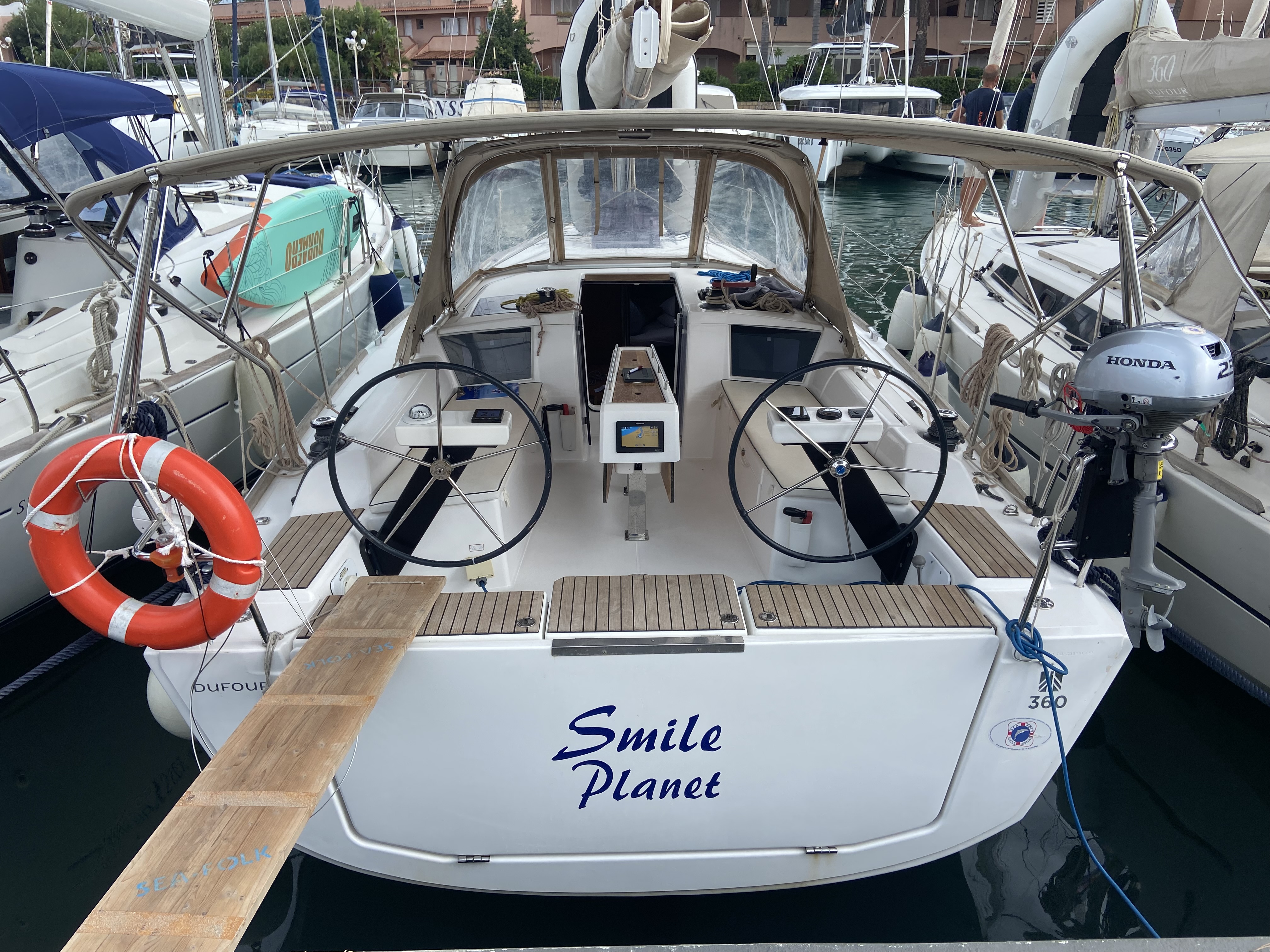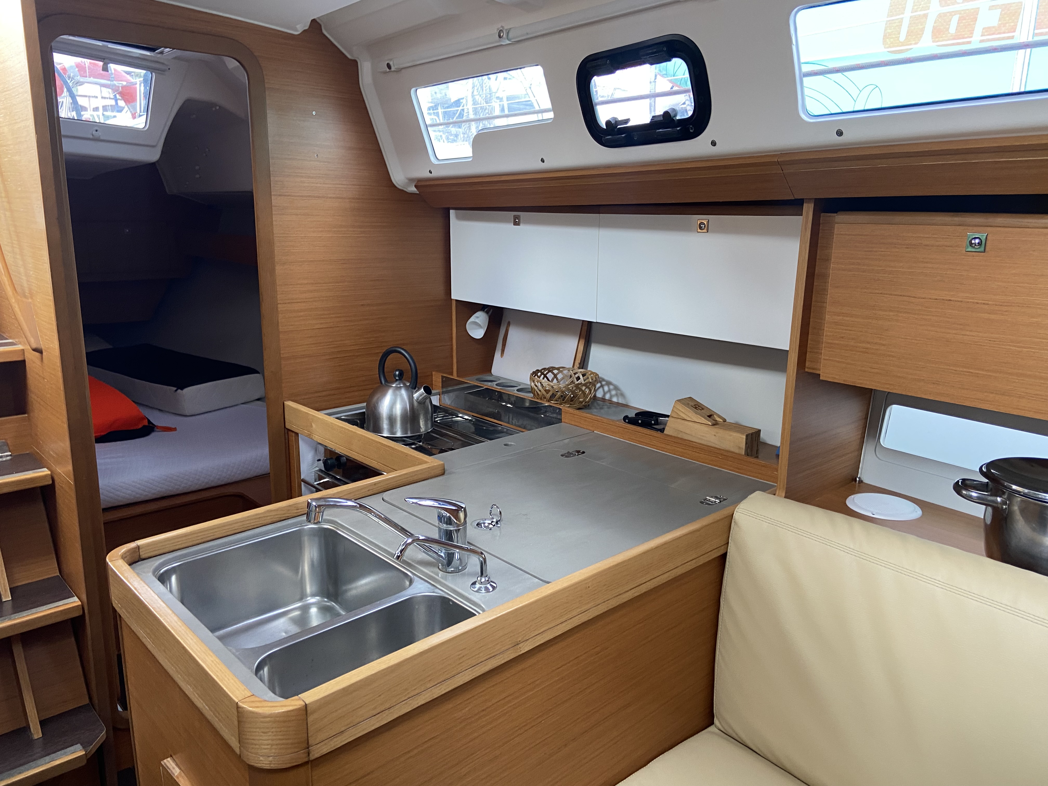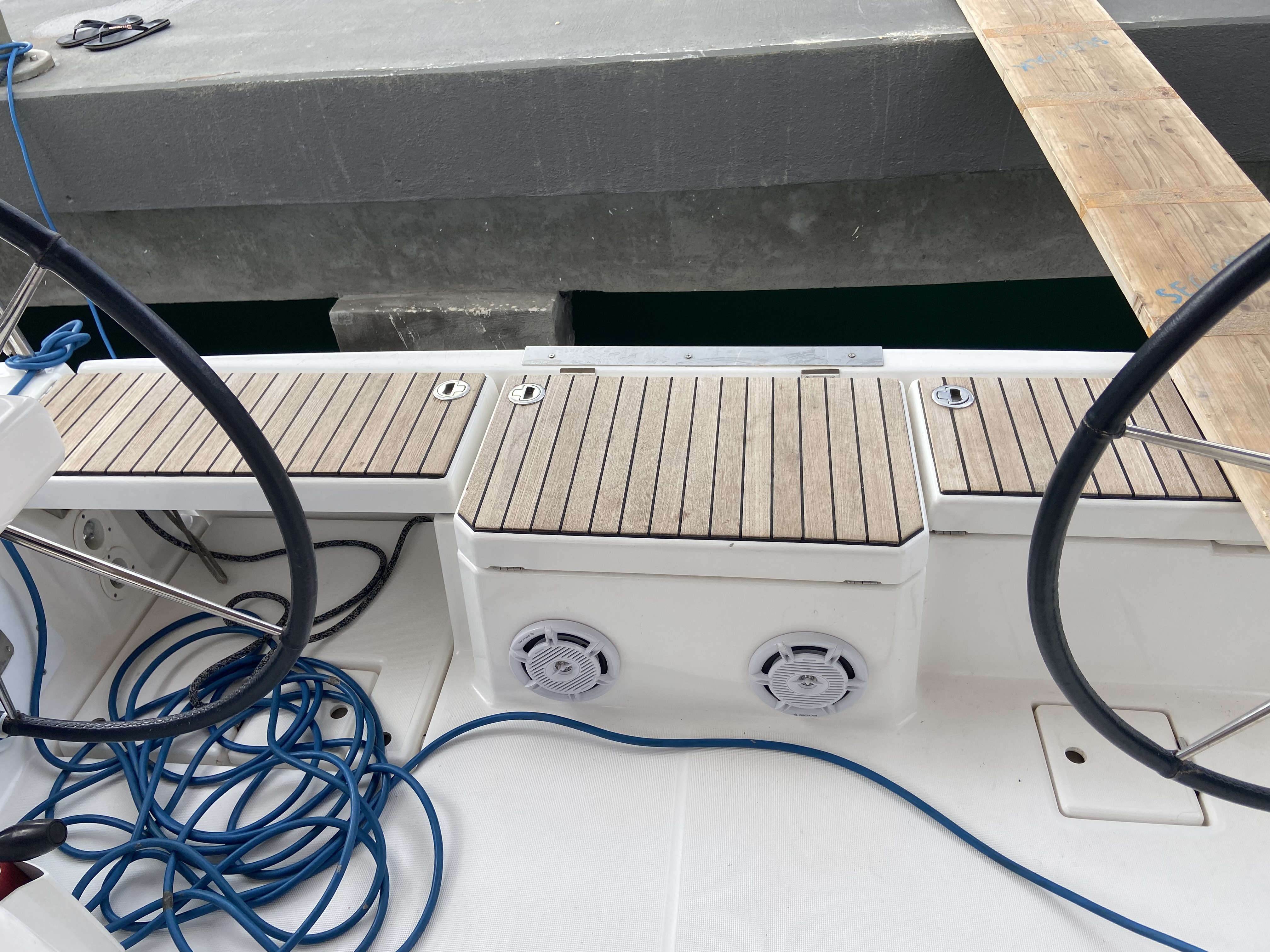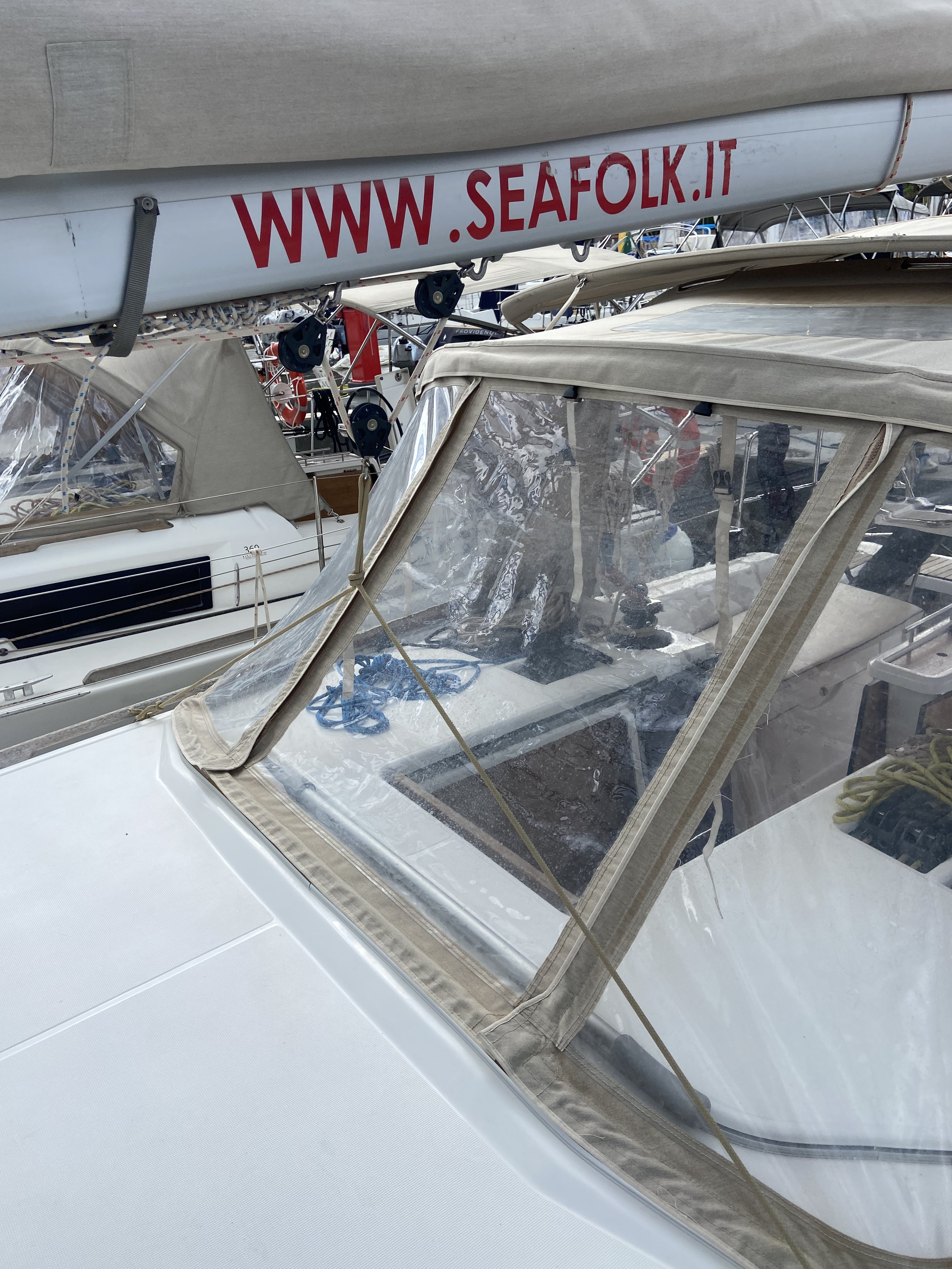 Outside 220 V-Landanschluss, Anker mit Kette, Biminitop, Cockpitlautsprecher, Cockpitpolster, Cockpittisch, Deckbeleuchtung, elektr. Ankerwinsch, Sprayhood
