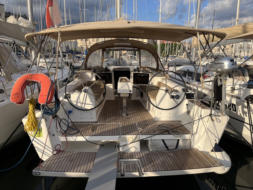 | Outside | Anker mit Kette, Außendusche, Badeplattform, Biminitop, Bootshaken, elektr. Ankerwinsch, Fender, Kunststoff-Eimer (Pütz), Sprayhood, Teak im Cockpit, Windex, Winschen |