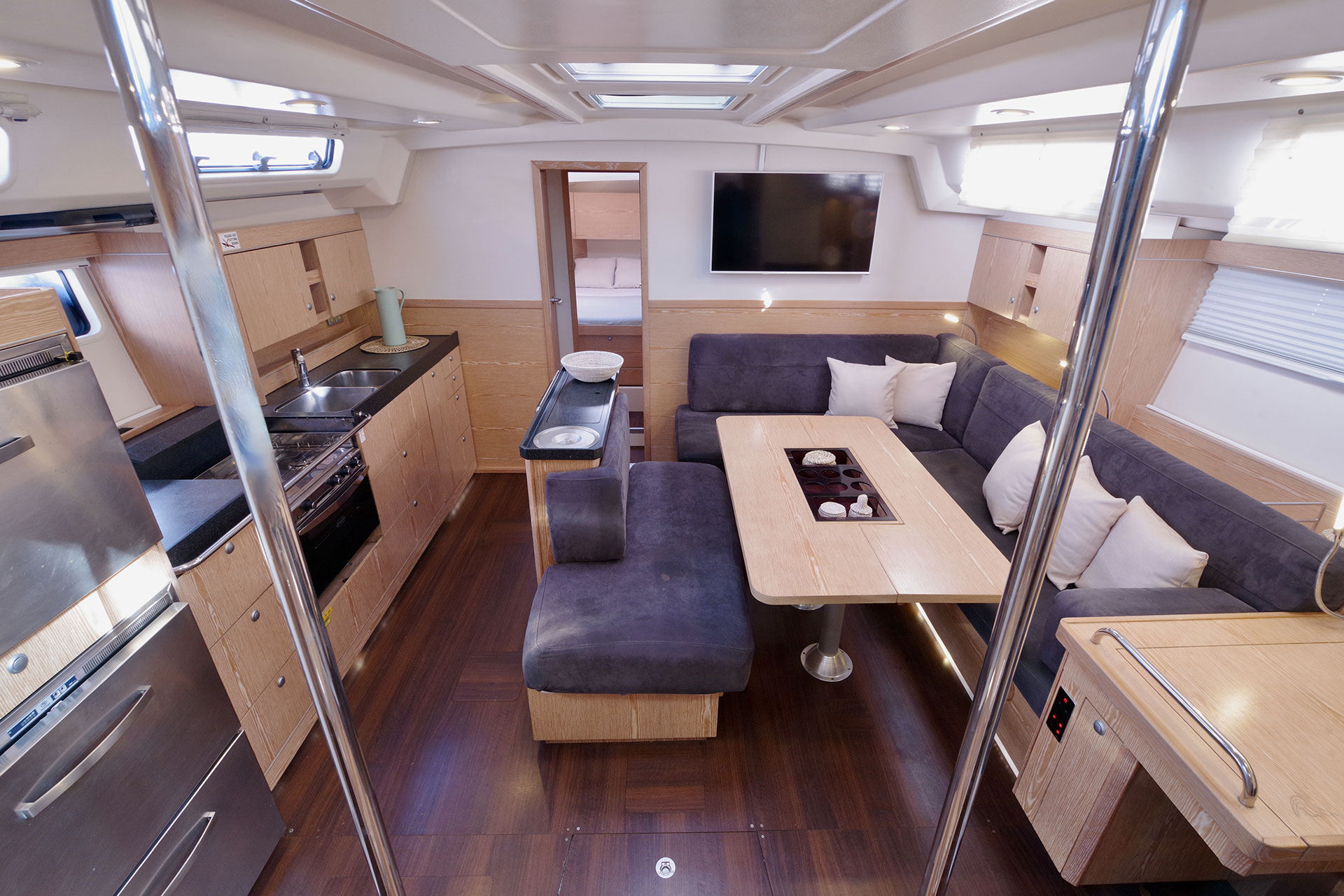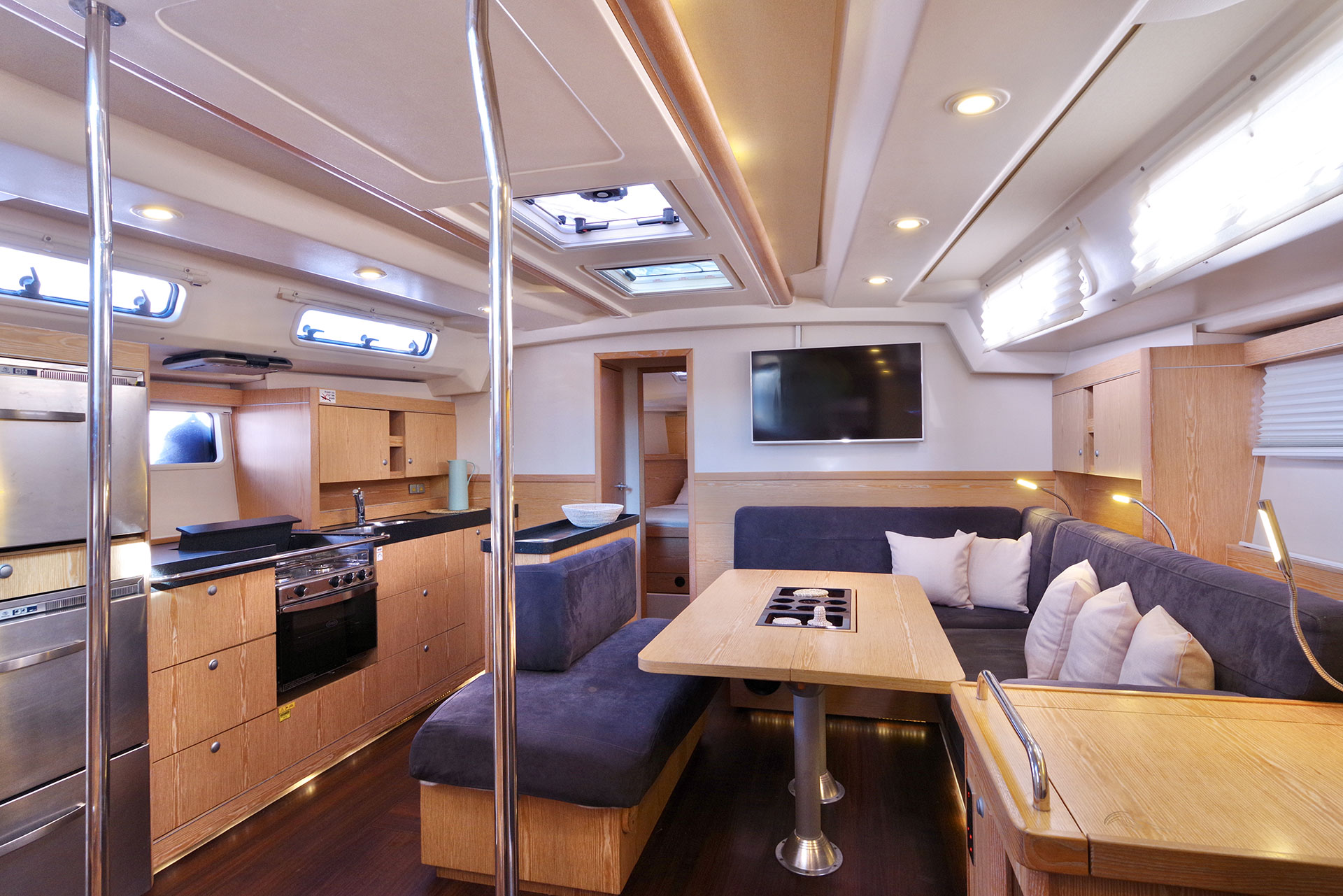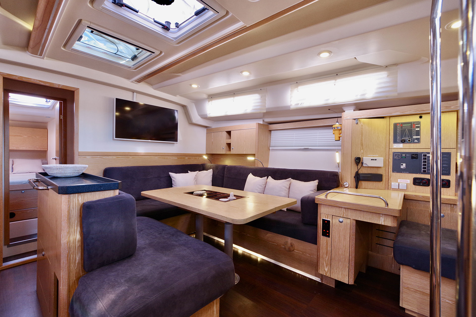 | Outside | Badeplattform, Biminitop, Cockpitdusche, Cockpitpolster, Cockpittisch, Solaranlage, Sprayhood, Teak im Cockpit |
