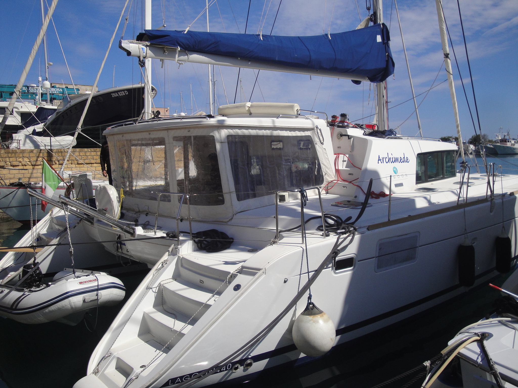 | Outside | Anker mit Kette, Badeleiter, Biminitop, Cockpitdusche, Cockpitlautsprecher, Cockpittisch, Deckbürste, elektr. Ankerwinsch, Fender, Festmacherleinen, Gangway, Kunststoff-Eimer (Pütz), Teak im Cockpit, Treibanker, Wasserschlauch, Windex, Winschen |