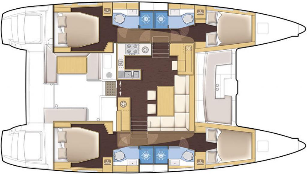 | Inside | Borduhr, CD-Player, Espresso Maschine, Gasherd mit Backofen, Generator, Inverter 12V/220V, Klimaanlage (ohne Landstrombedarf), Kühlschrank, Pantryausstattung, Radio, Ventilatoren in Salon und Kabinen, Warmwasser, Watermaker |