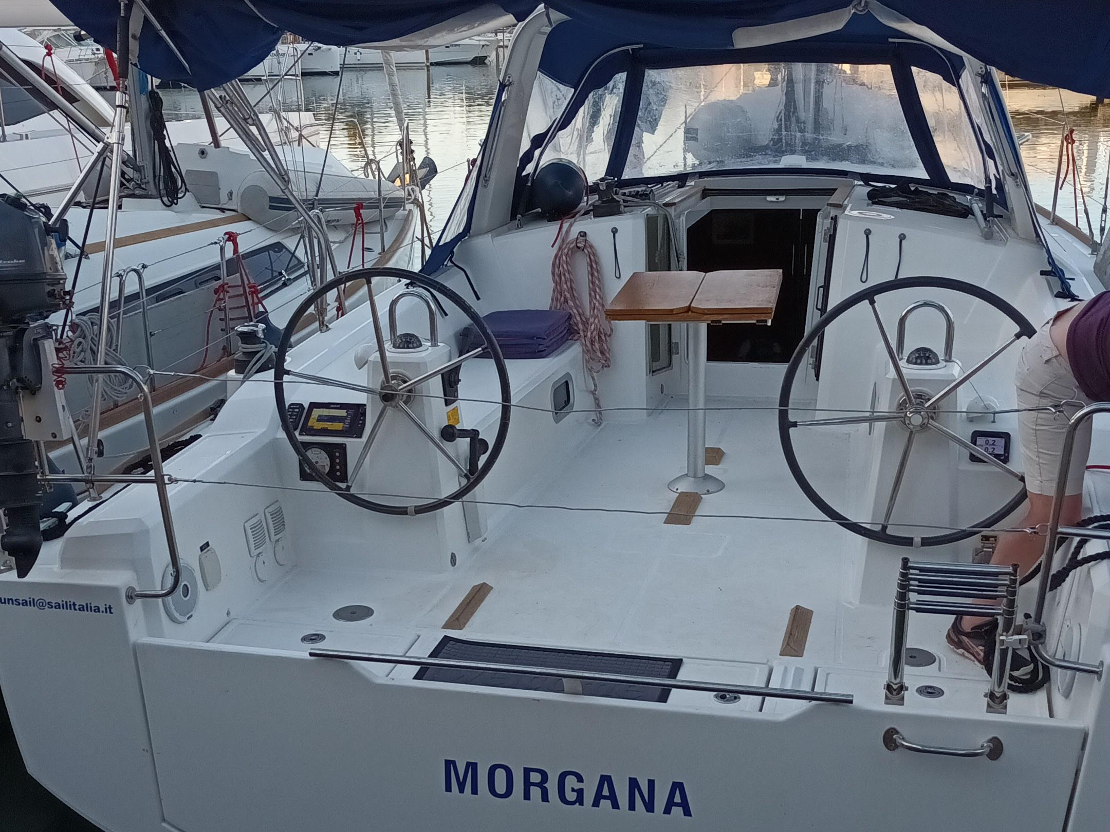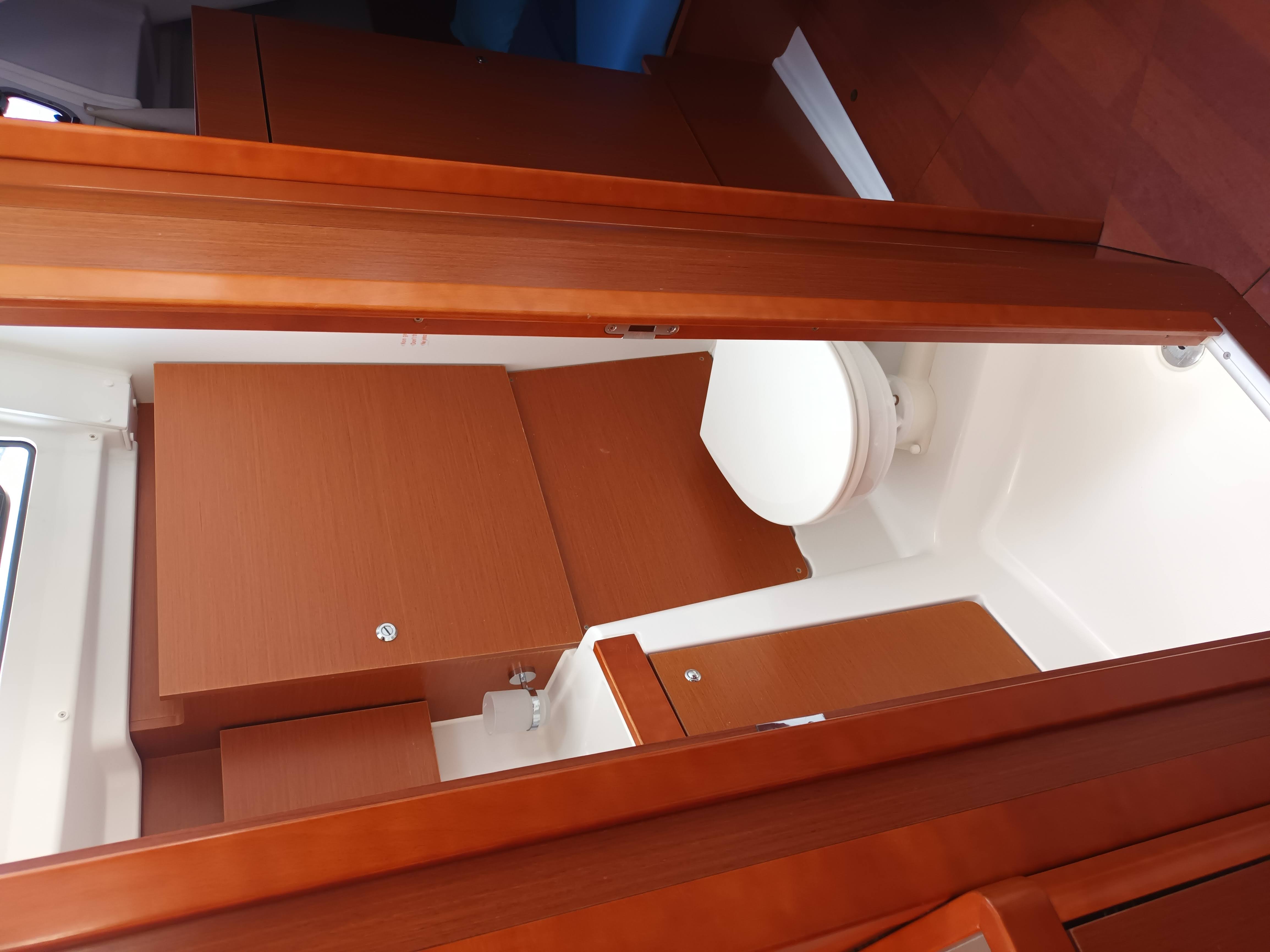 Outside Anker mit Kette, Badeleiter, Biminitop, Bootshaken, Cockpitdusche, Cockpitlautsprecher, Cockpitpolster, Deckbürste, elektr. Ankerwinsch, Fender, Festmacherleinen, Gangway, Kunststoff-Eimer (Pütz), Sprayhood, Wasserschlauch, Winschen