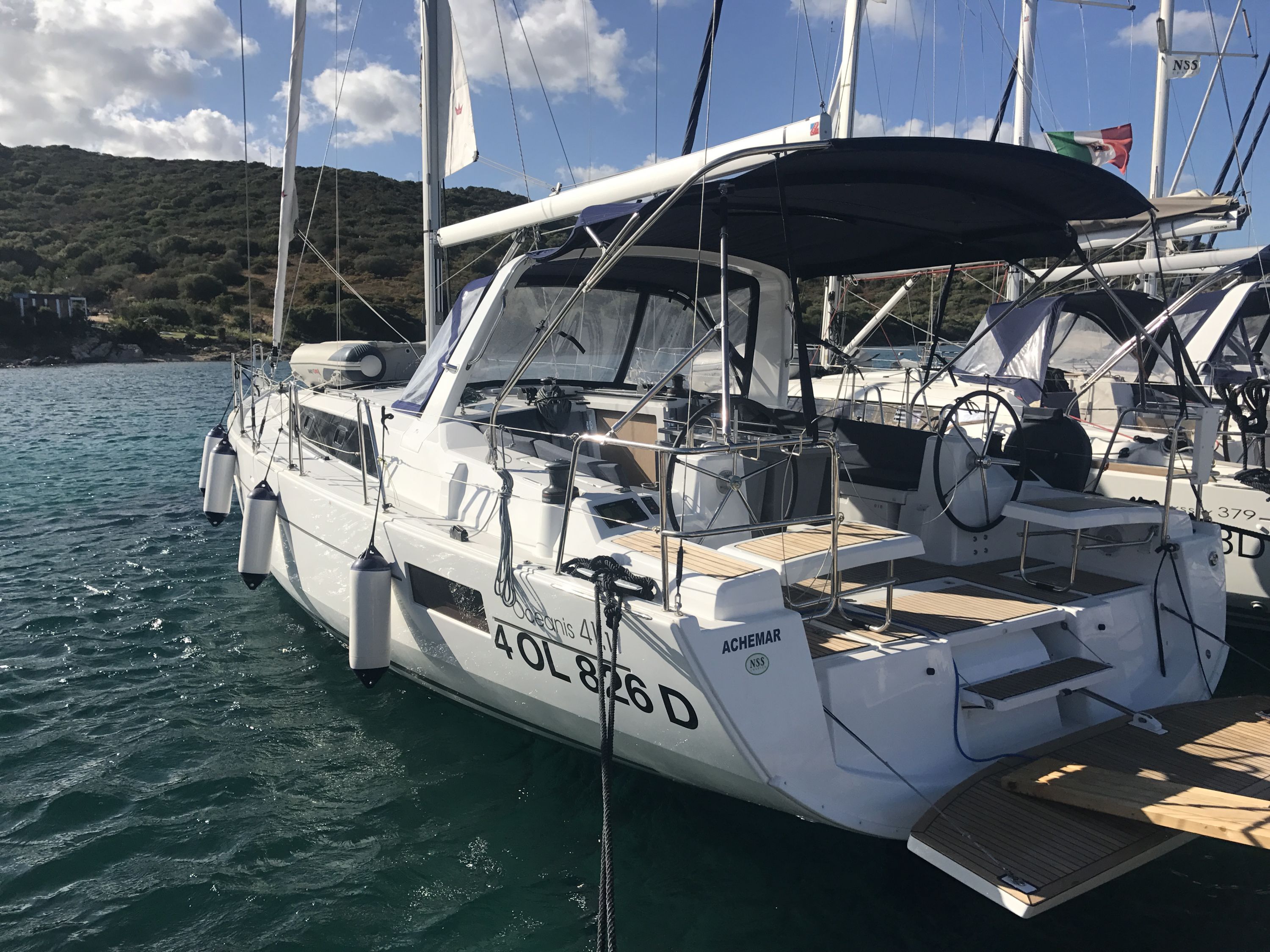 | Outside | Badeplattform, Biminitop, Cockpitdusche, Cockpitlautsprecher, Cockpitpolster, elektr. Ankerwinsch, Sprayhood, Teak im Cockpit |