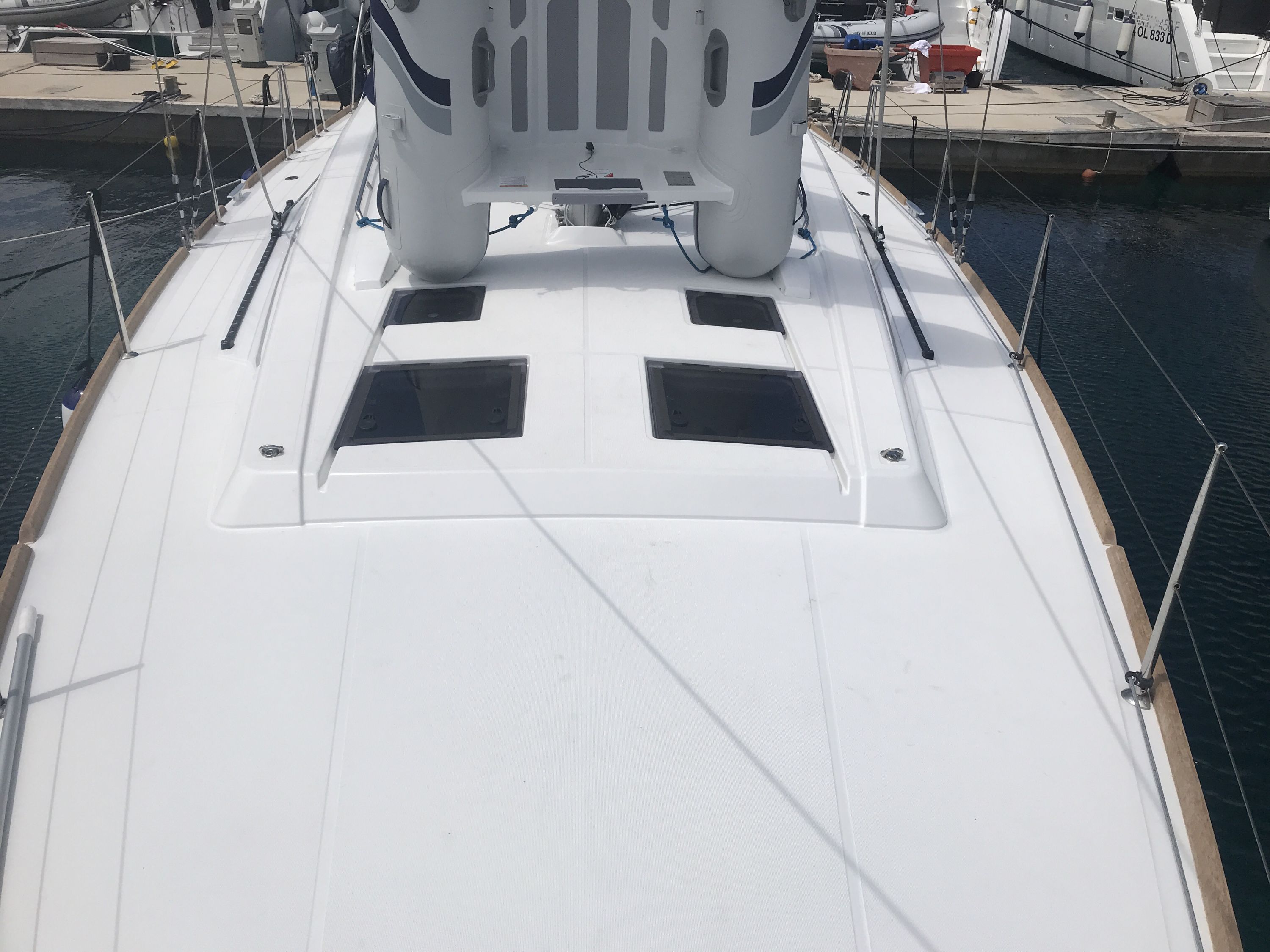 | Outside | Badeplattform, Biminitop, Cockpitdusche, Cockpitkühlschrank, Cockpitlautsprecher, Cockpitpolster, elektr. Ankerwinsch, elektr. Winsch, Sprayhood, Teak im Cockpit, Teakdeck |