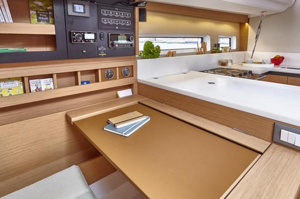 | Inside | 12V Steckdose, Borduhr, CD-Player, Eisbox, Espresso Maschine, Fäkalientank, Frischwasserpumpe, Gasherd mit Backofen, Klimaanlage (Landstrom), Kühlschrank, Landstromkabel, Pantryausstattung, Radio, Radio mit CD und MP3, Salontisch absenkbar, Spüle mit 2 Becken, Trichter, USB Steckdosen in den Kabinen, Ventilatoren in Salon und Kabinen, Warmwasser |