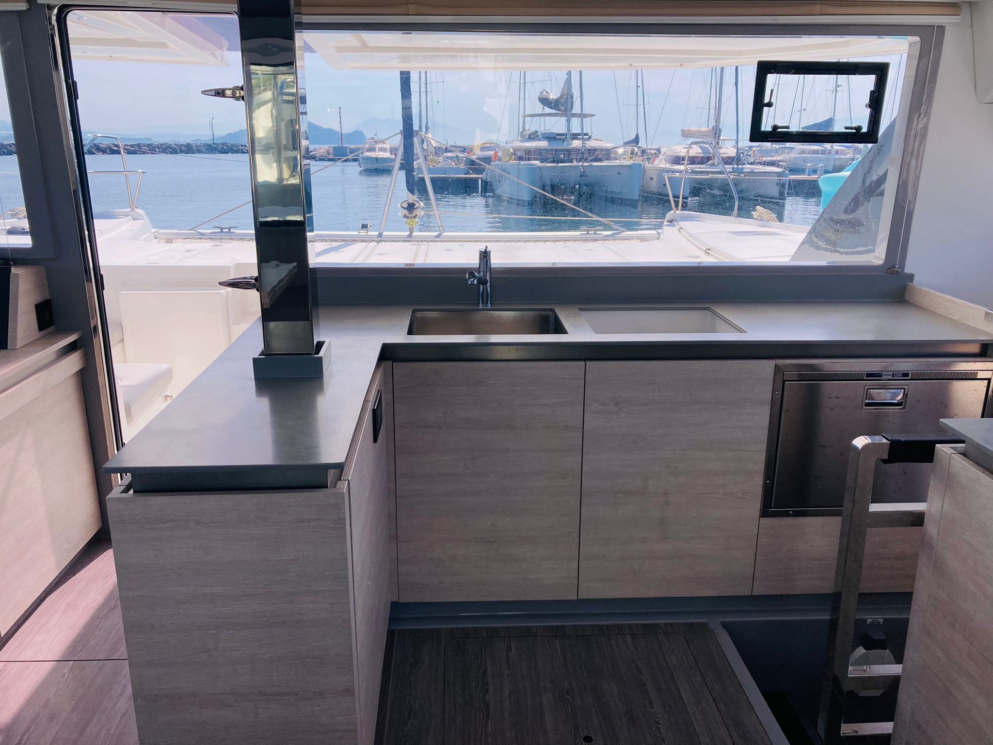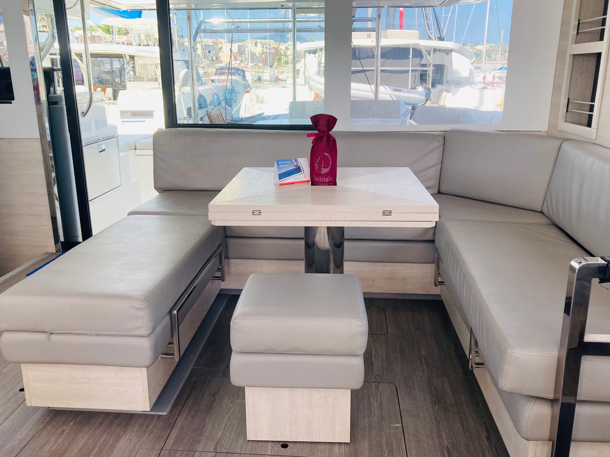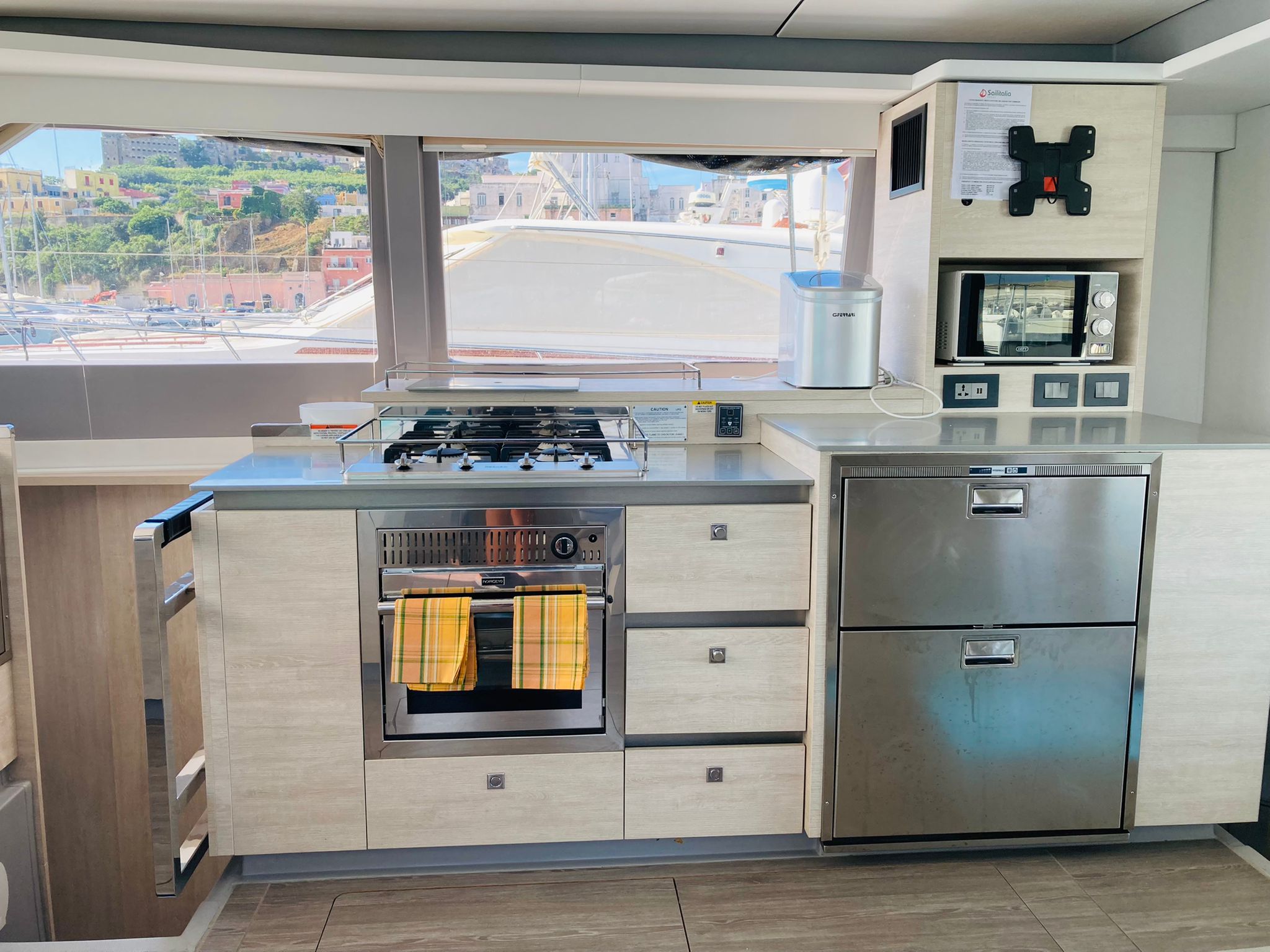| Inside | Borduhr, CD-Player, Gasherd mit Backofen, Generator, Inverter 12V/220V, Kaffeemaschine, Klimaanlage (ohne Landstrombedarf), Kühlschrank, Pantryausstattung, Salontisch absenkbar, Trichter, Warmwasser, Watermaker |