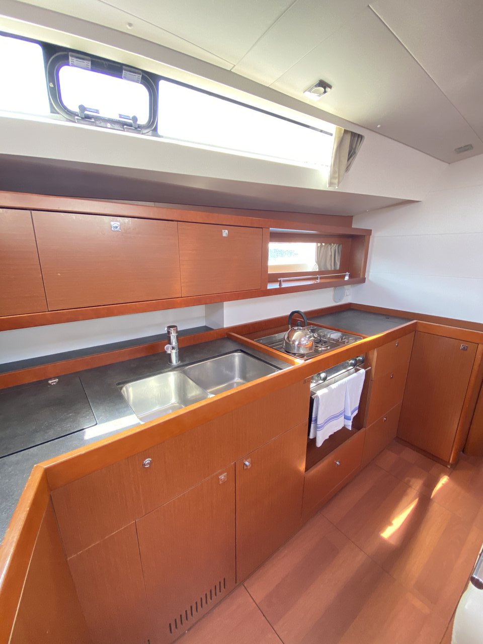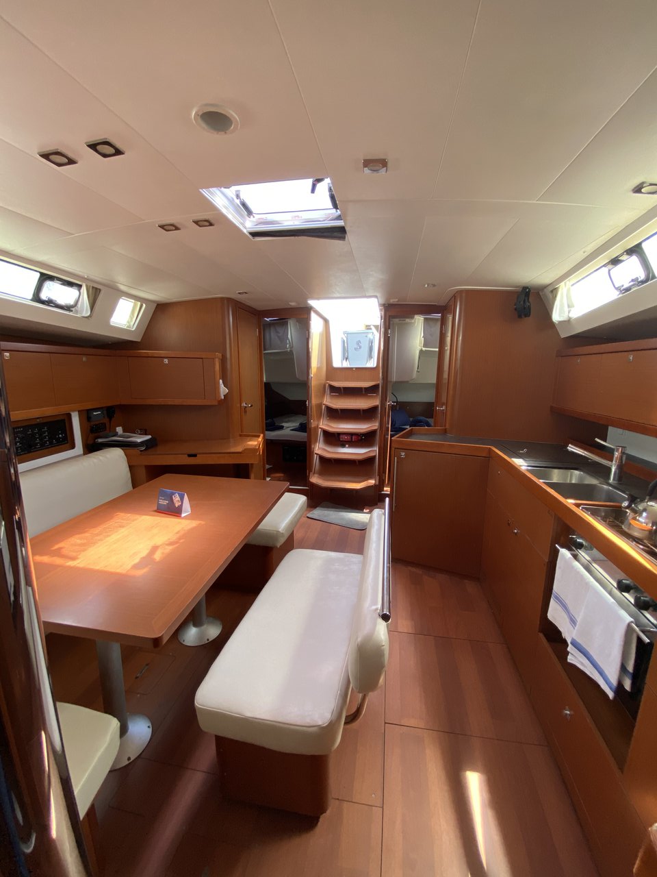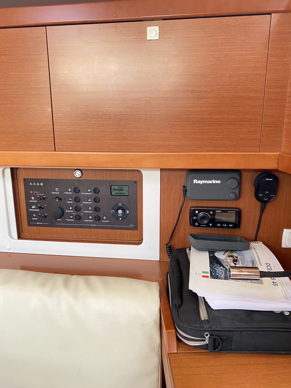 | Navigation | Barometer, Echolot, Fernglas, GPS mit Kartenplotter im Cockpit, Hafenhandbücher, Handpeilkompass, Kompass, Sumlog, Windmesser |