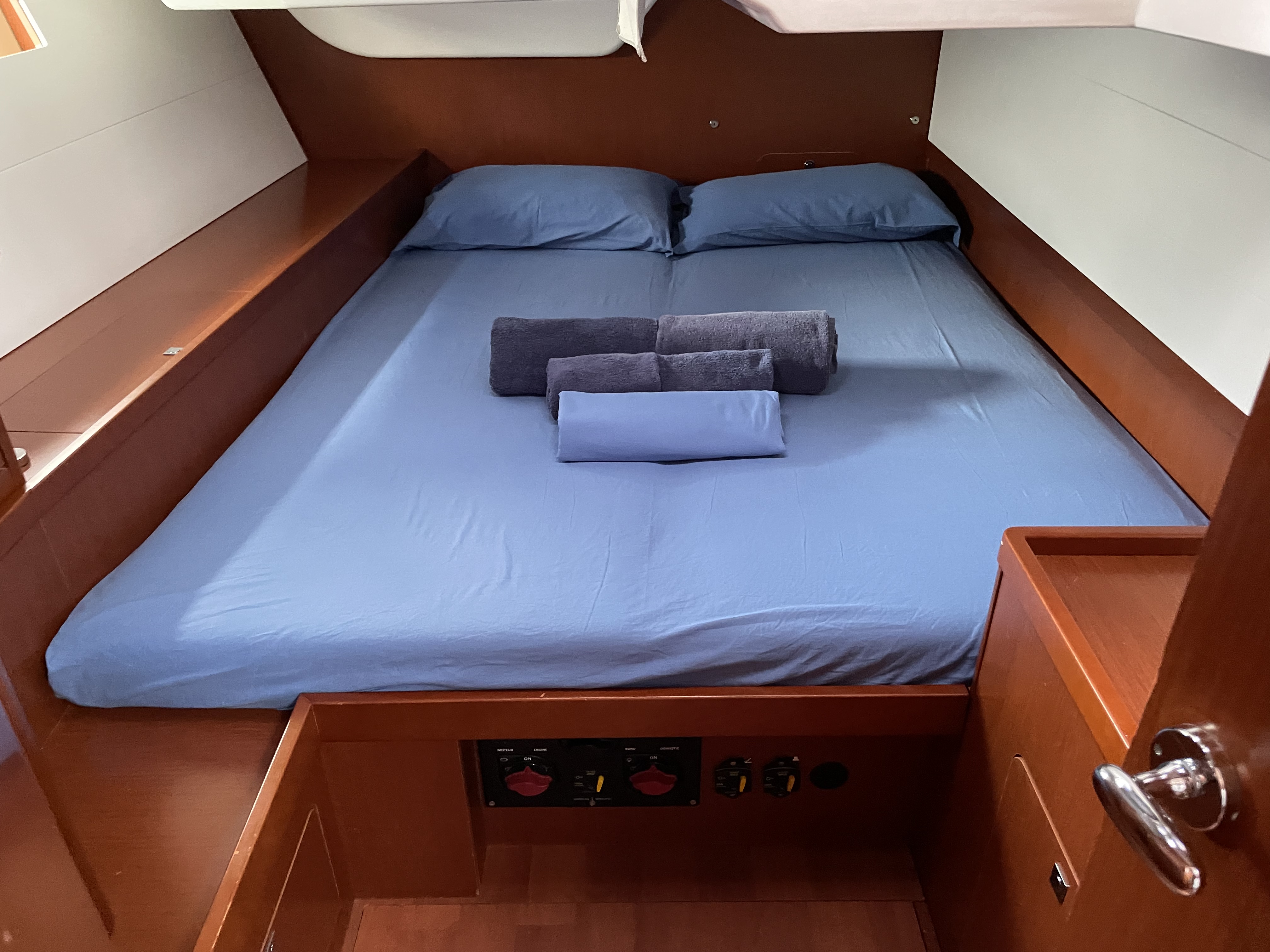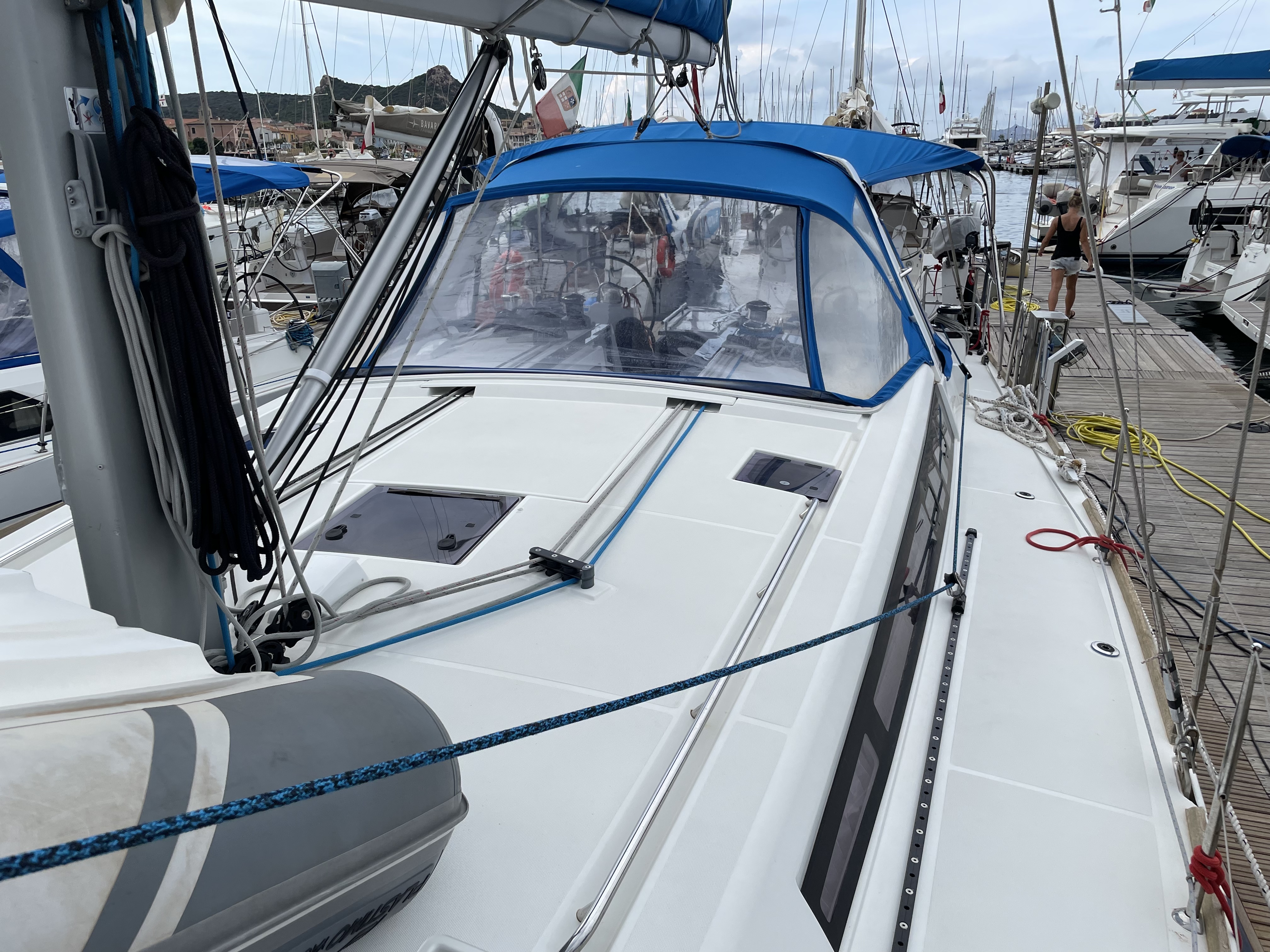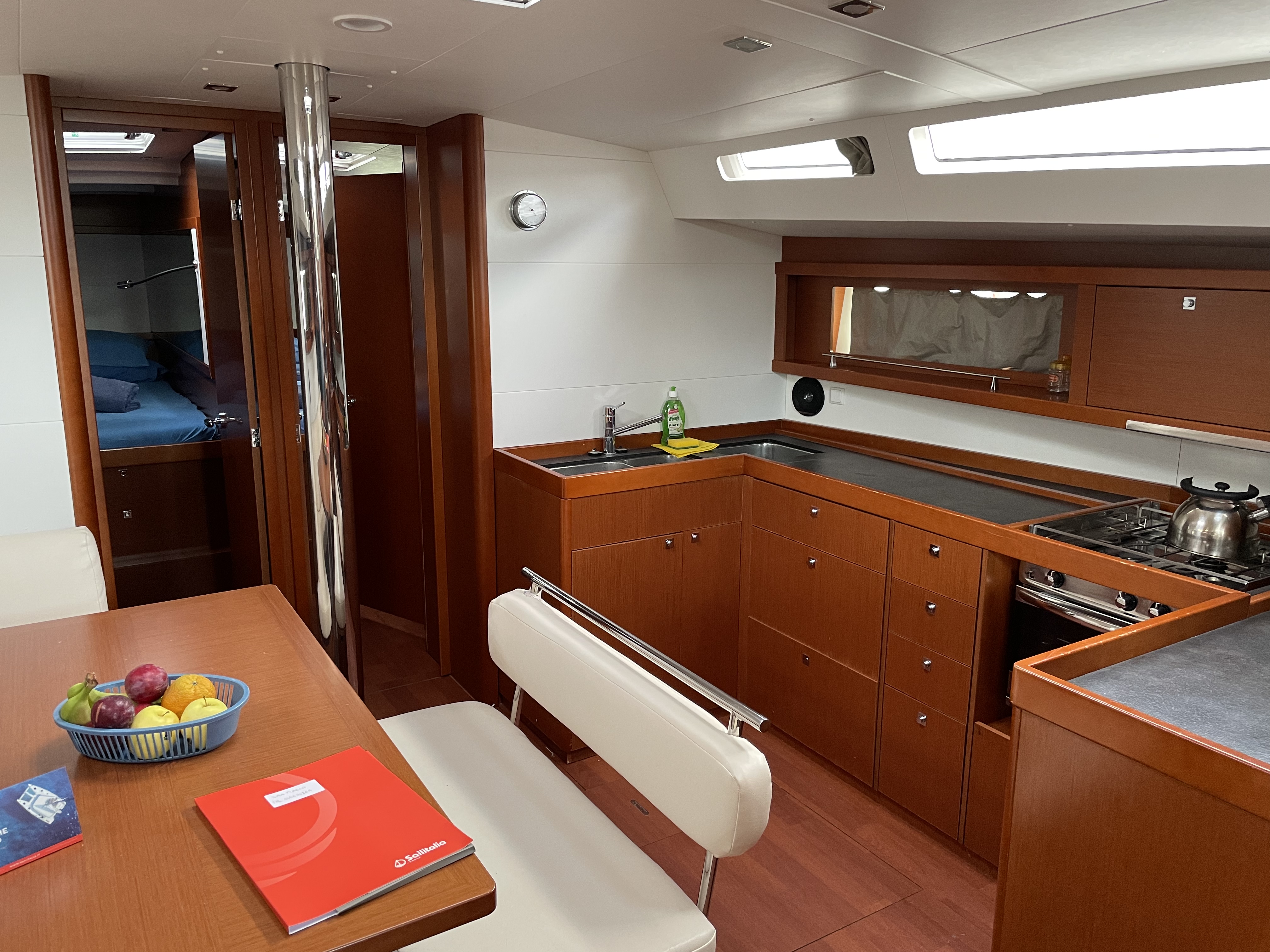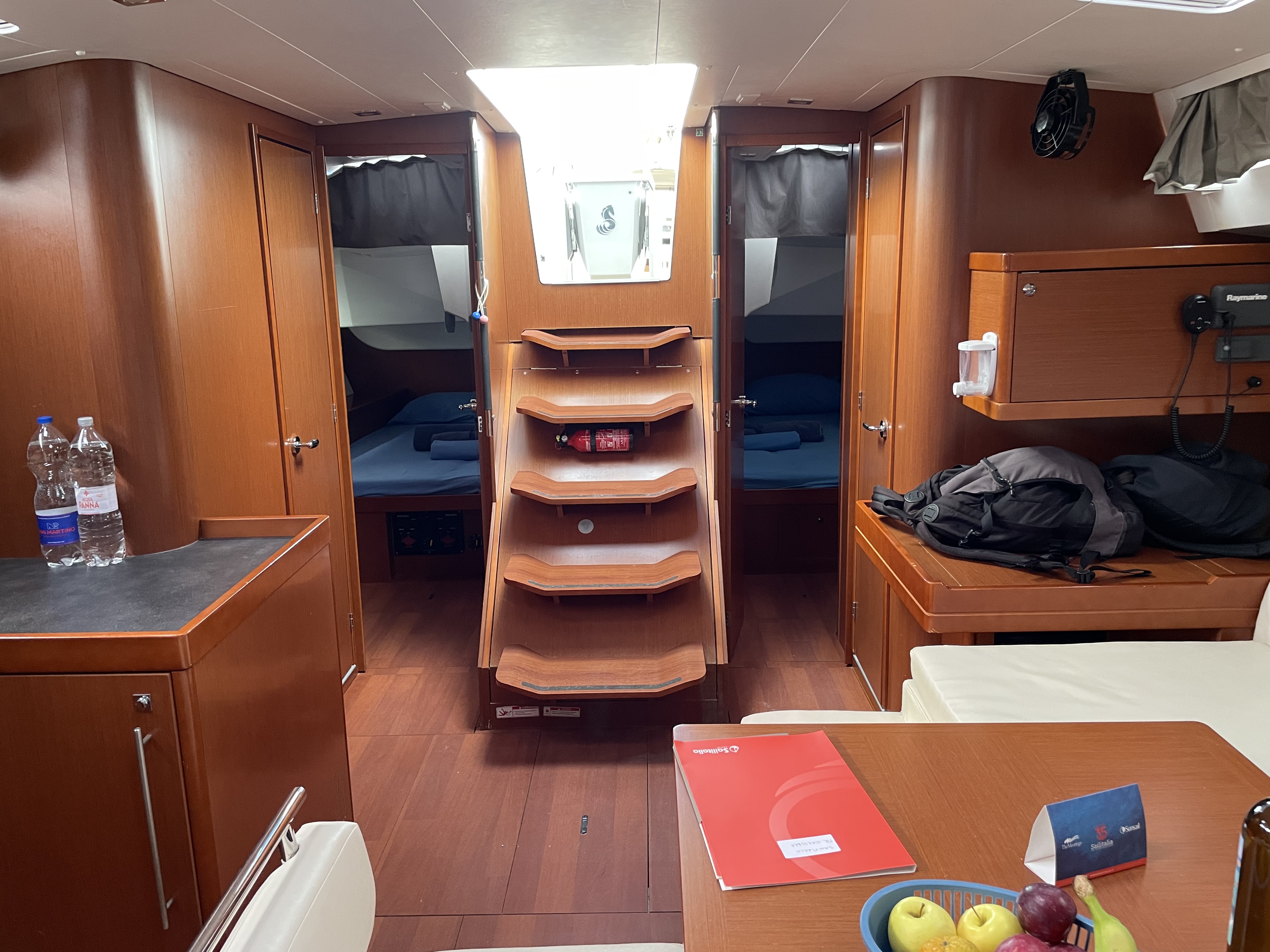 Das Team vor Ort ist freundlich und ausgesprochen hilfsbereit. Ungefragt gab es Unterstützung beim Auslaufen und der Rückkehr. Die Yacht ist für eine ältere Charteryacht in einem technisch sehr guten Zustand - klar hat es überall "Gebrauchsspuren". Segel und laufendes Gut waren einwandfrei, wir konnten auch gut Höhe laufen. Lediglich der Stopper vom Großfall rutscht, auch ein Umlegen auf das benachbarten freien Stopper brachte keine Abhilfe, so daß wir das Großfall auf der Winsch lassen mussten. Die leistungsstarken Batterien erlaubten uns zwei aufeinander folgende Übernachtungen vor Anker, ohne den Motor extra zum Laden laufen zu lassen.