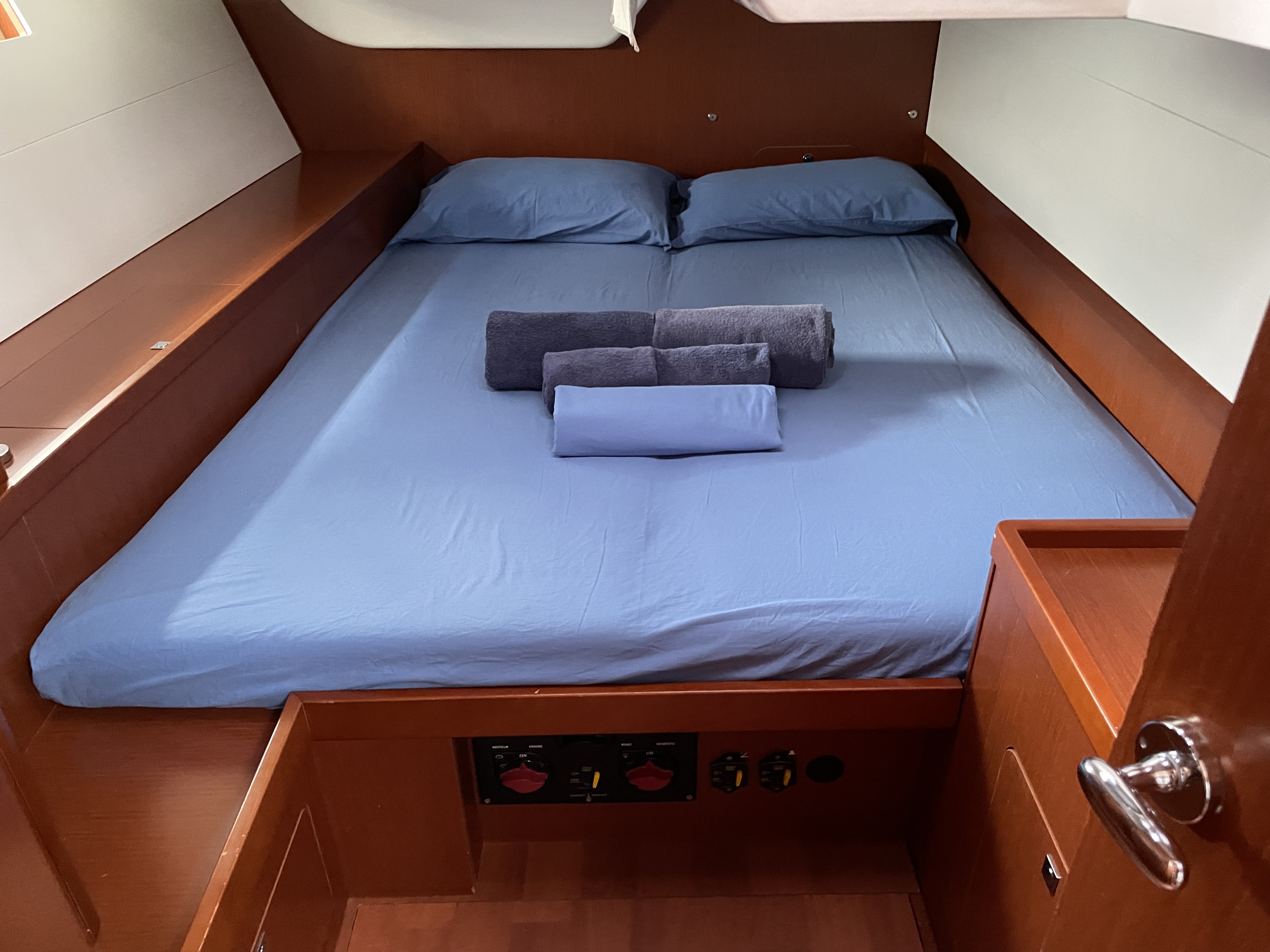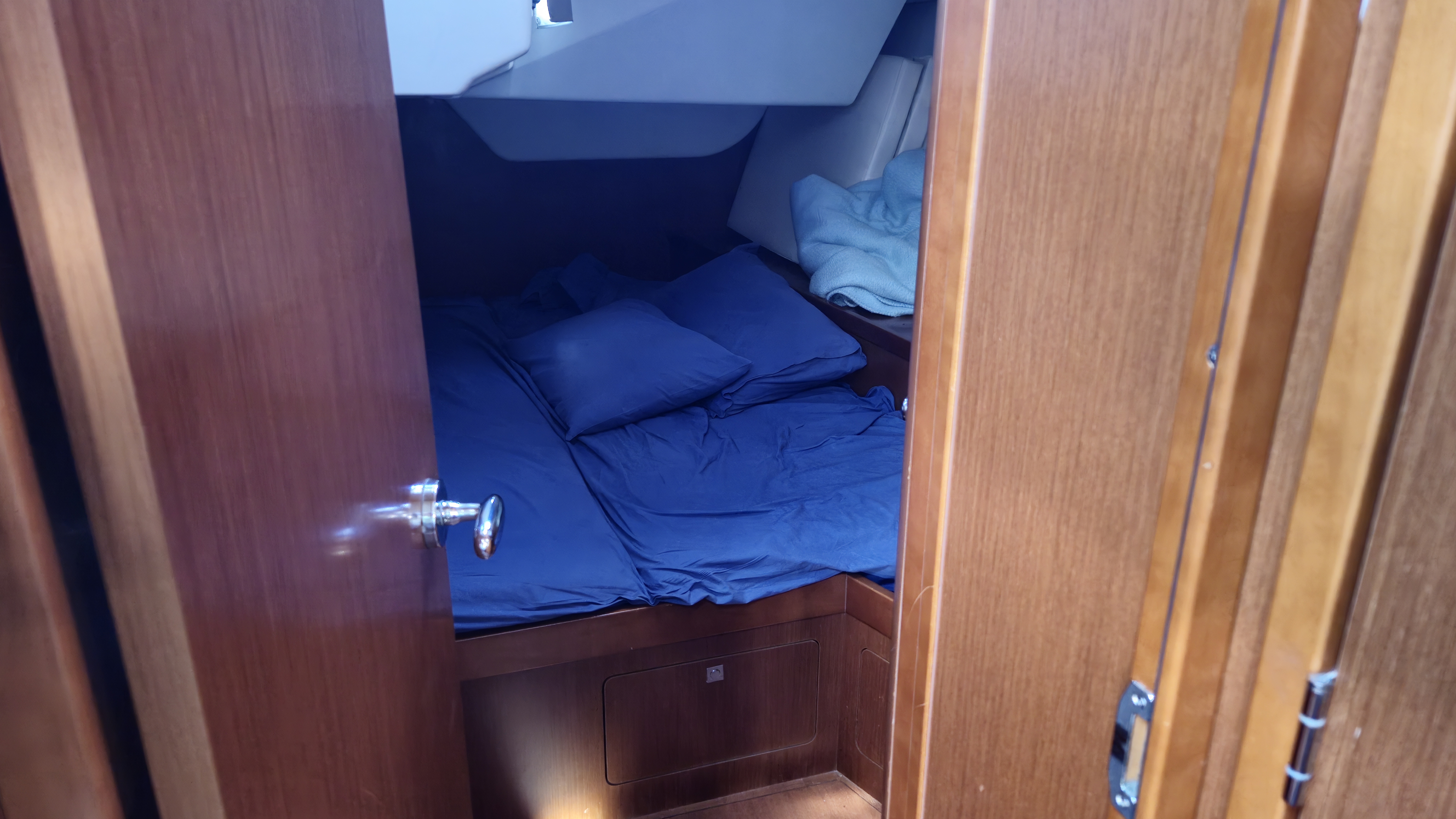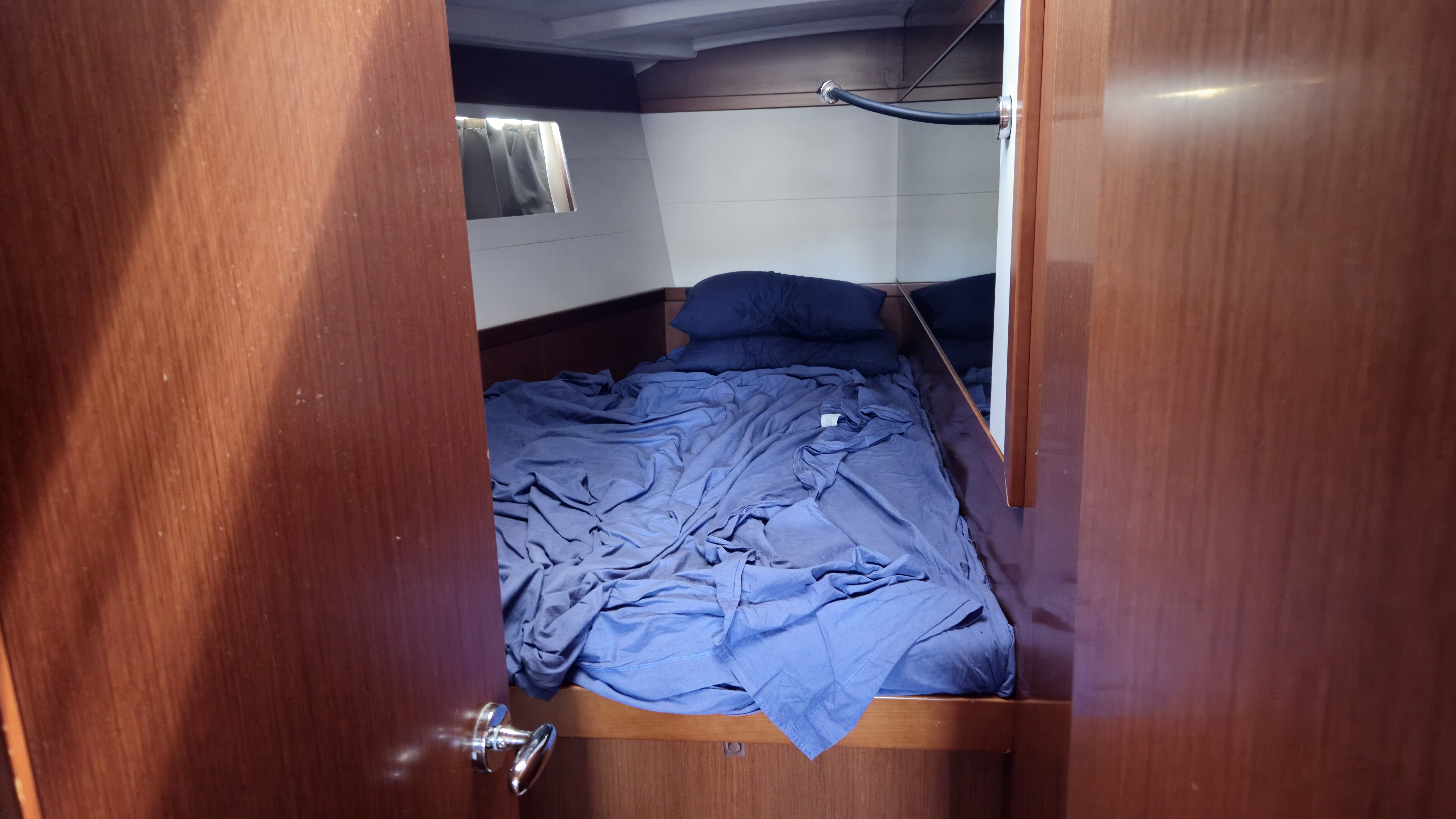 Das Team vor Ort ist freundlich und ausgesprochen hilfsbereit. Ungefragt gab es Unterstützung beim Auslaufen und der Rückkehr. Die Yacht ist für eine ältere Charteryacht in einem technisch sehr guten Zustand - klar hat es überall "Gebrauchsspuren". Segel und laufendes Gut waren einwandfrei, wir konnten auch gut Höhe laufen. Lediglich der Stopper vom Großfall rutscht, auch ein Umlegen auf das benachbarten freien Stopper brachte keine Abhilfe, so daß wir das Großfall auf der Winsch lassen mussten. Die leistungsstarken Batterien erlaubten uns zwei aufeinander folgende Übernachtungen vor Anker, ohne den Motor extra zum Laden laufen zu lassen.