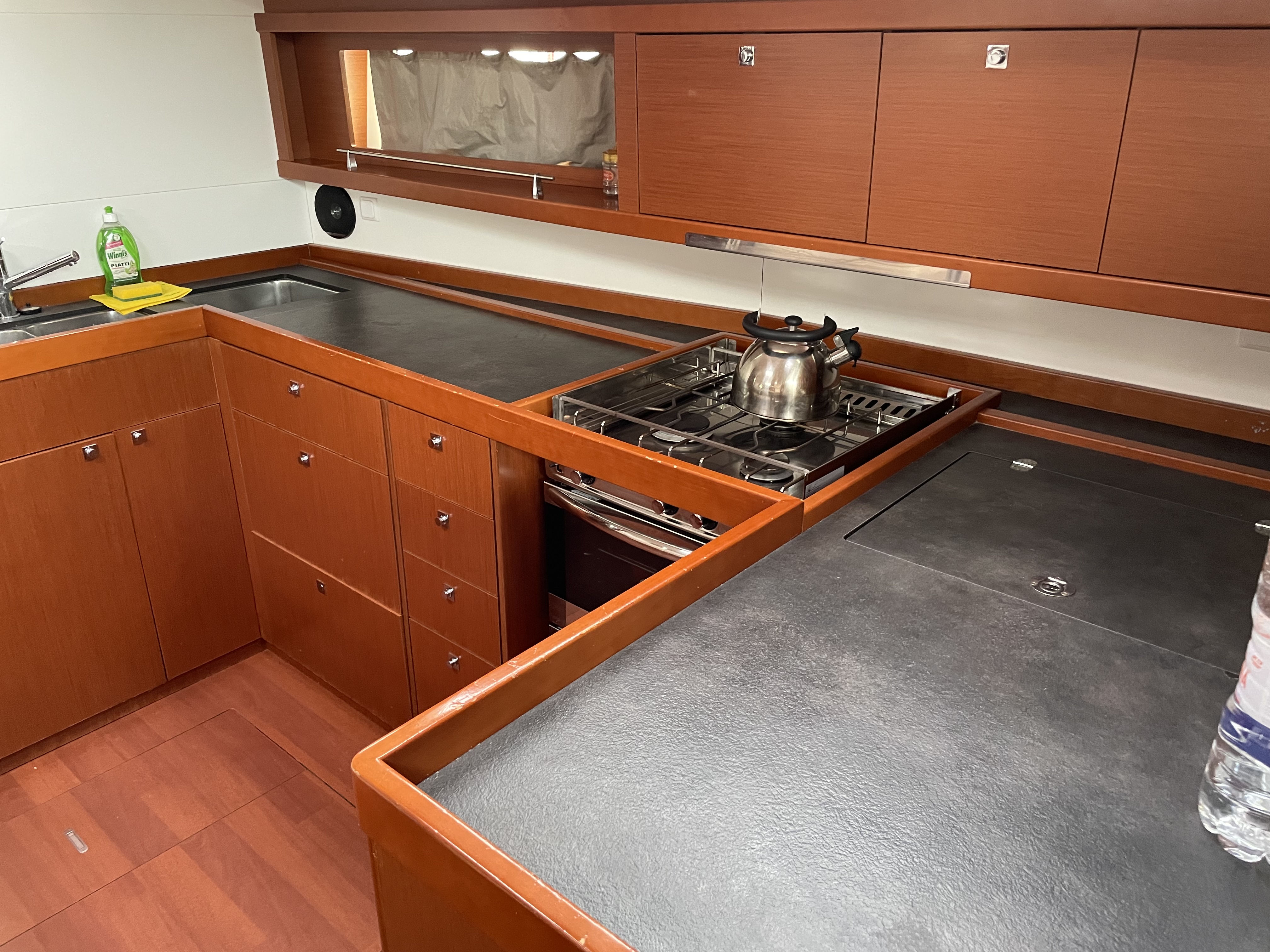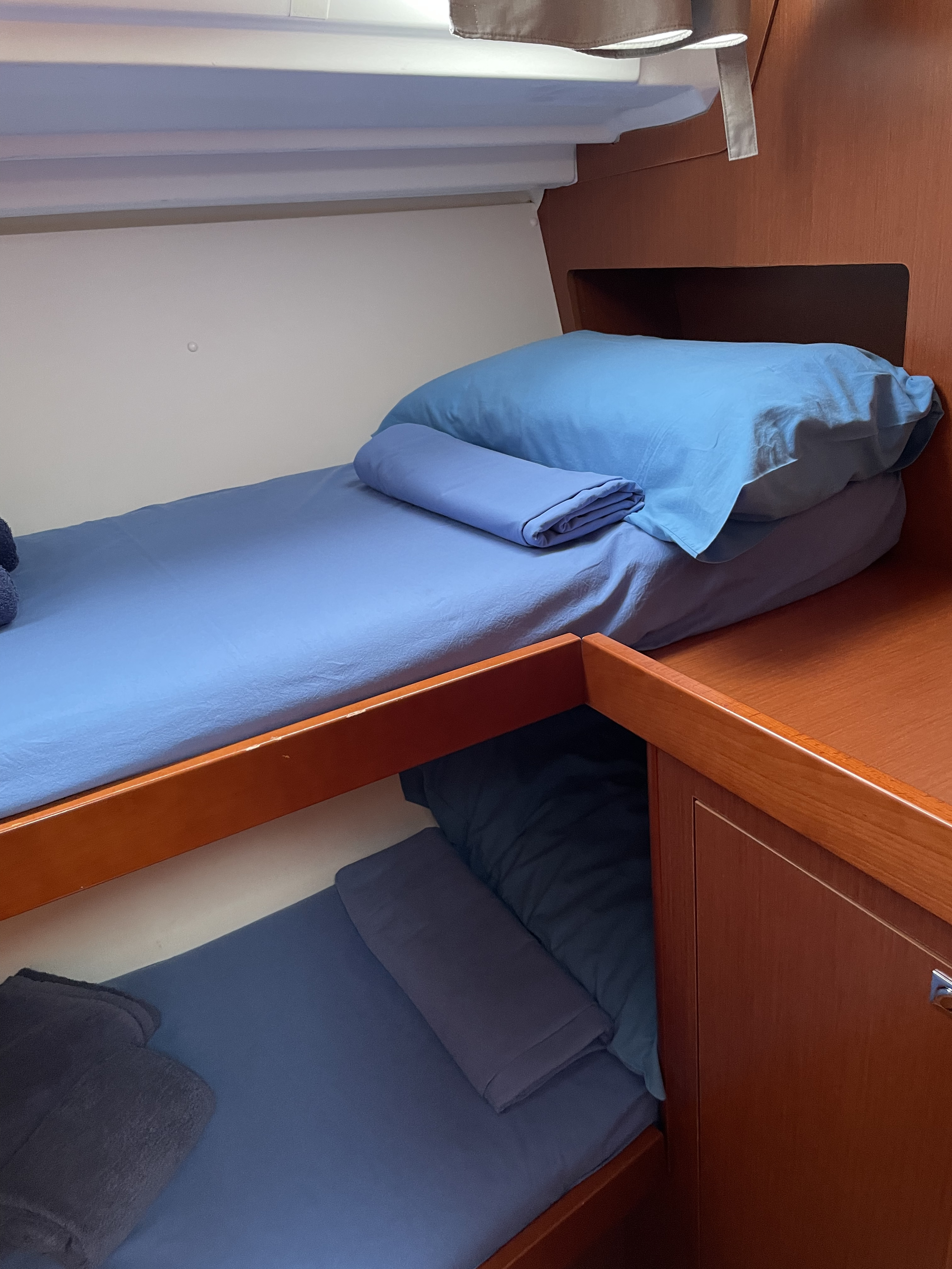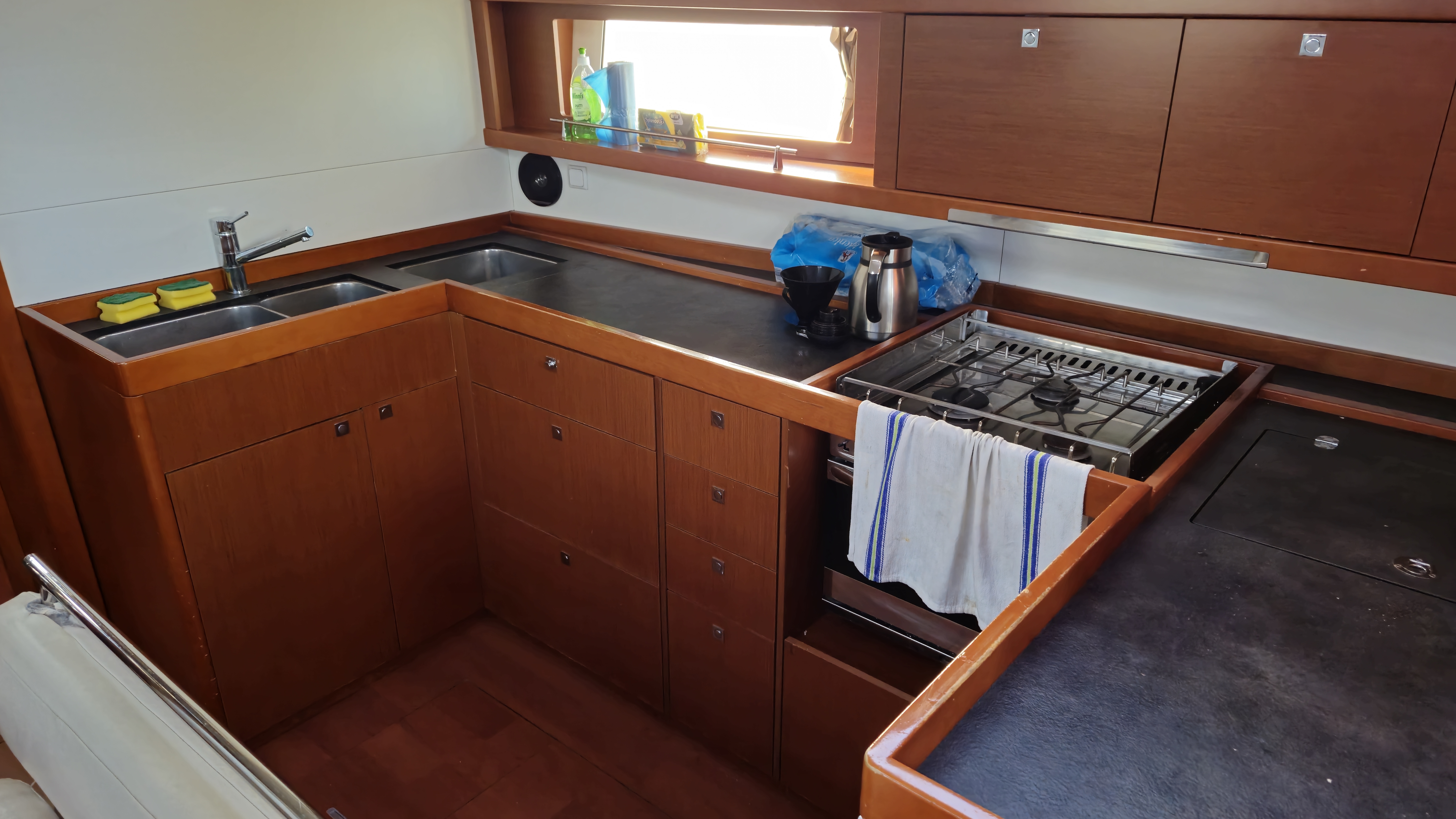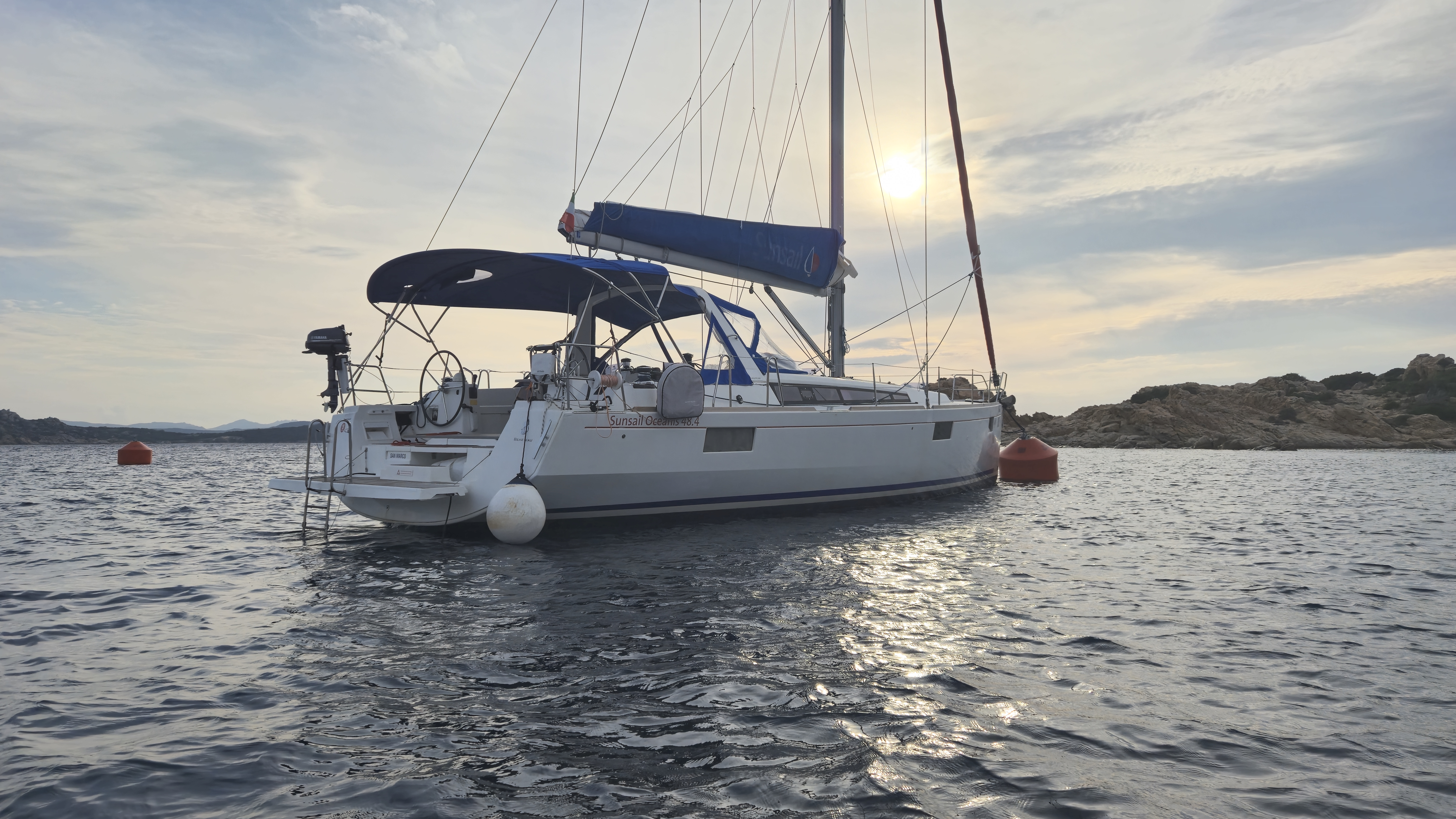 Das Team vor Ort ist freundlich und ausgesprochen hilfsbereit. Ungefragt gab es Unterstützung beim Auslaufen und der Rückkehr. Die Yacht ist für eine ältere Charteryacht in einem technisch sehr guten Zustand - klar hat es überall "Gebrauchsspuren". Segel und laufendes Gut waren einwandfrei, wir konnten auch gut Höhe laufen. Lediglich der Stopper vom Großfall rutscht, auch ein Umlegen auf das benachbarten freien Stopper brachte keine Abhilfe, so daß wir das Großfall auf der Winsch lassen mussten. Die leistungsstarken Batterien erlaubten uns zwei aufeinander folgende Übernachtungen vor Anker, ohne den Motor extra zum Laden laufen zu lassen.