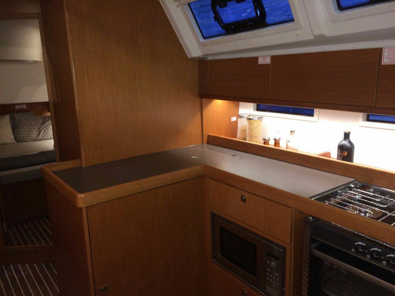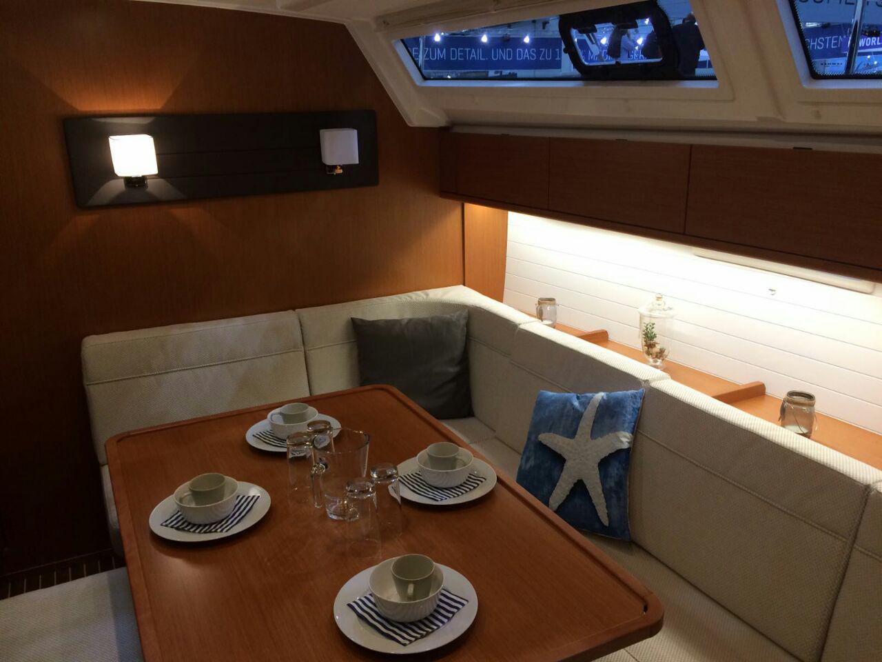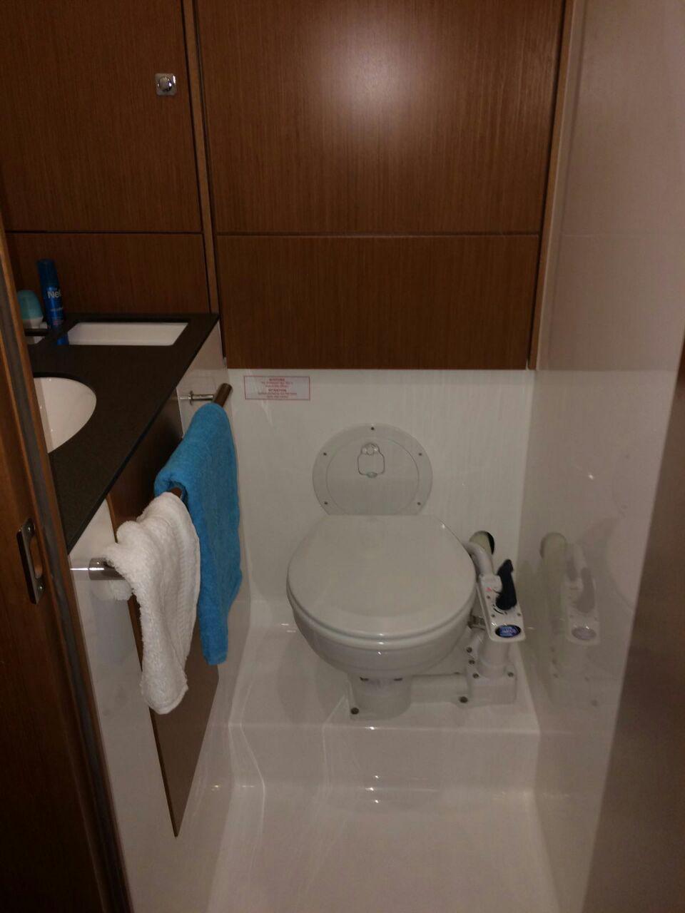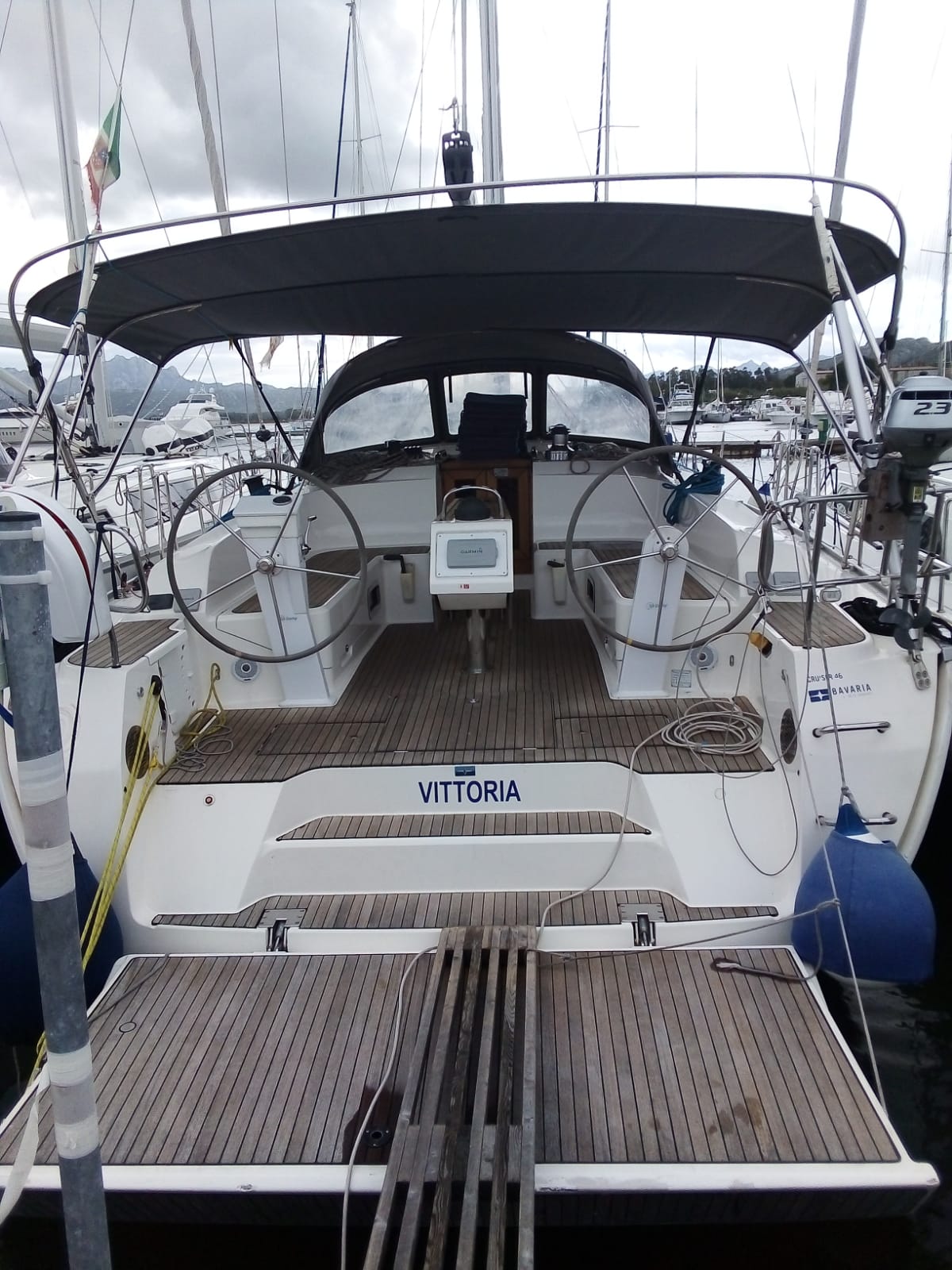 | Outside | Badeleiter, Biminitop, Bootshaken, Cockpitdusche, Cockpittisch, Deckbürste, elektr. Ankerwinsch, Festmacherleinen, Gangway, Kunststoff-Eimer (Pütz), Sprayhood, Teak im Cockpit, Wasserschlauch, Winschen |