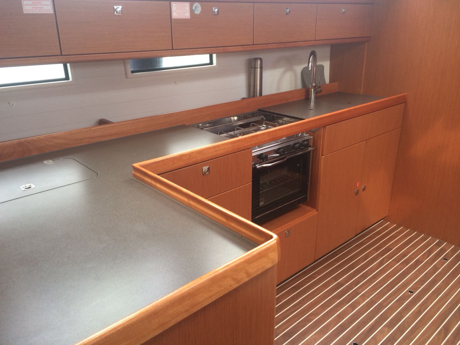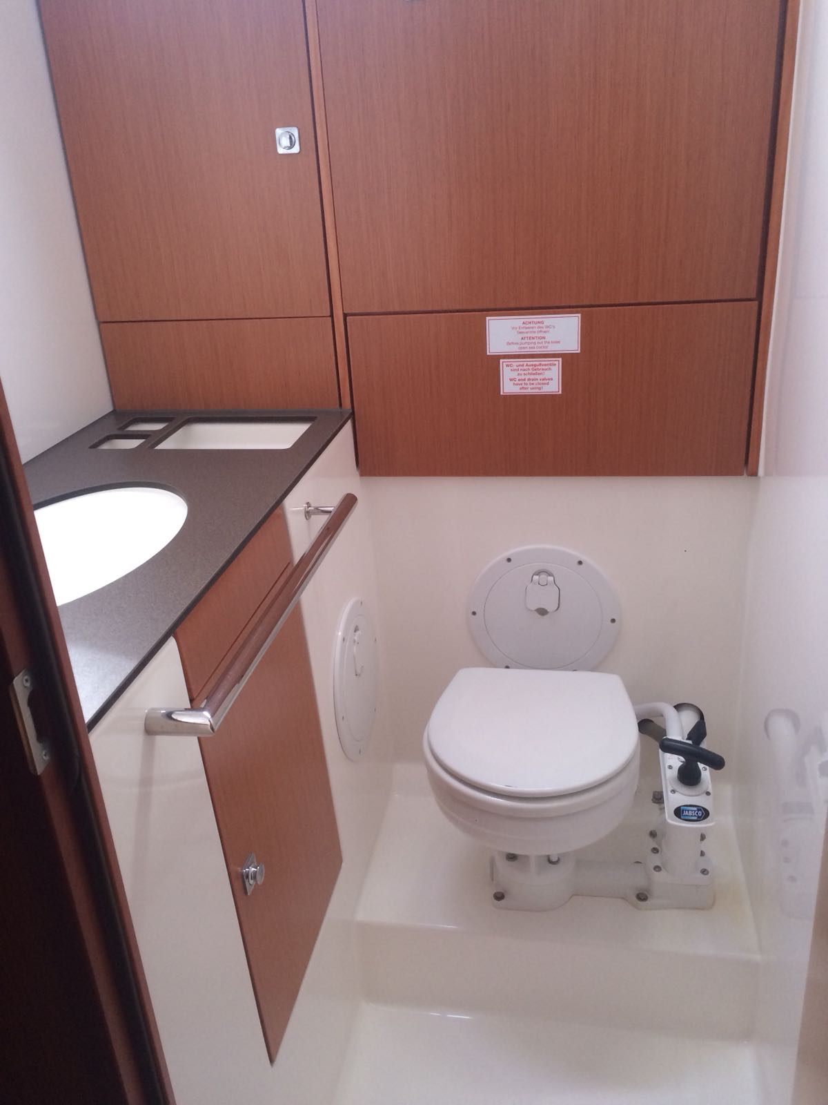 | Outside | 220 V-Landanschluss, Badeleiter, Biminitop, Bootshaken, Cockpitdusche, Cockpitlautsprecher, Cockpittisch, Deckbürste, elektr. Ankerwinsch, Festmacherleinen, Gangway, Kunststoff-Eimer (Pütz), Sprayhood, Teak im Cockpit, Treibanker, Wasserschlauch, Windex, Winschen |