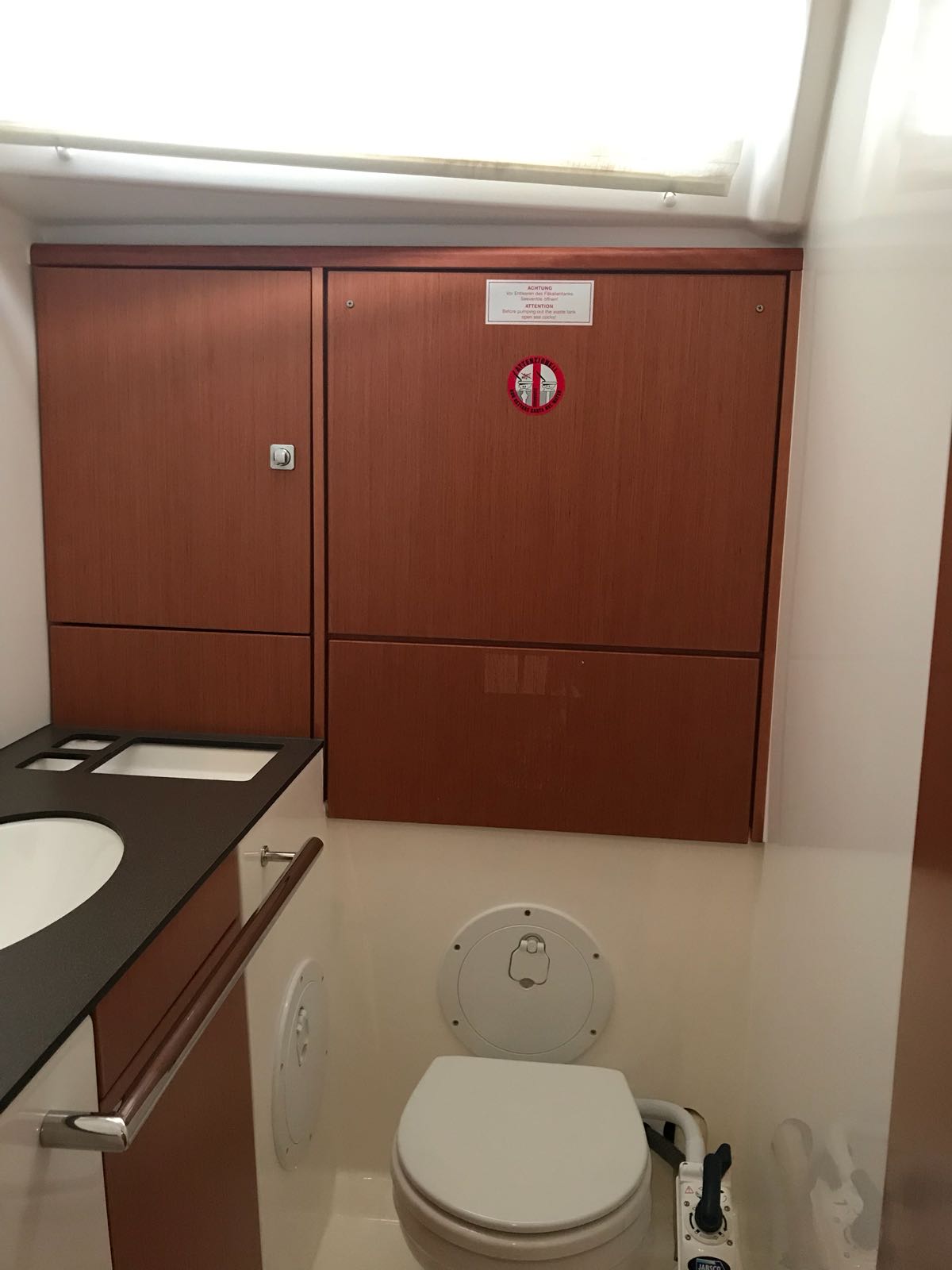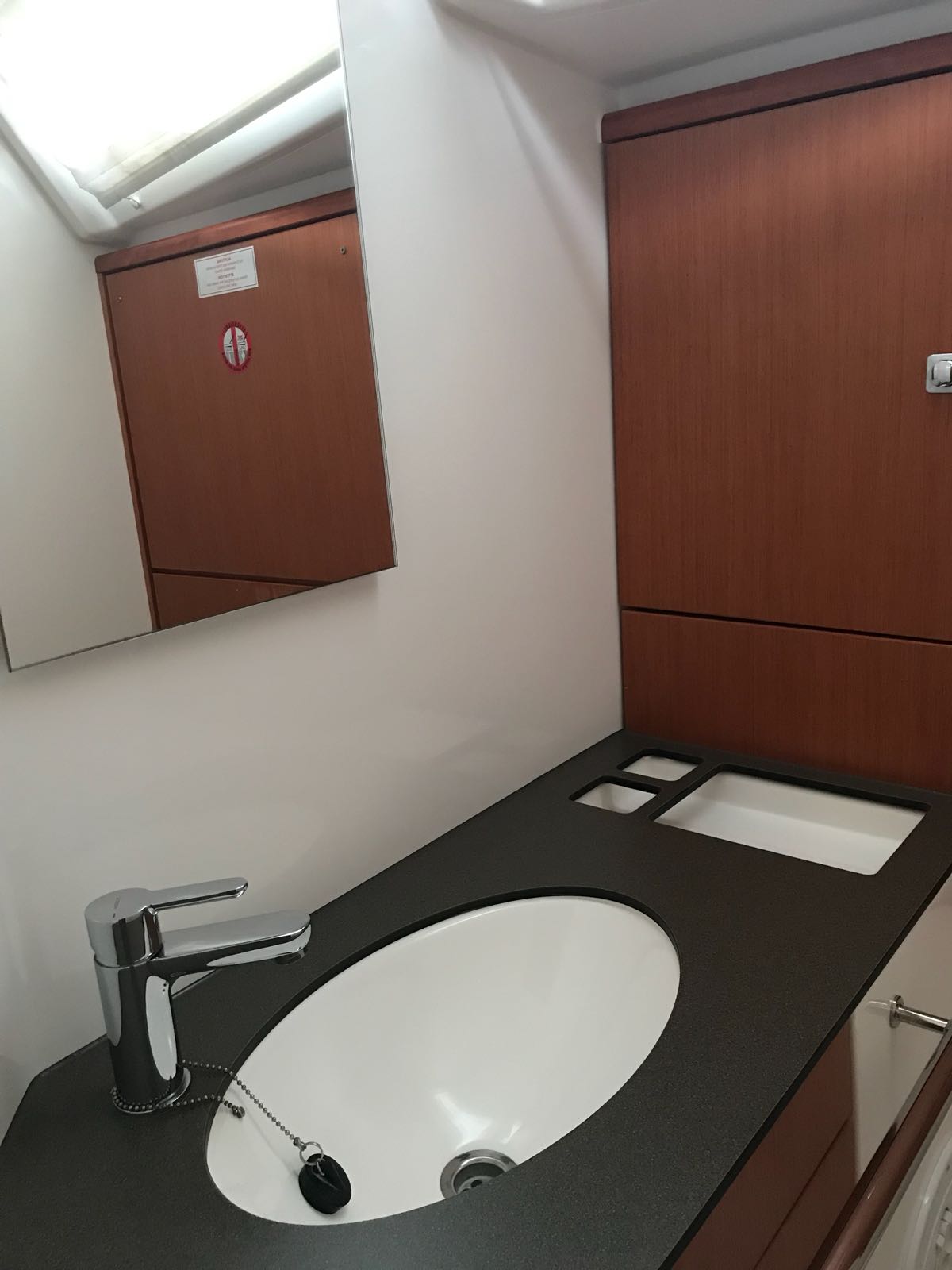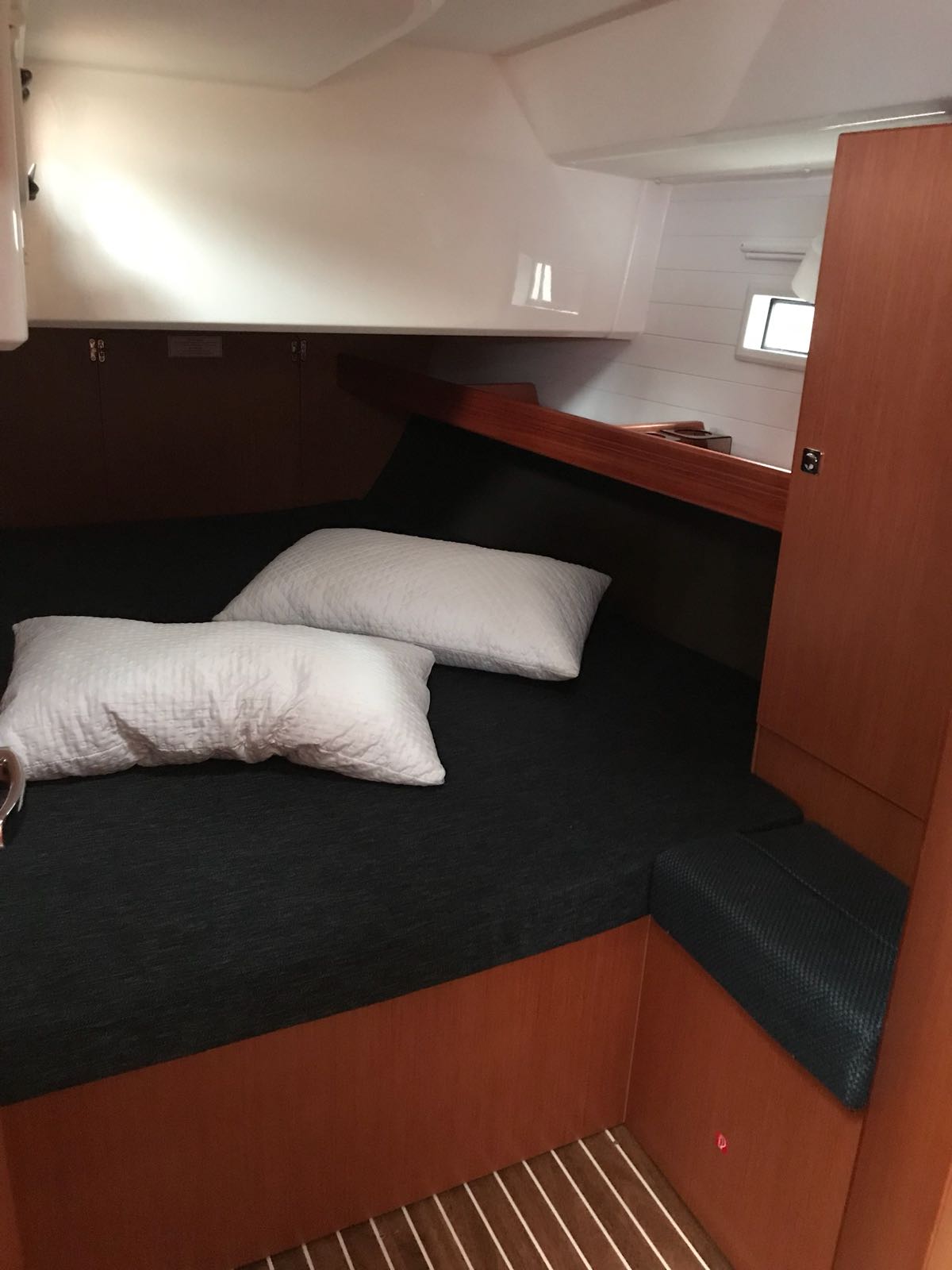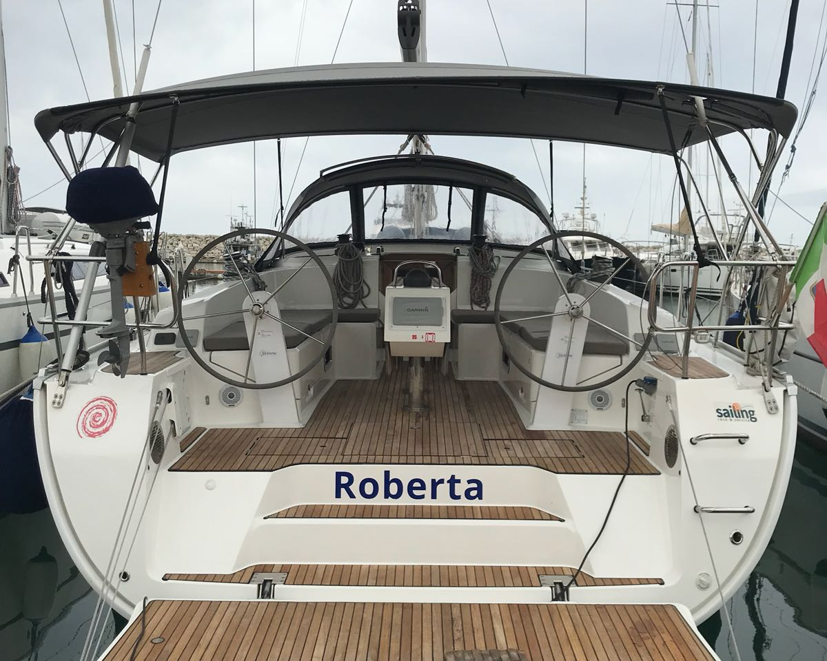 | Outside | Badeleiter, Biminitop, Bootshaken, Cockpitdusche, Cockpittisch, Deckbürste, elektr. Ankerwinsch, Festmacherleinen, Gangway, Kunststoff-Eimer (Pütz), Sprayhood, Teak im Cockpit, Wasserschlauch, Winschen |