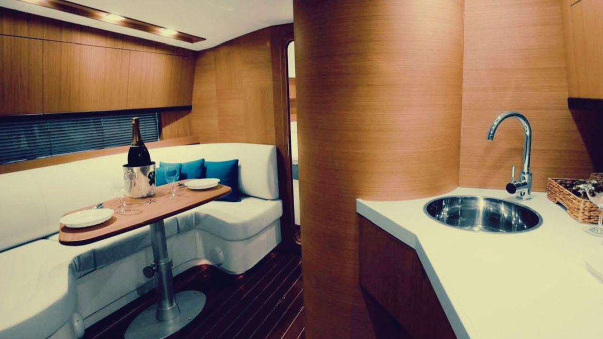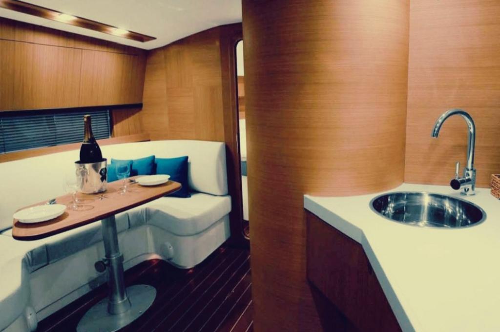 | Outside | Anker mit Kette, Cockpitkühlschrank, Cockpitpolster, Fender, Gangway, Grill, Teakdeck |
