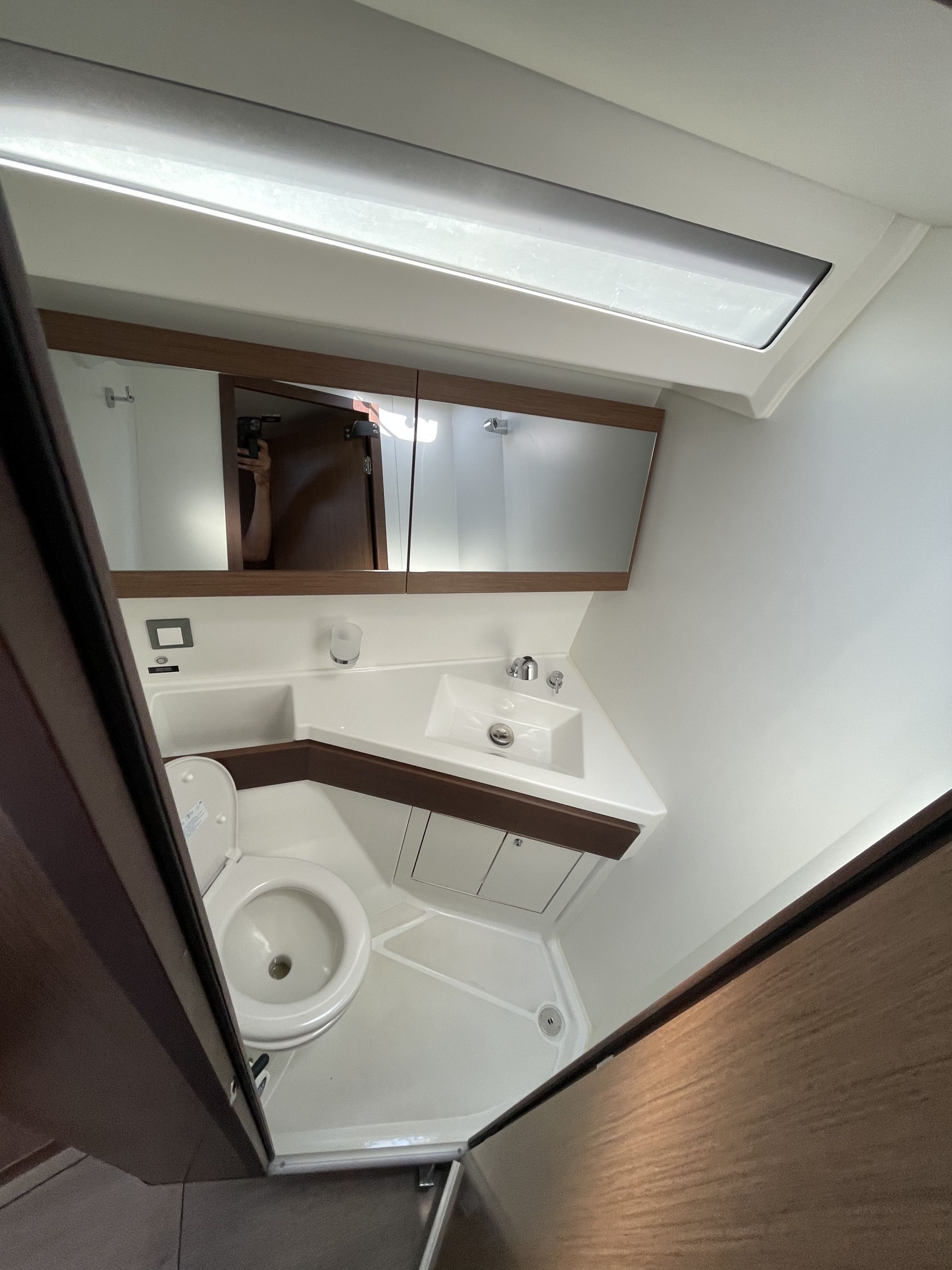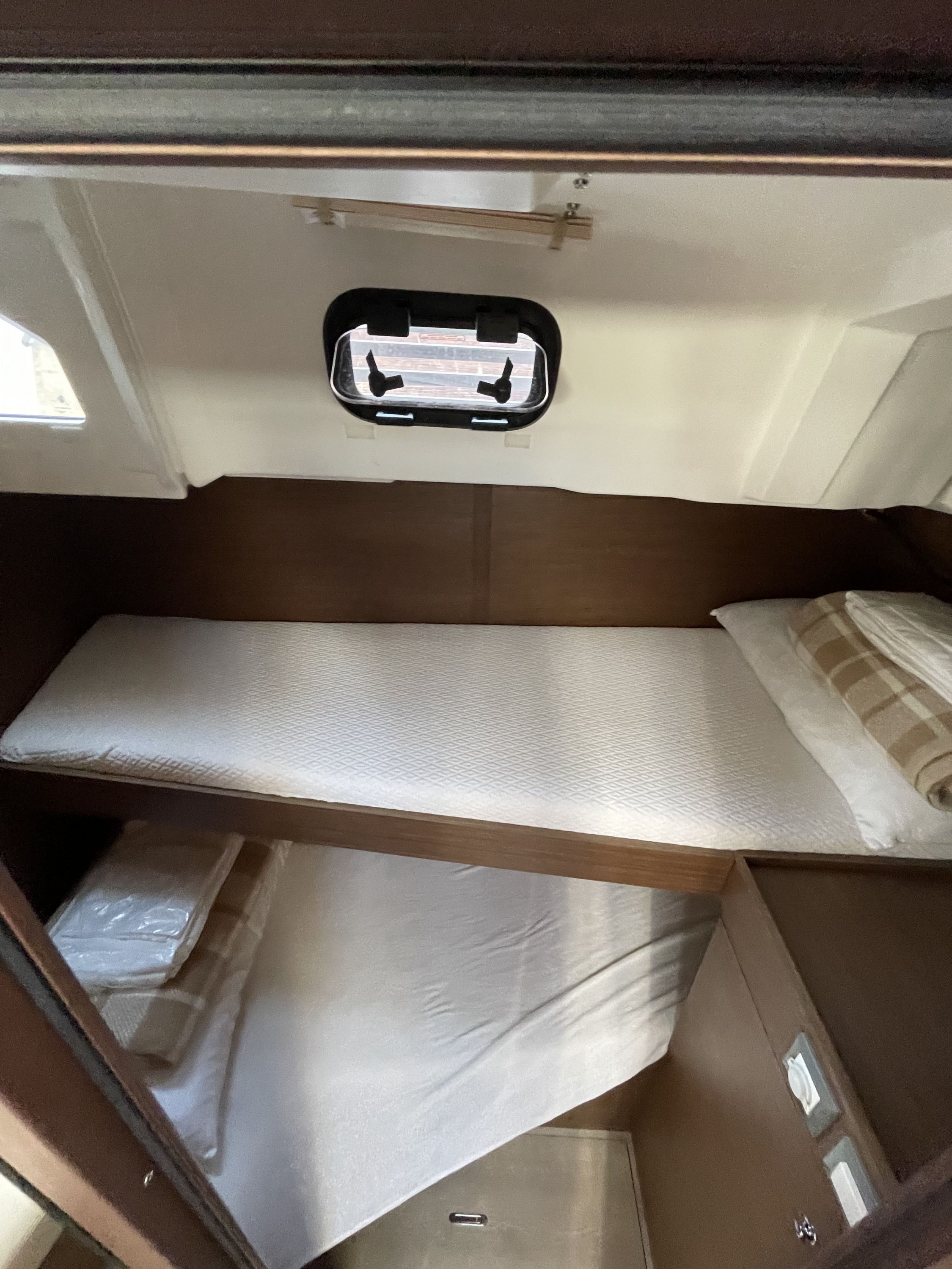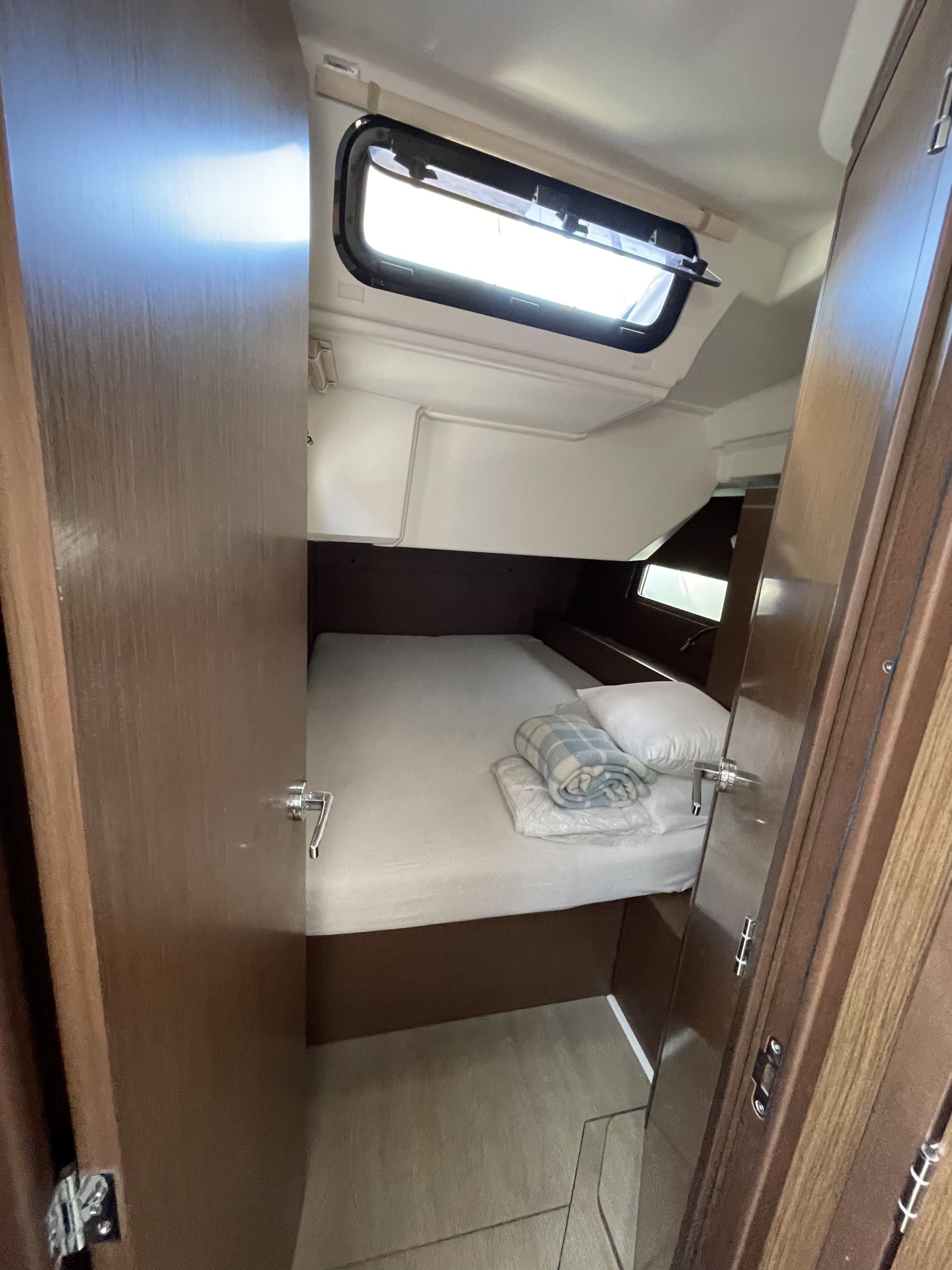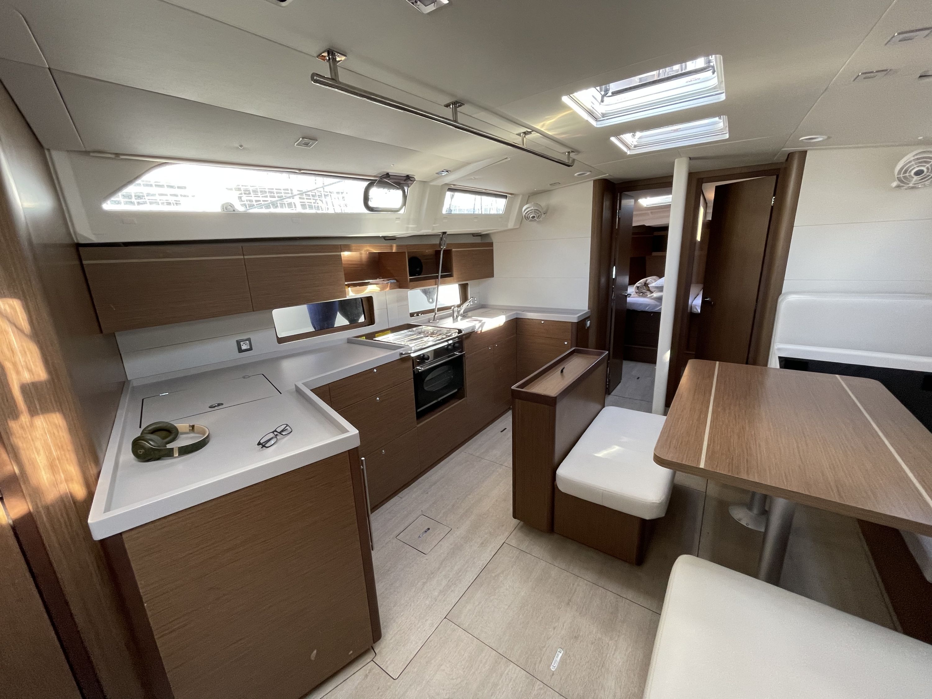 Freundlicher Empfang, wir könnten bereits circa 1600 Uhr aufs Boot, gute Einweisung in die Yacht, preiswerte Parkplätze direkt am Boot. Die Yacht ist erst ein Jahr alt, leider aber nur von durchschnittlicher Verarbeitungsqualität. Geräumig, groß, breit, Kartentisch gibt es nicht.