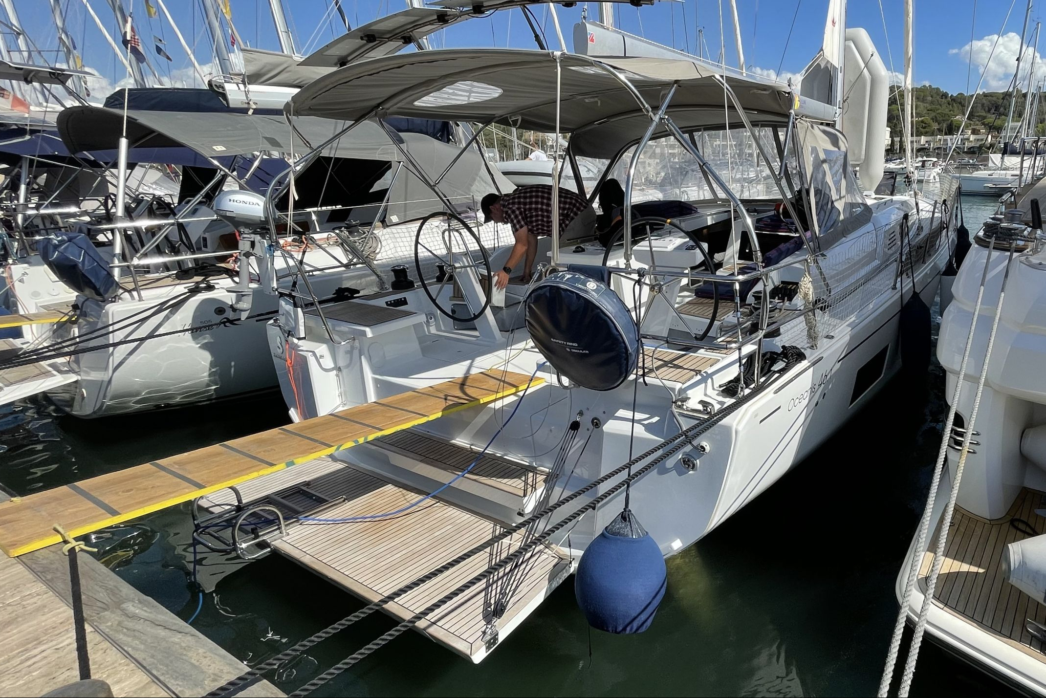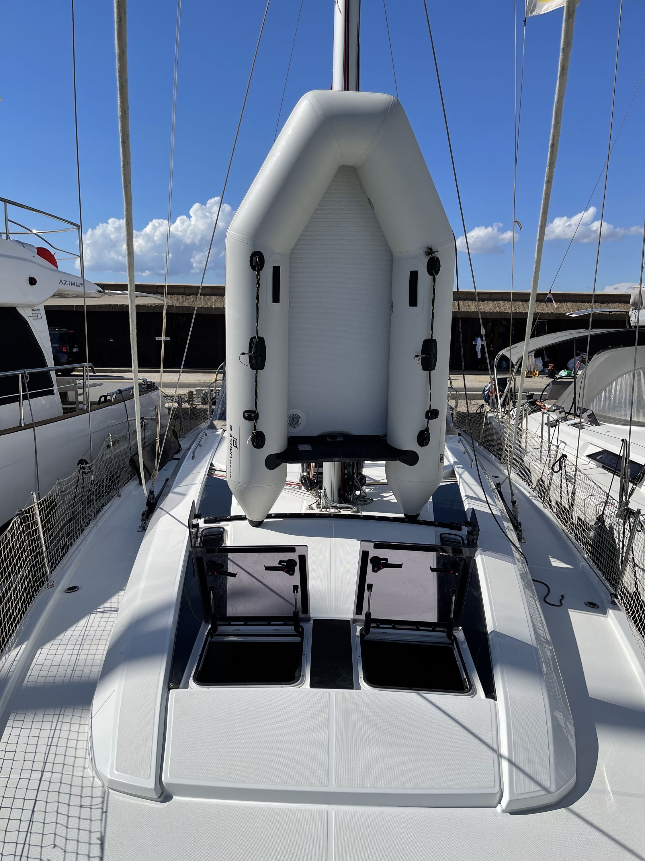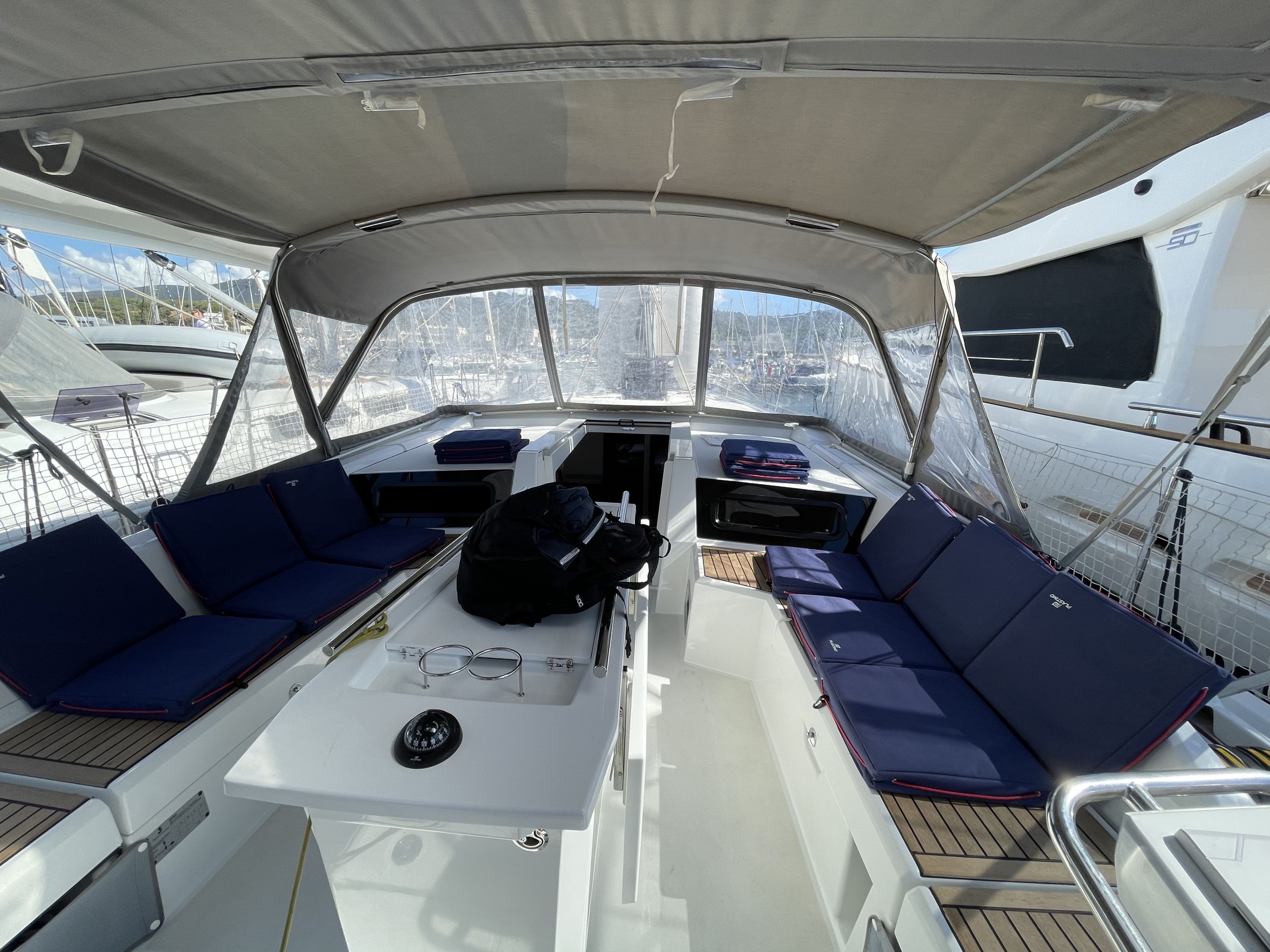 | Outside | Anker mit Kette, Badeplattform, Biminitop, Cockpitdusche, Cockpitpolster, Cockpittisch, Solaranlage, Sprayhood |