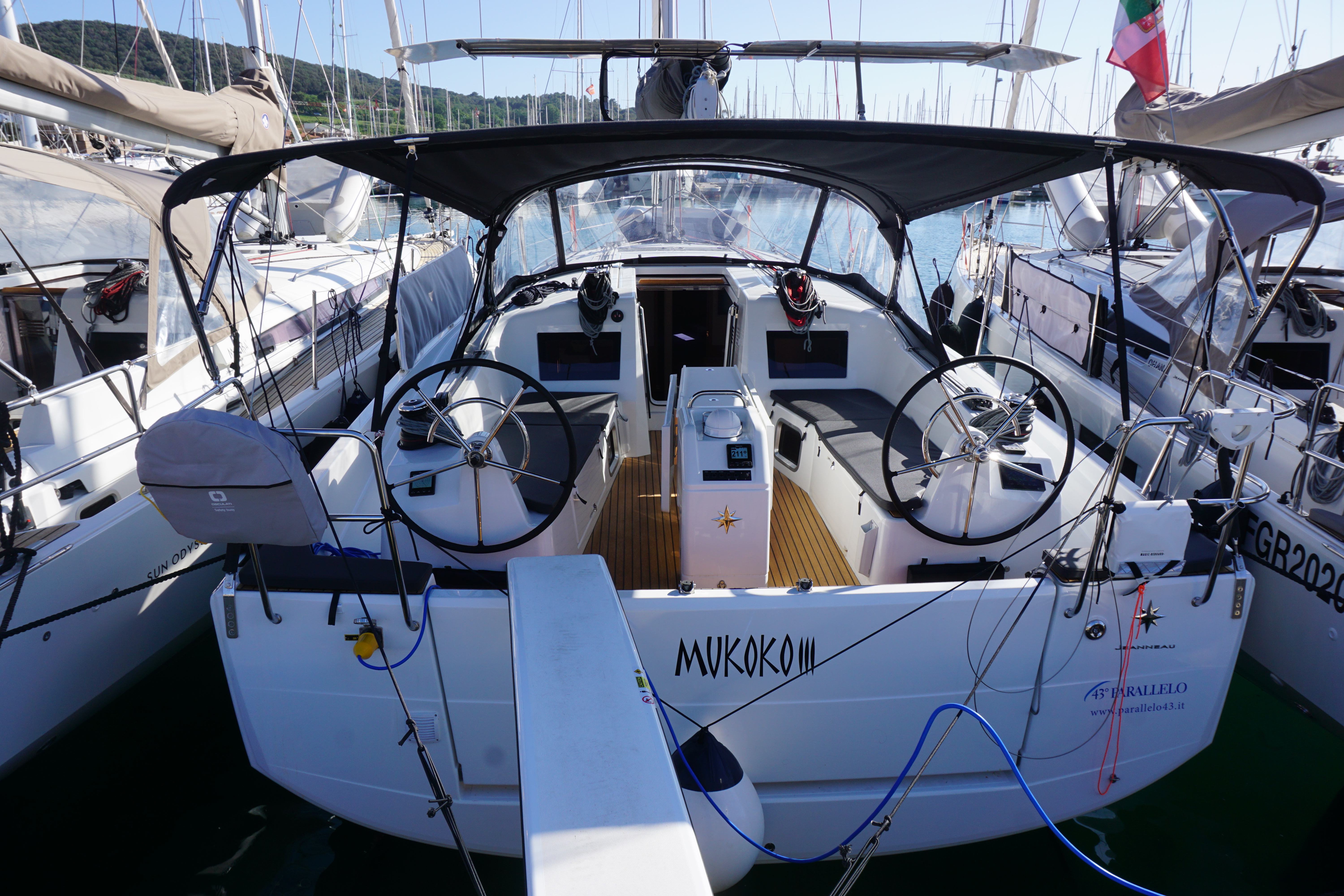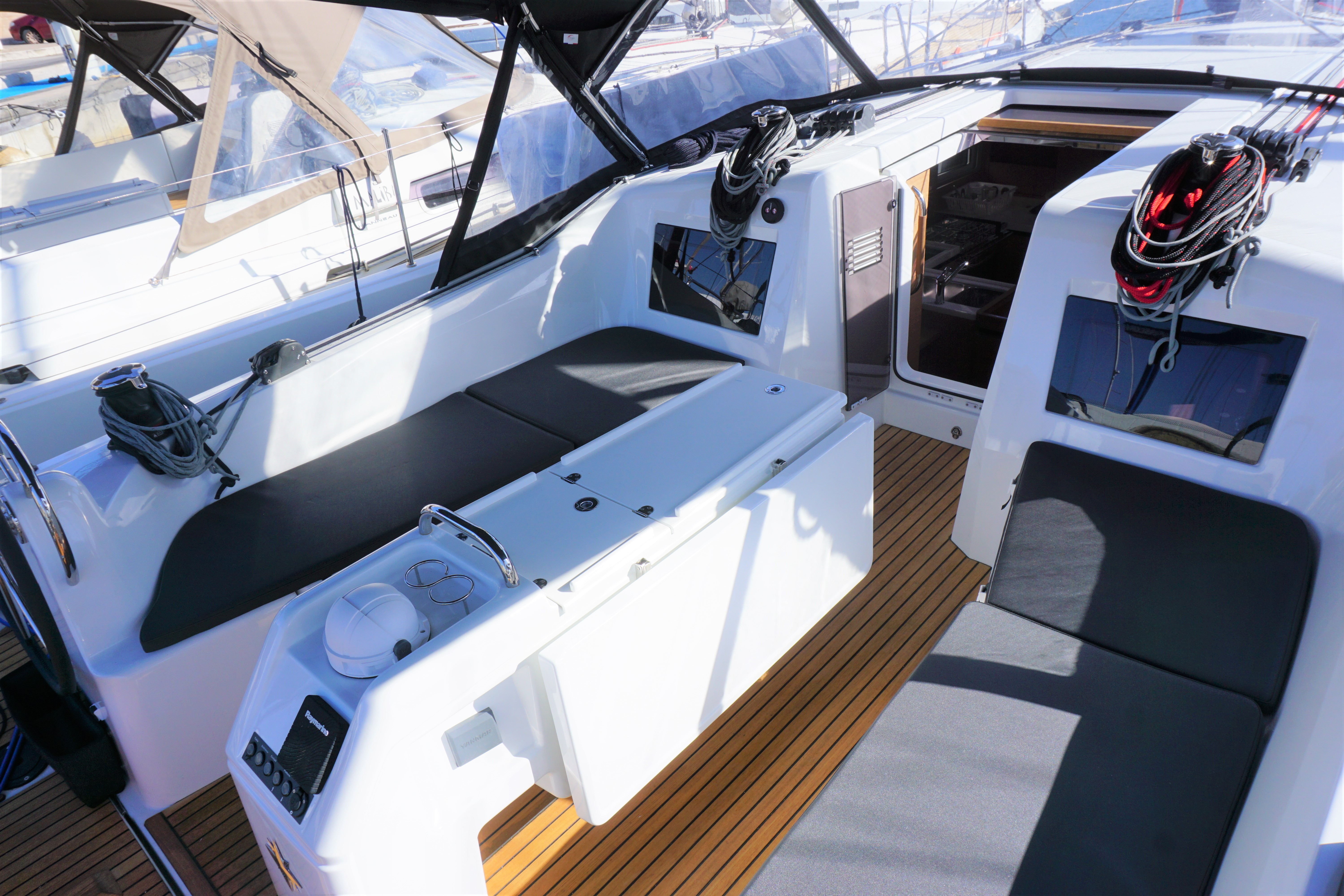 | Outside | 220 V-Landanschluss, Baro-/Hygro-/Thermometer, Biminitop, Cockpitdusche, Cockpitpolster, Cockpittisch, elektr. Ankerwinsch, elektr. Großwinsch, Gangway, Solaranlage, Sprayhood, Teak im Cockpit, Windex |