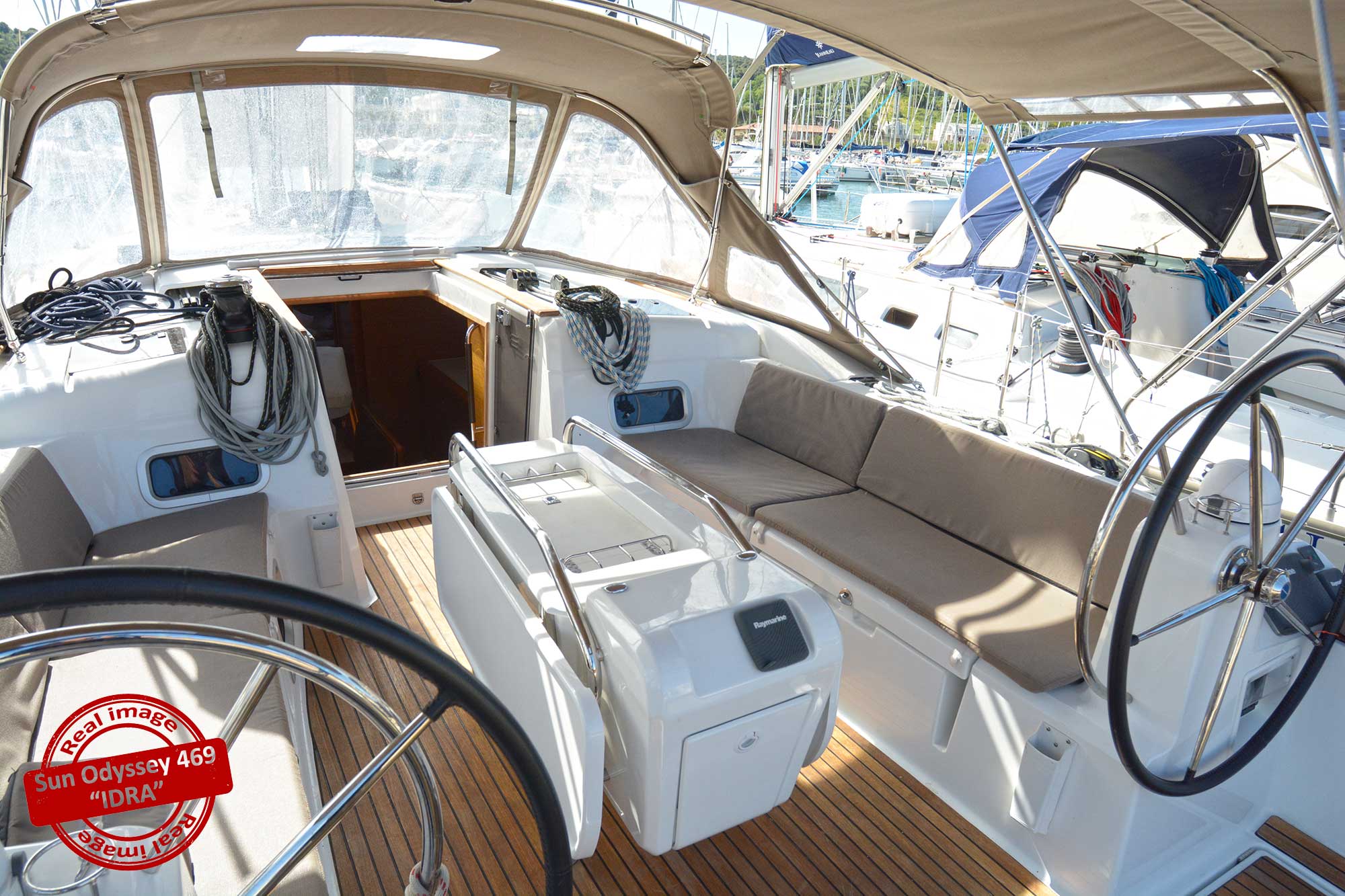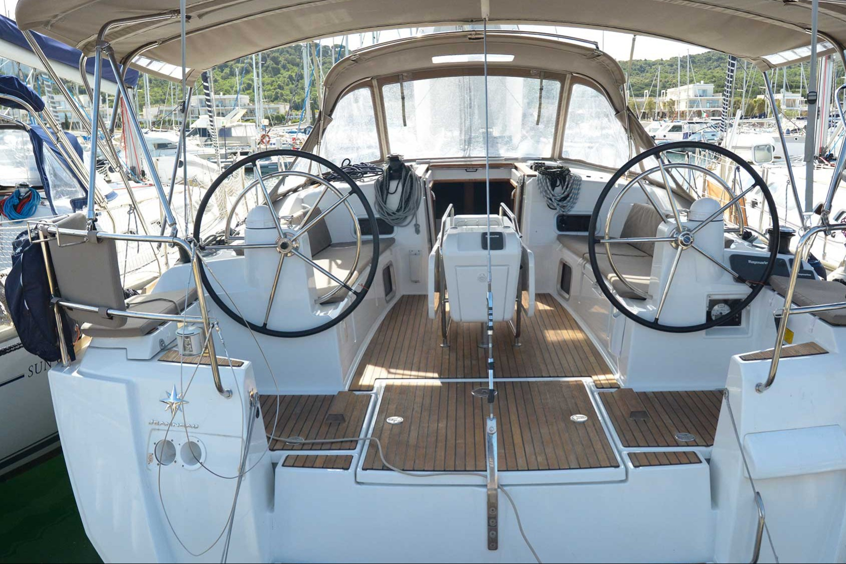 | Outside | Badeplattform, Biminitop, Cockpitdusche, Cockpitpolster, Cockpittisch, elektr. Ankerwinsch, Solaranlage, Sprayhood, Teak im Cockpit |