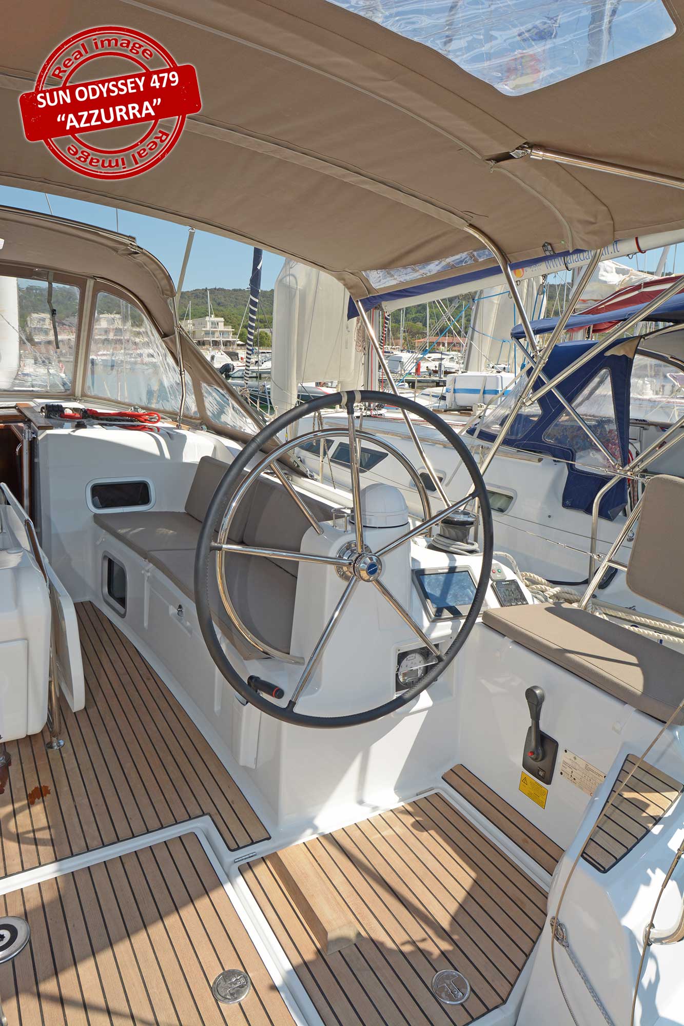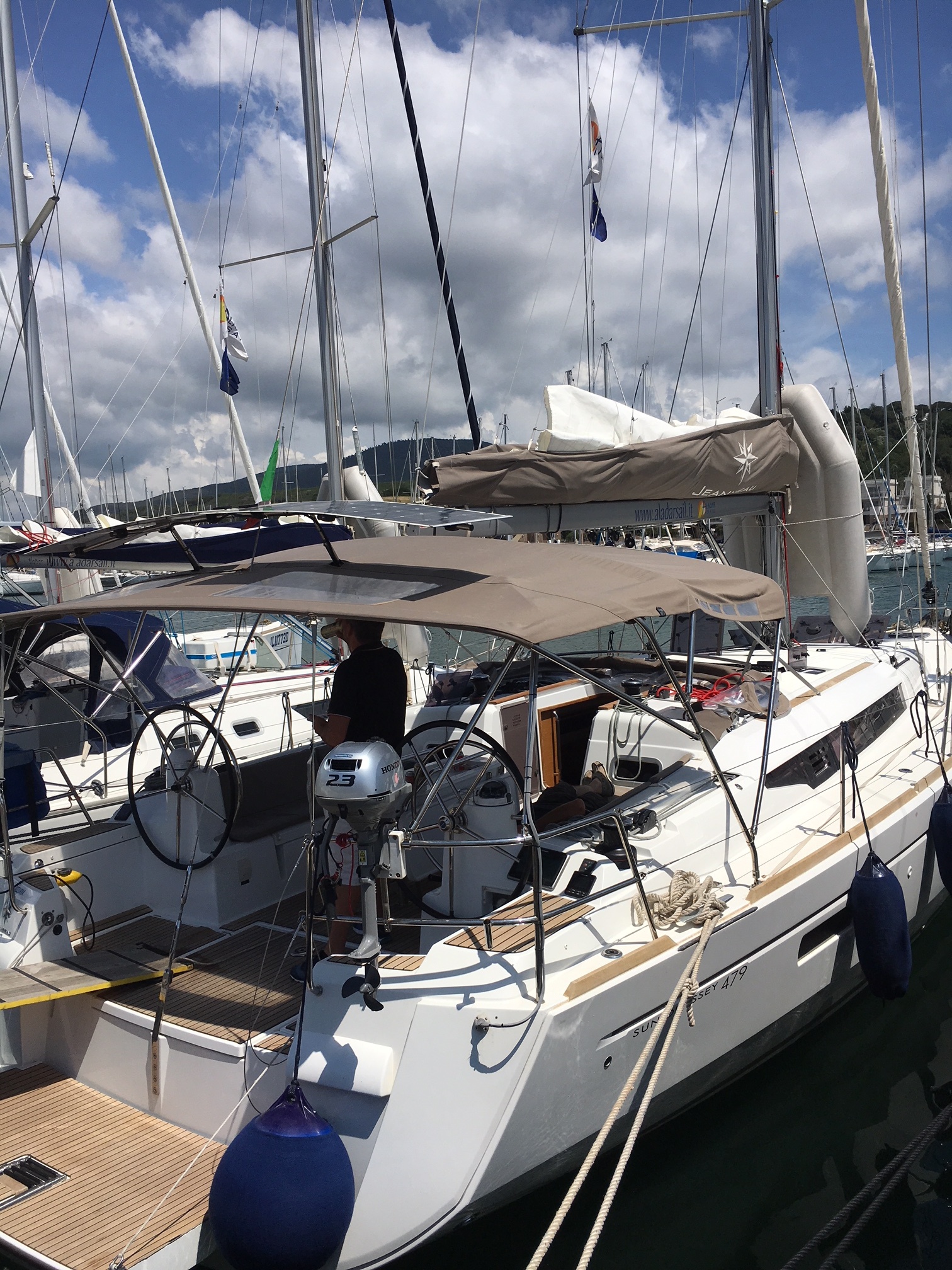| Outside | 220 V-Landanschluss, Badeplattform, Biminitop, Cockpitdusche, Cockpitpolster, Cockpittisch, Deckpolster, elektr. Ankerwinsch, Solaranlage, Sprayhood, Teak im Cockpit |