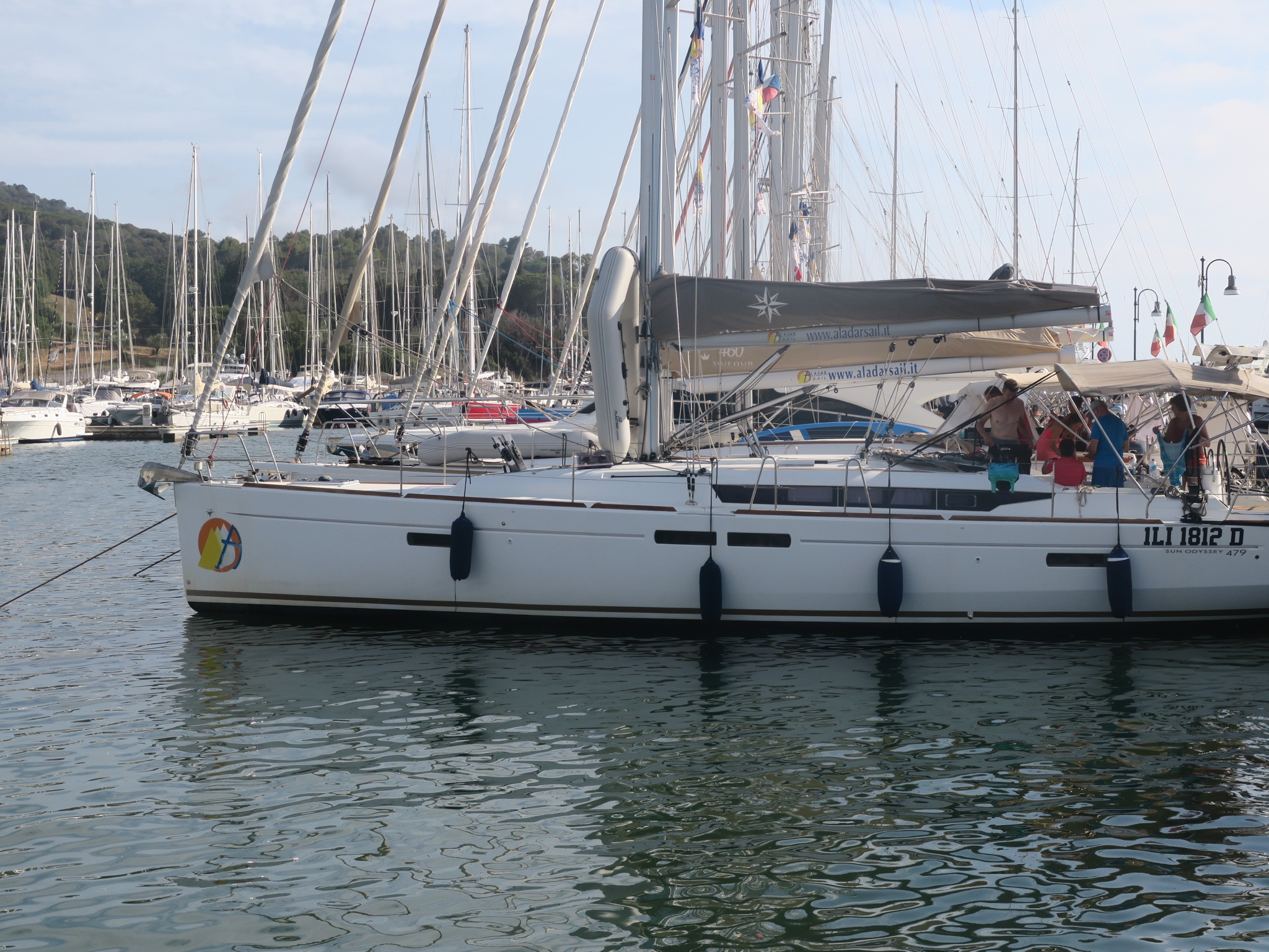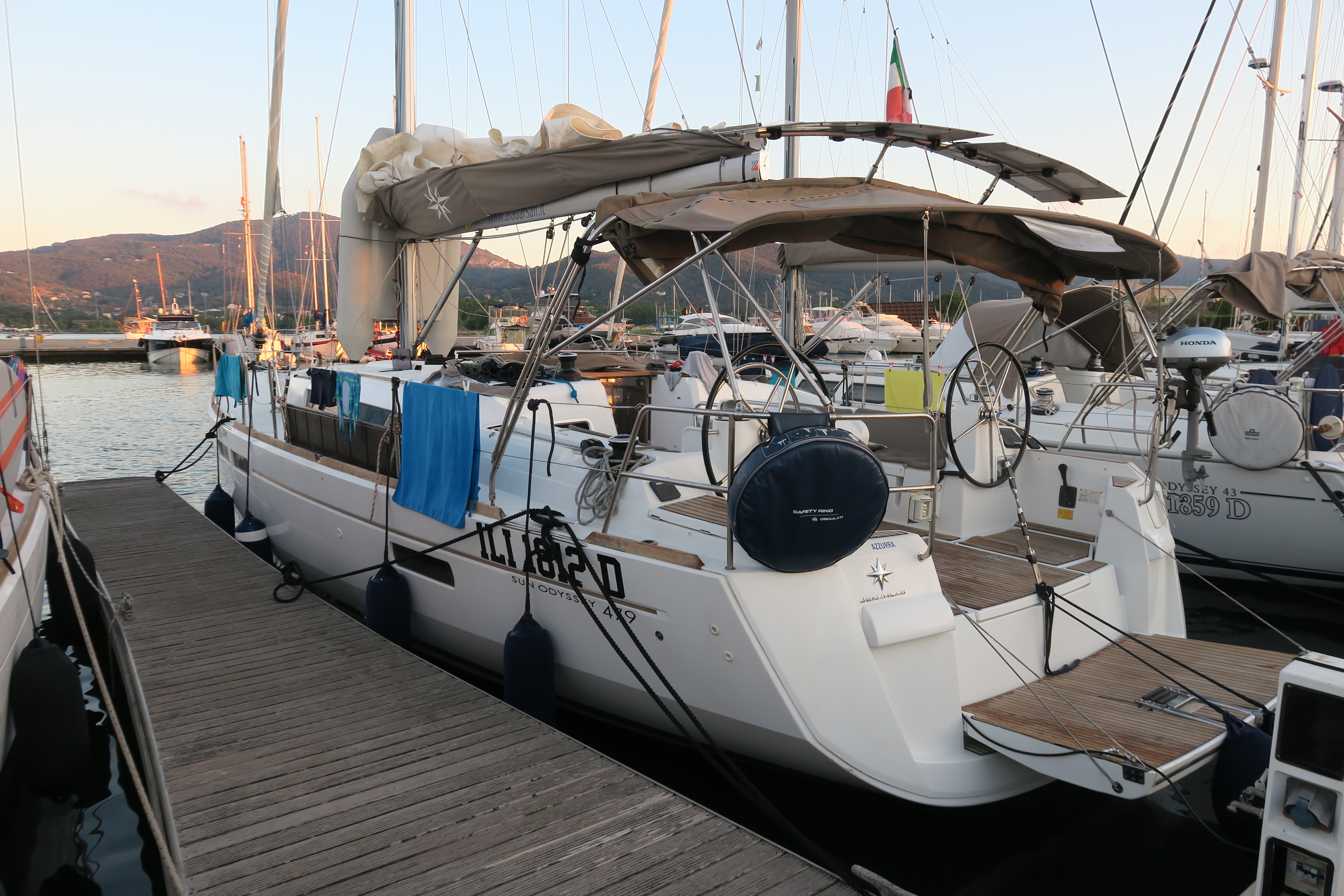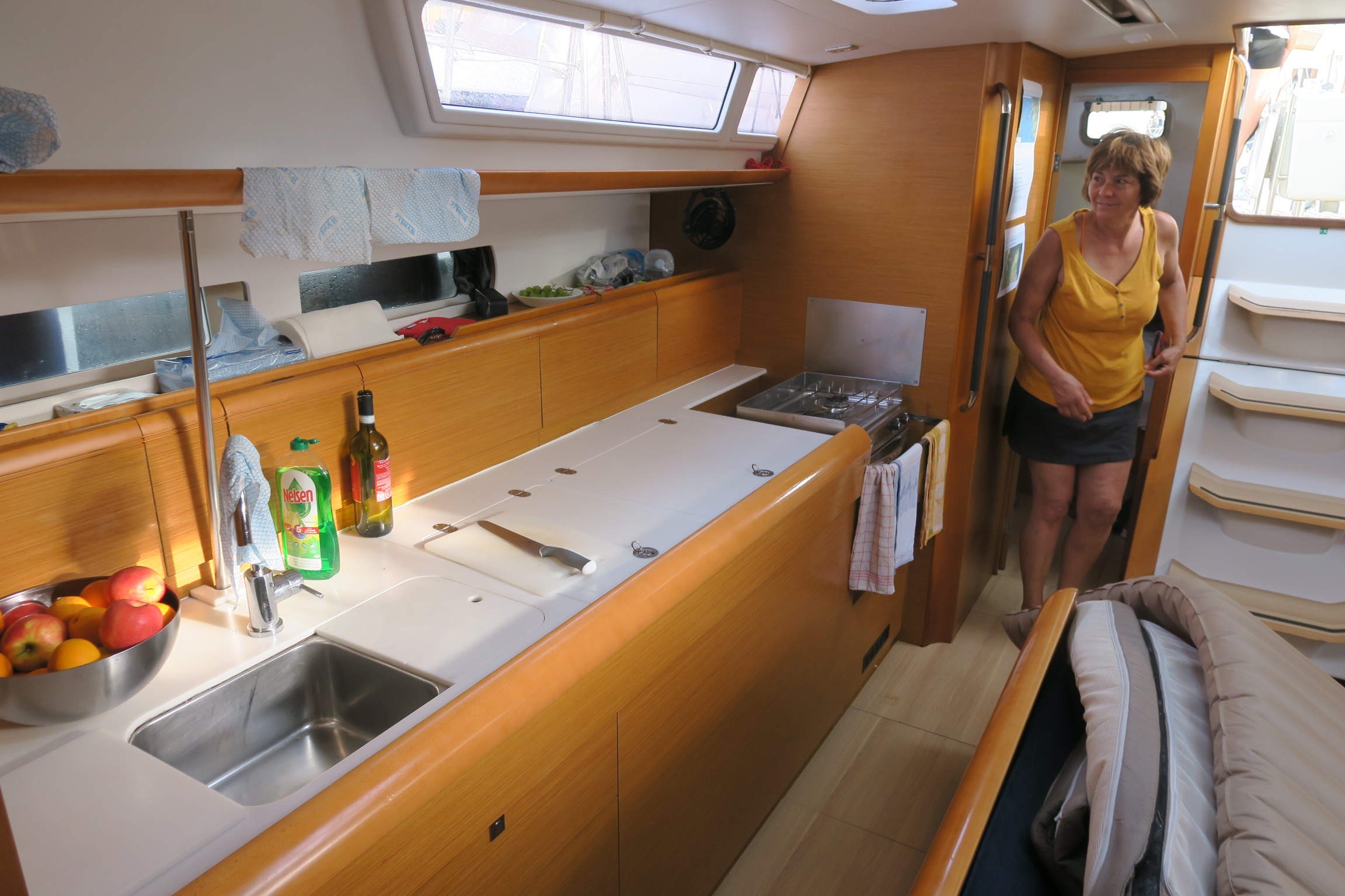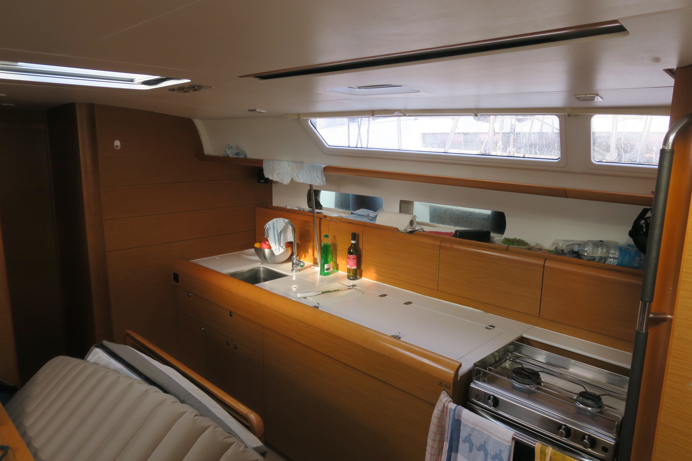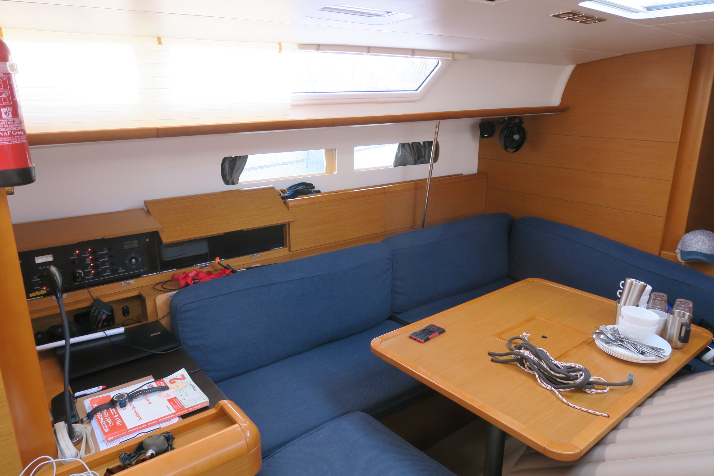 Hervorragende Ausstattung (Automatikwesten, Reanimationskoffer, etliche Feuerlöscher, zweiter Anker, gute Küchenausstattung usw.). Lediglich eine Löschdecke wäre gut gewesen. Heißwasserboiler hat nicht funktioniert und Kurzschluss erzeugt, wurde aber vor Abfahrt stillgelegt und nicht gebraucht. Genakersegel hat viel Spaß gemacht. Reffleinen liefen schwer und mussten bei jedem Segelsetzen oder Einholen mit einiger Anstrengung mitgeführt werden. Die Winschen sind am Heck ungünstig angebracht, vermutlich für Einhandbedienung gedacht. Die 4 Toilettenkabinen kosten viel Platz und sind unpraktisch. Dafür war der persönliche Stauraum knapp. Funkgerät an schlechter Stelle eingebaut, Display kaum ablesbar. Kartenplotter nur an Deck und nur vom Steuermann ablesbar. WLAN hat auf halbem Weg den Geist aufgegeben. Innenraum gut gepflegt, keine fleckigen Polster usw.