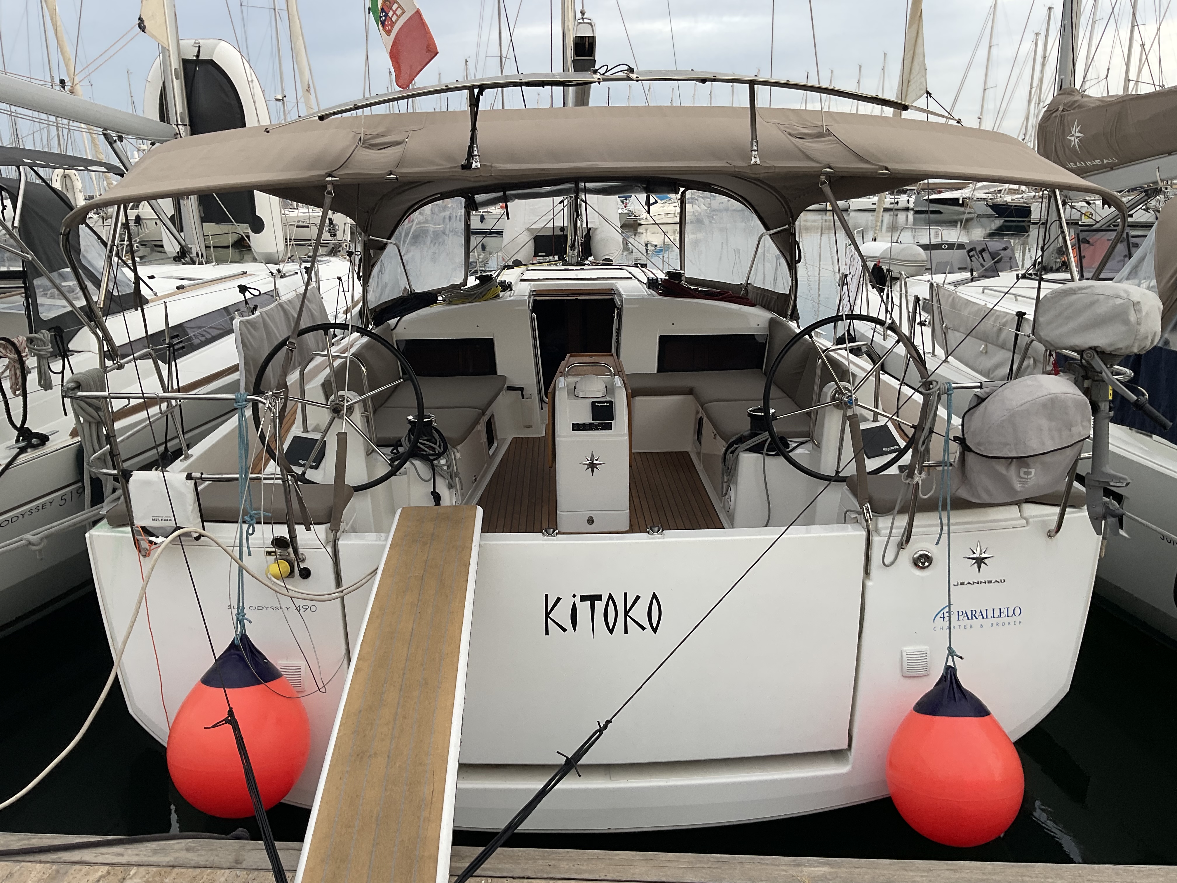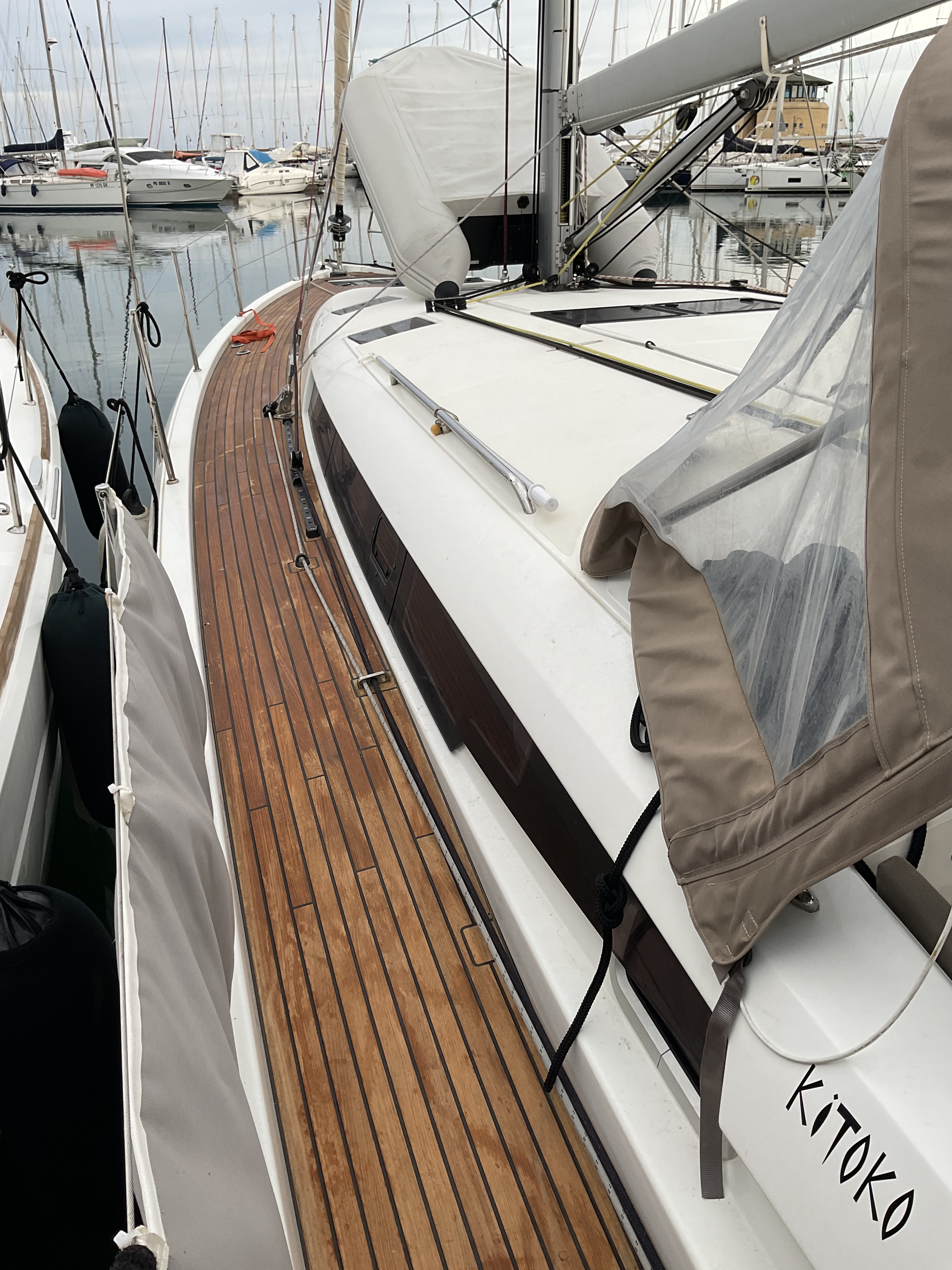 | Outside | 220 V-Landanschluss, Baro-/Hygro-/Thermometer, Biminitop, Cockpitdusche, Cockpitlautsprecher, Cockpitpolster, Cockpittisch, elektr. Ankerwinsch, Gangway, Solaranlage, Sprayhood, Teak im Cockpit, Teakdeck, Windex |