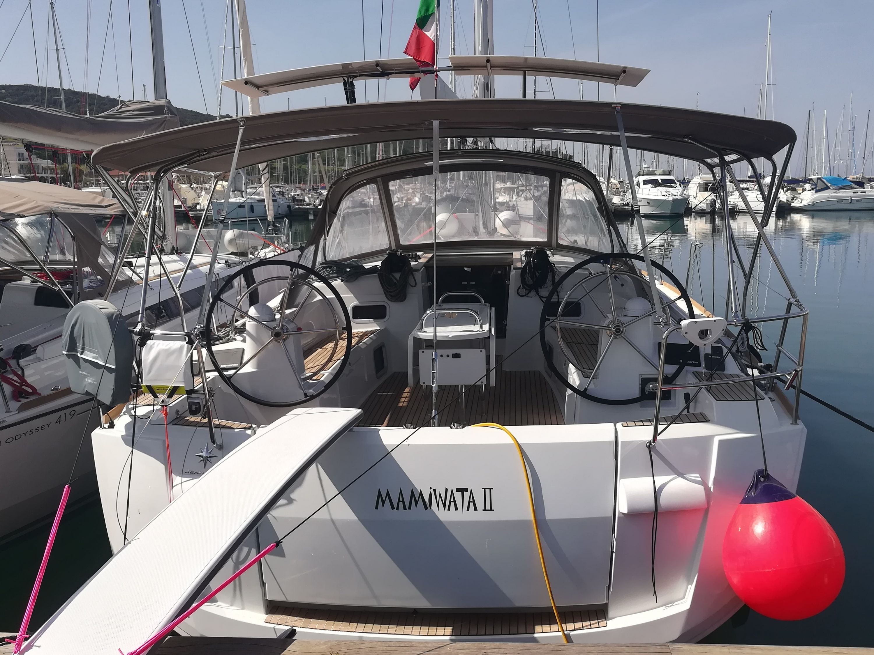 | Outside | 220 V-Landanschluss, Baro-/Hygro-/Thermometer, Biminitop, Cockpitdusche, Cockpitpolster, Cockpittisch, elektr. Ankerwinsch, Gangway, Solaranlage, Sprayhood, Teak im Cockpit, Windex |