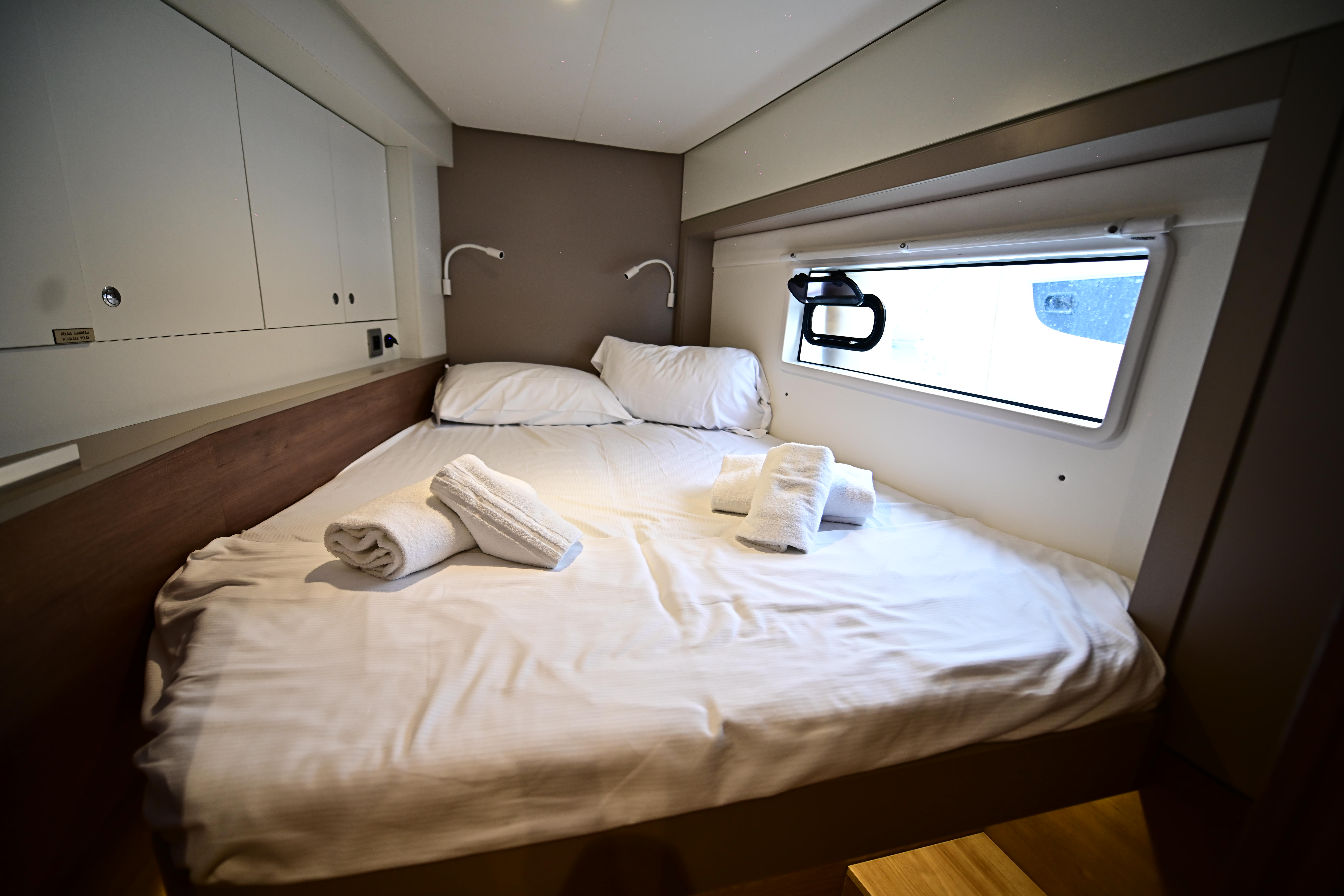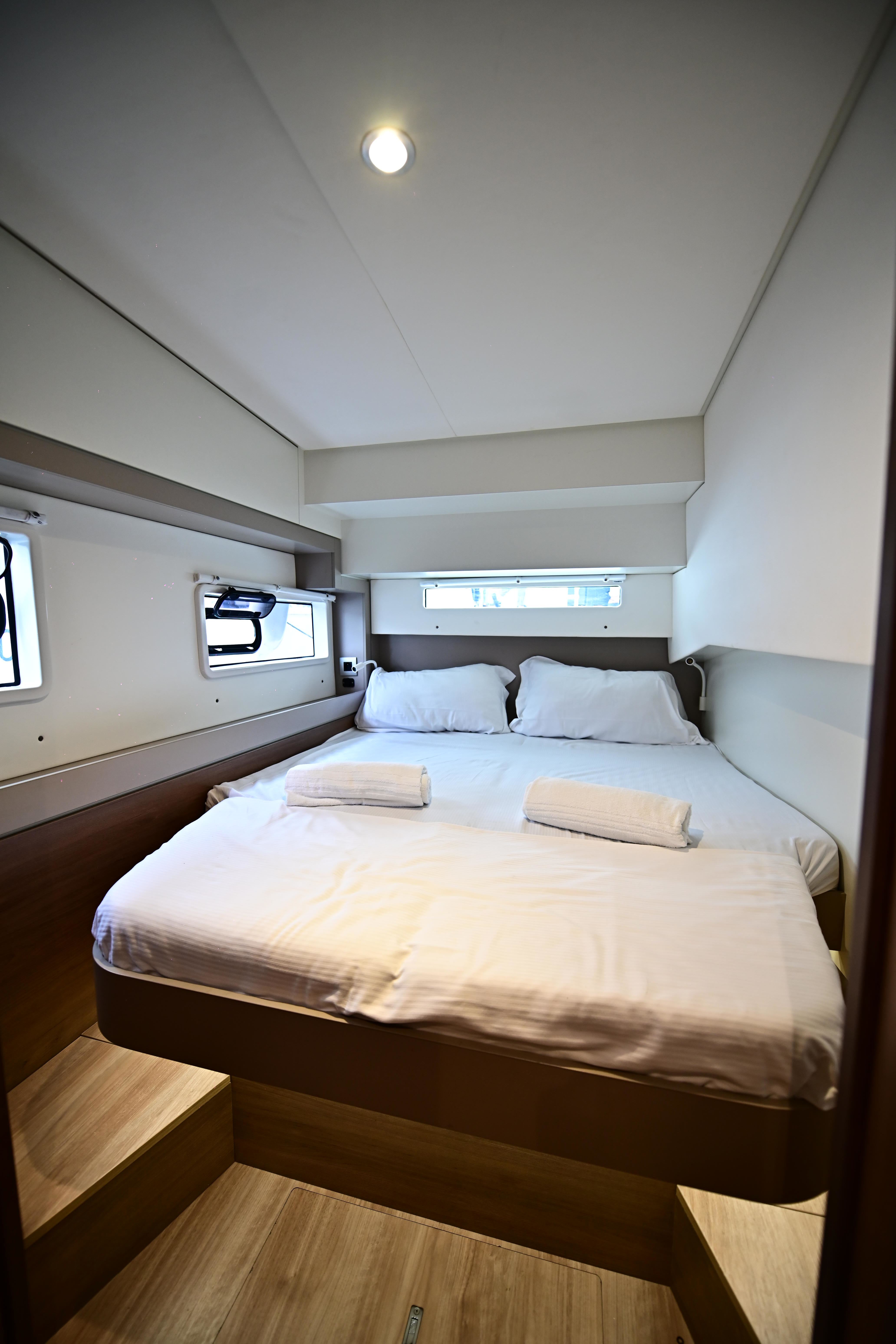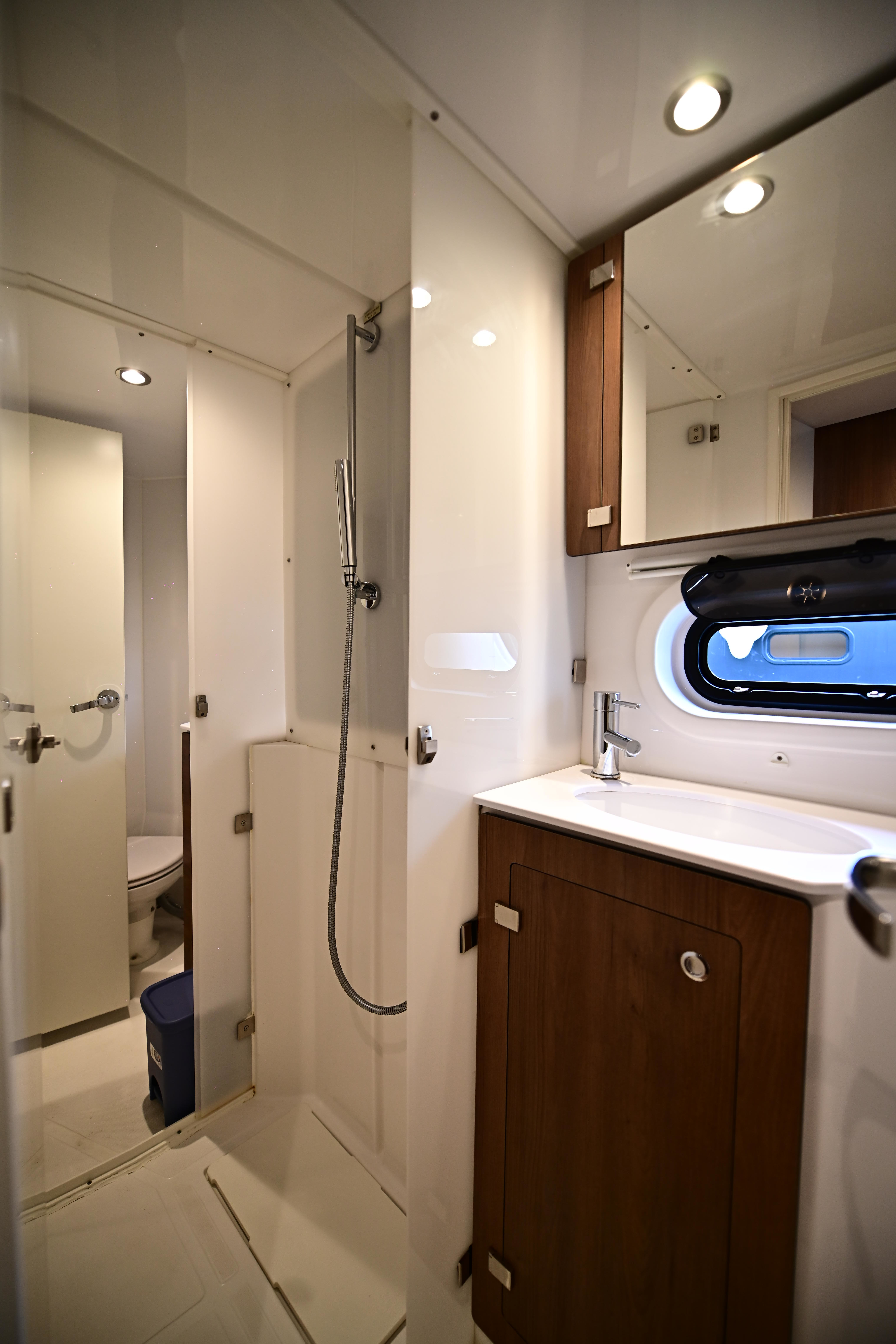 | Inside | Bluetooth Player, Gasherd mit Backofen, Gefrierschrank, Generator, Inverter 12V/220V, Klimaanlage (ohne Landstrombedarf), Kühlschrank, Mikrowelle, Salontisch absenkbar, Ventilatoren in Kabinen, Watermaker, WC (elektr.) |