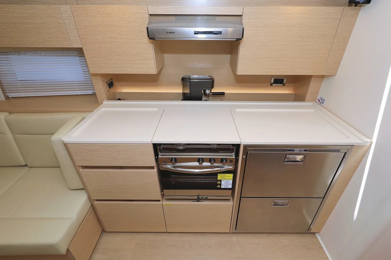 | Inside | Gasherd mit Backofen, Gefrierschrank, Generator, Geschirrspüler, Heizung, Inverter 12V/220V, Klimaanlage (ohne Landstrombedarf), Kühlschrank, TV, Watermaker, WC (elektr.) |