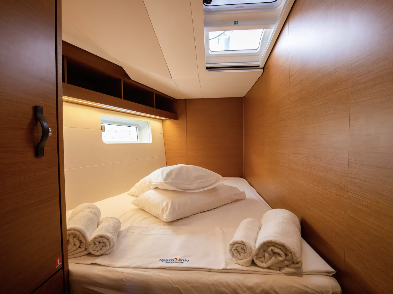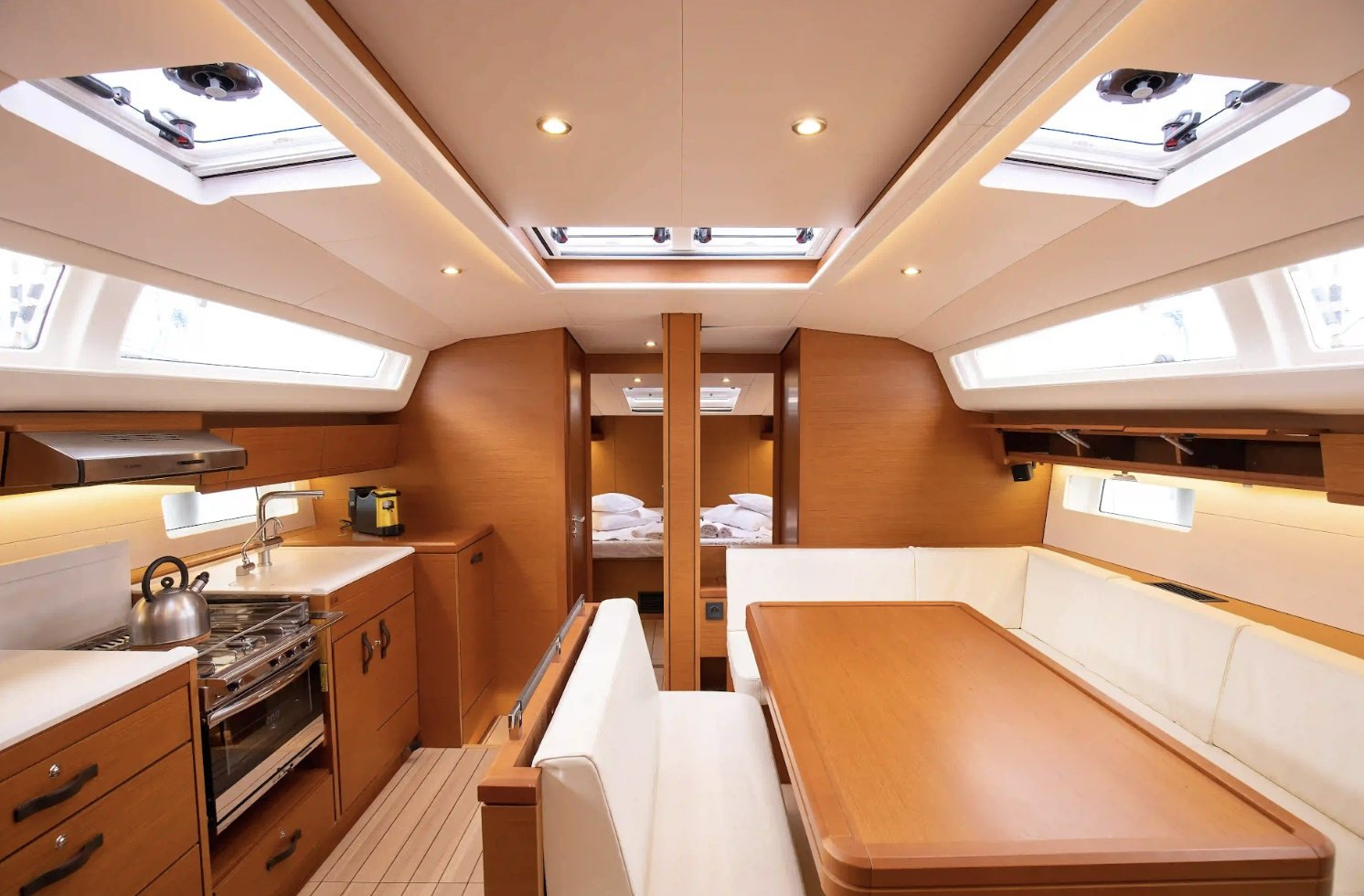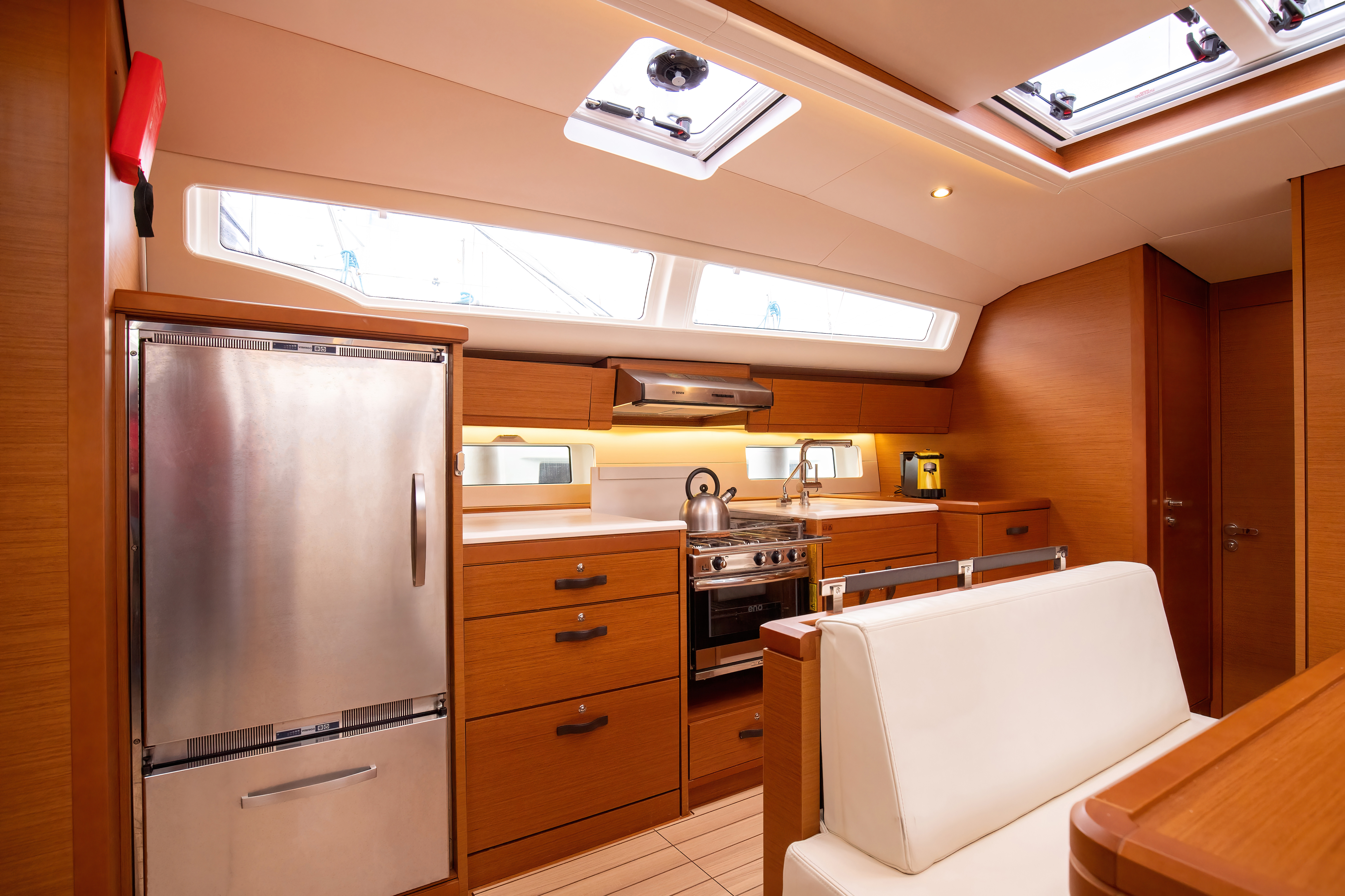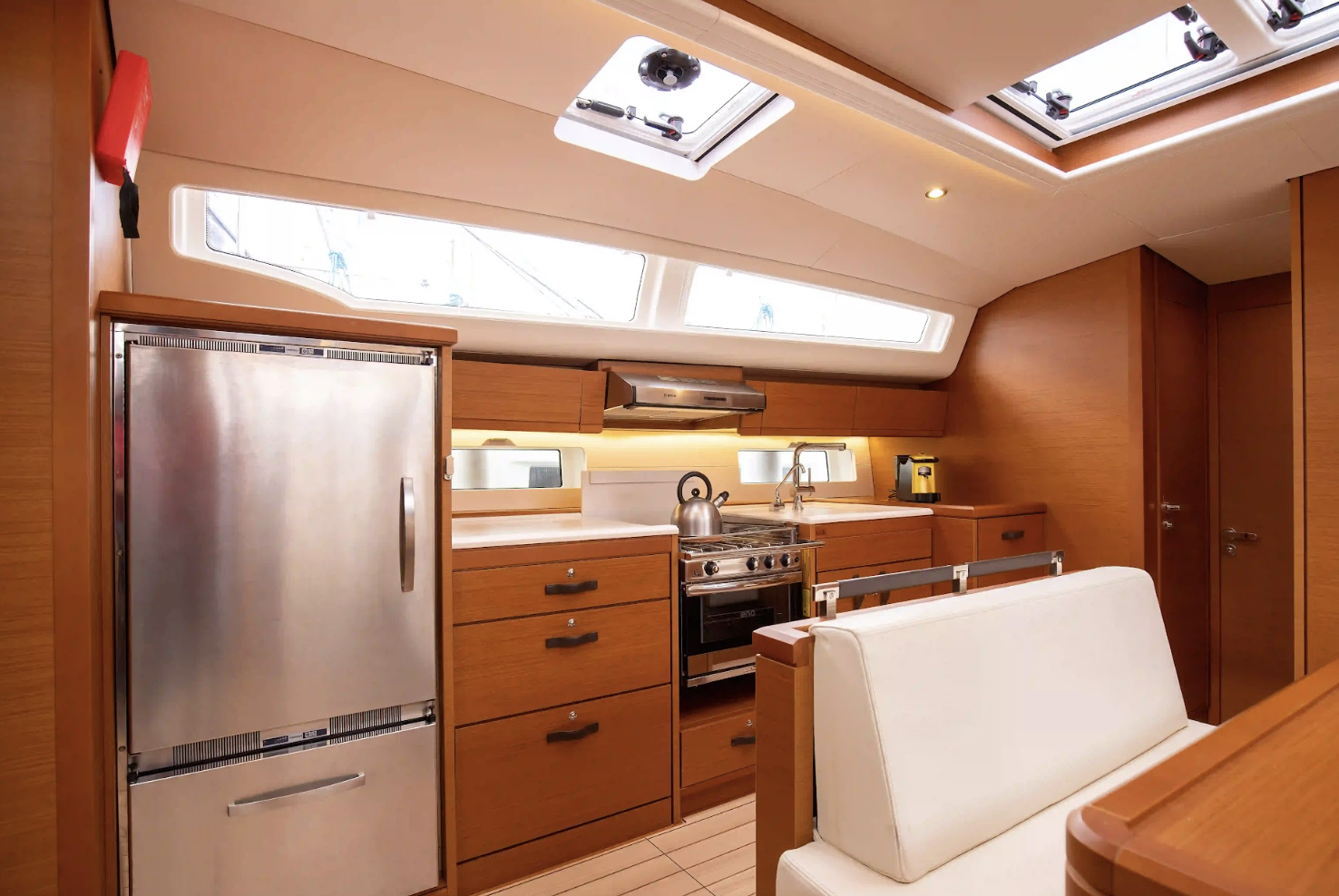 | Inside | Gasherd mit Backofen, Generator, Geschirrspüler, Hi-Fi System, Inverter 12V/220V, Kaffeemaschine, Klimaanlage (ohne Landstrombedarf), Kühlschrank, Landstromkabel, Luftpumpe für Beiboot, USB Steckdosen in den Kabinen |