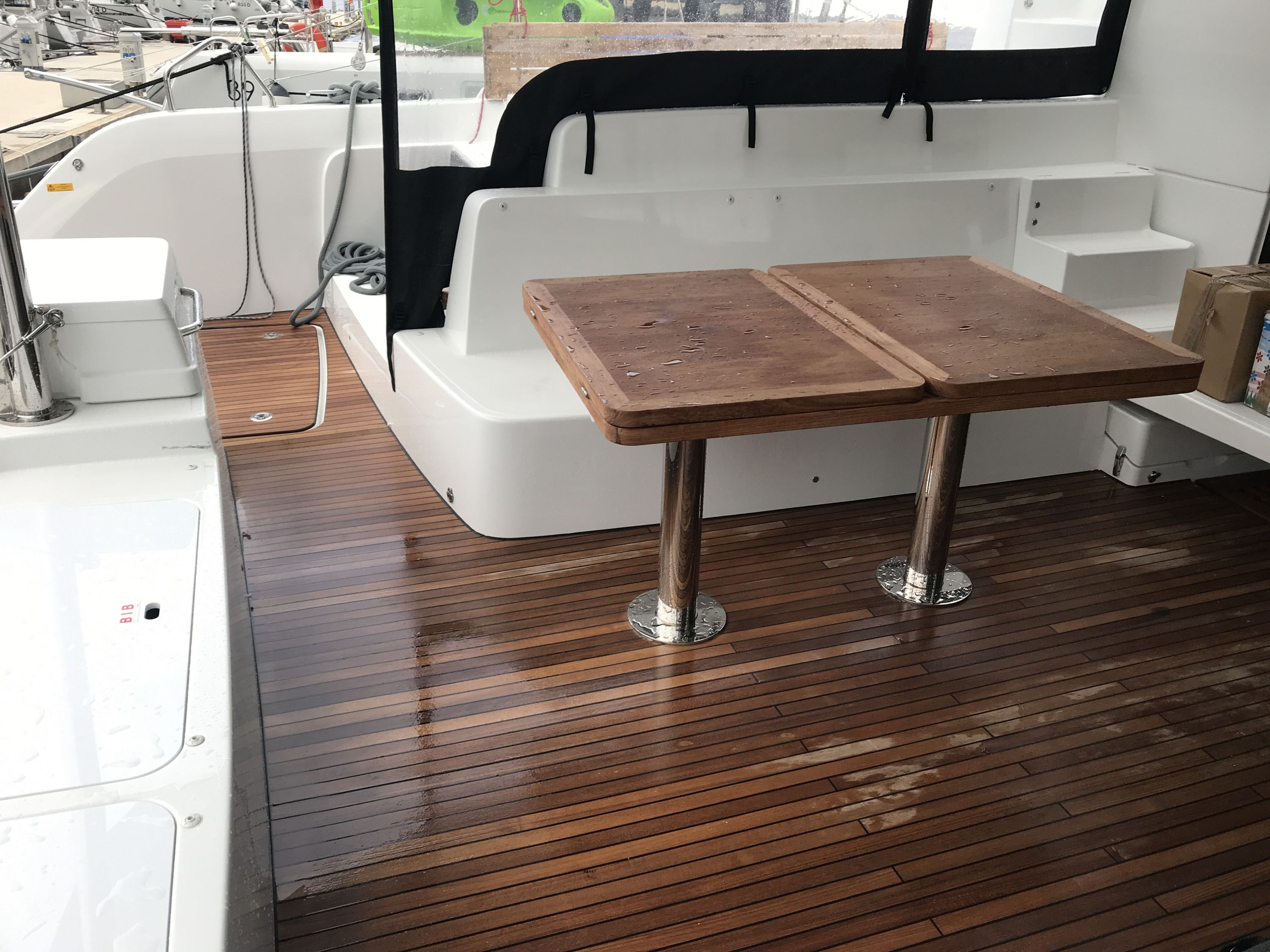 | Outside | Biminitop, Cockpitdusche, Cockpitkühlschrank, Cockpitlautsprecher, Cockpitpolster, Deckpolster, elektr. Ankerwinsch, elektr. Winsch, hydraul. Gangway, Schnorchelausrüstung, Sprayhood, Teak im Cockpit, Tenderlift |