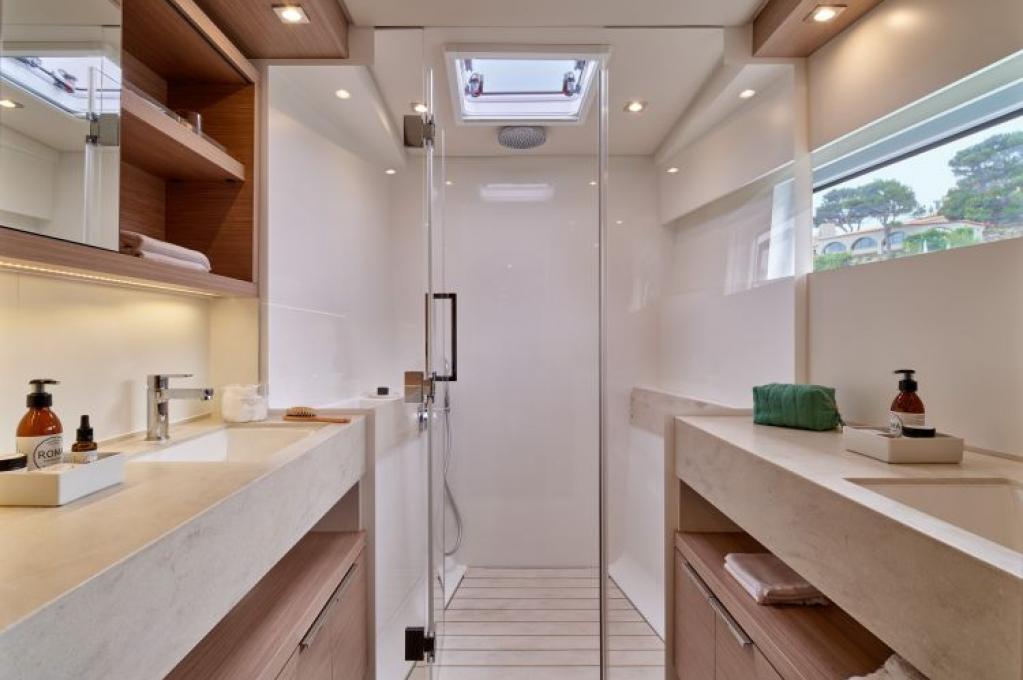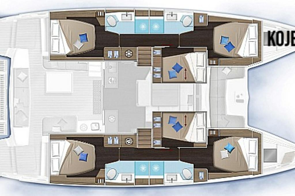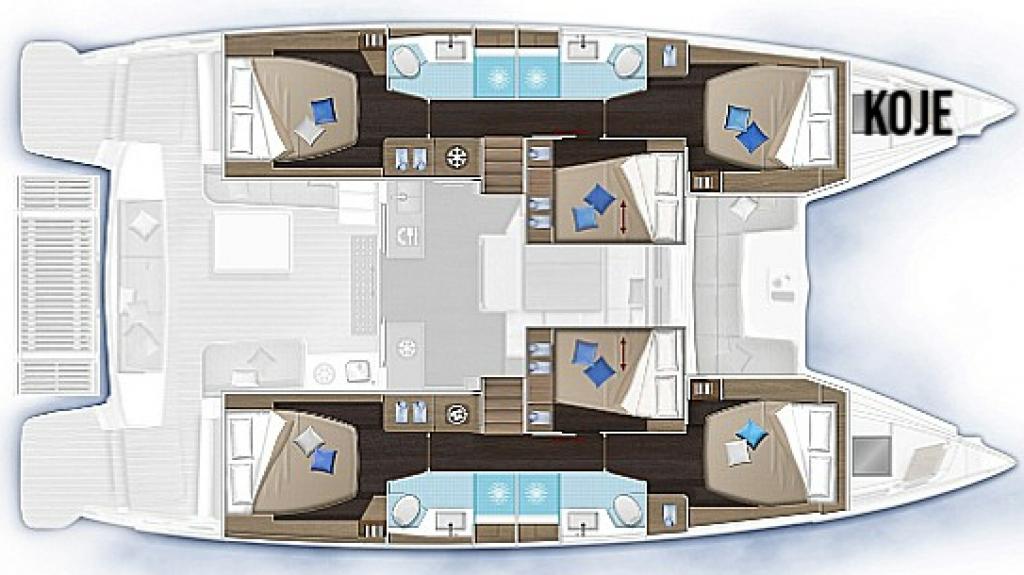 | Inside | Generator, Klimaanlage (ohne Landstrombedarf), Salontisch absenkbar, USB Steckdosen in den Kabinen, Ventilatoren in Salon und Kabinen |