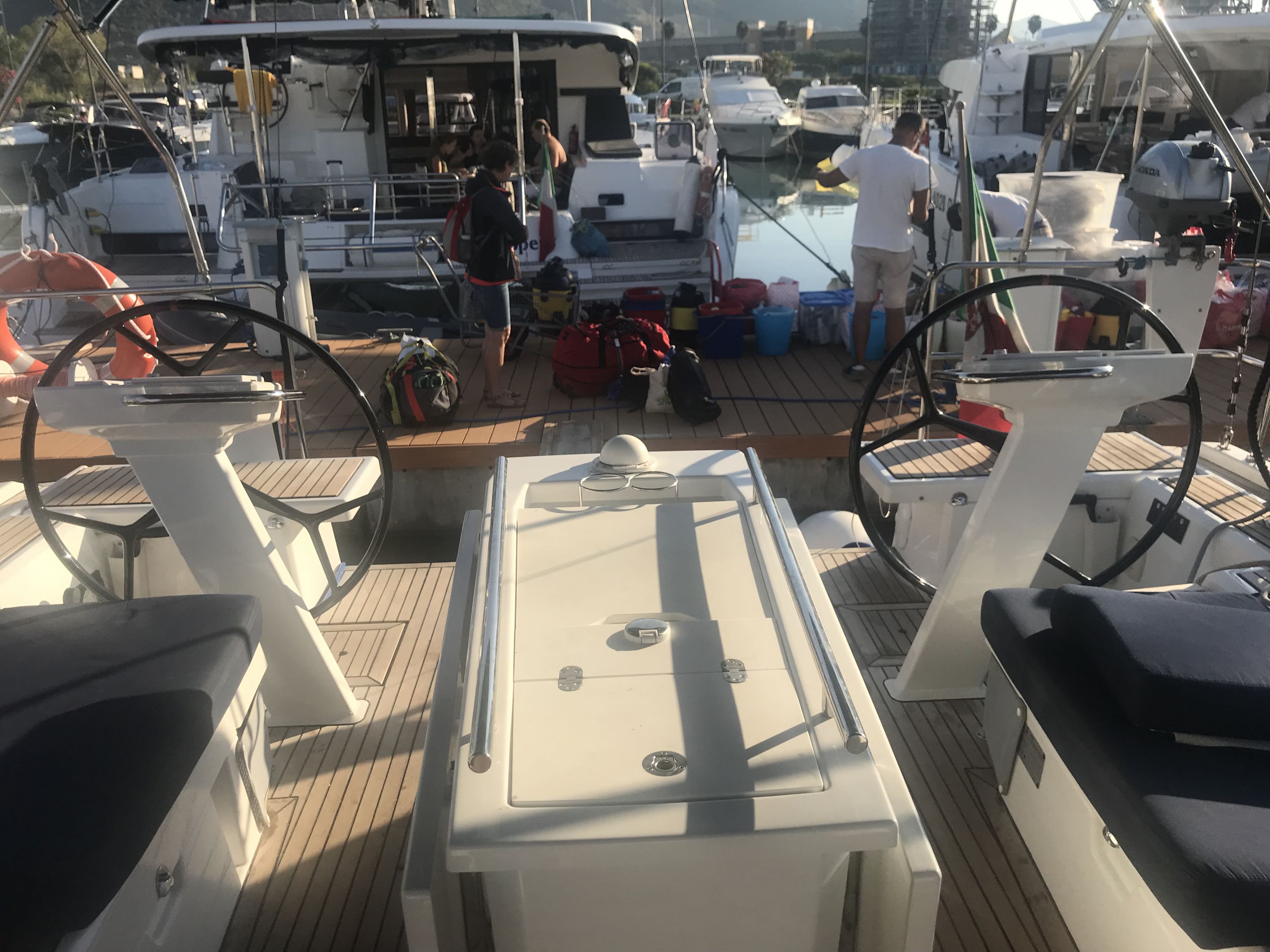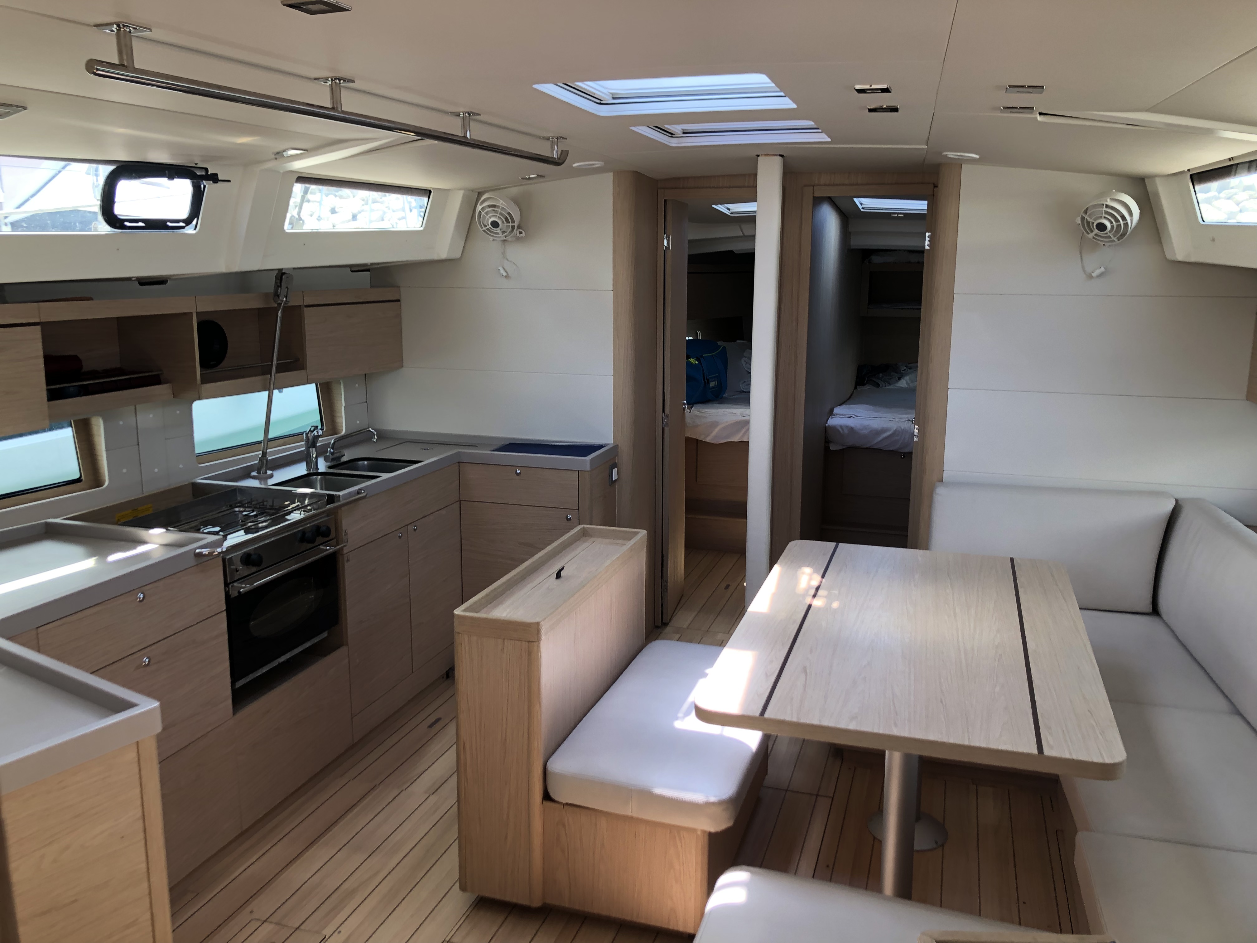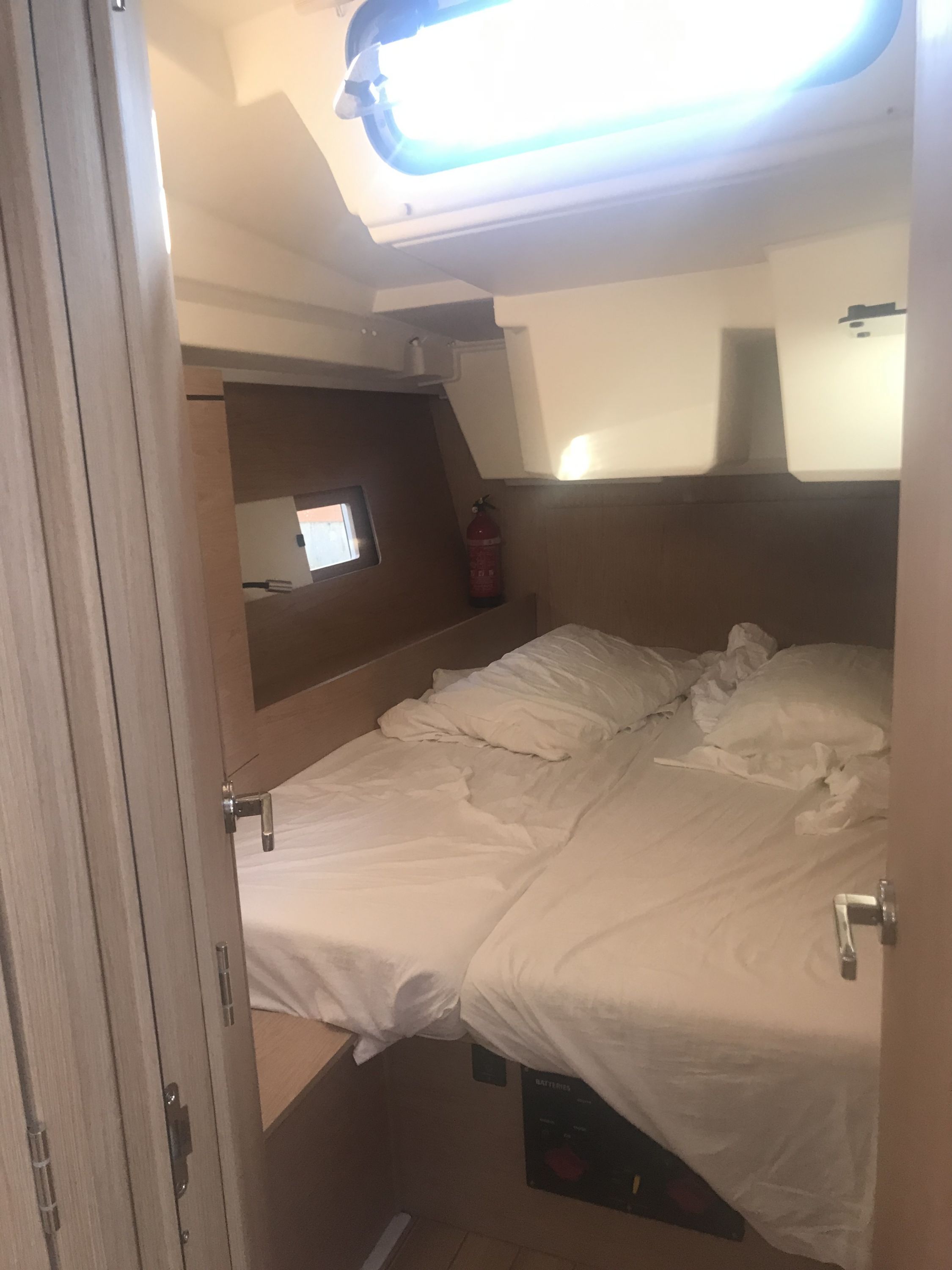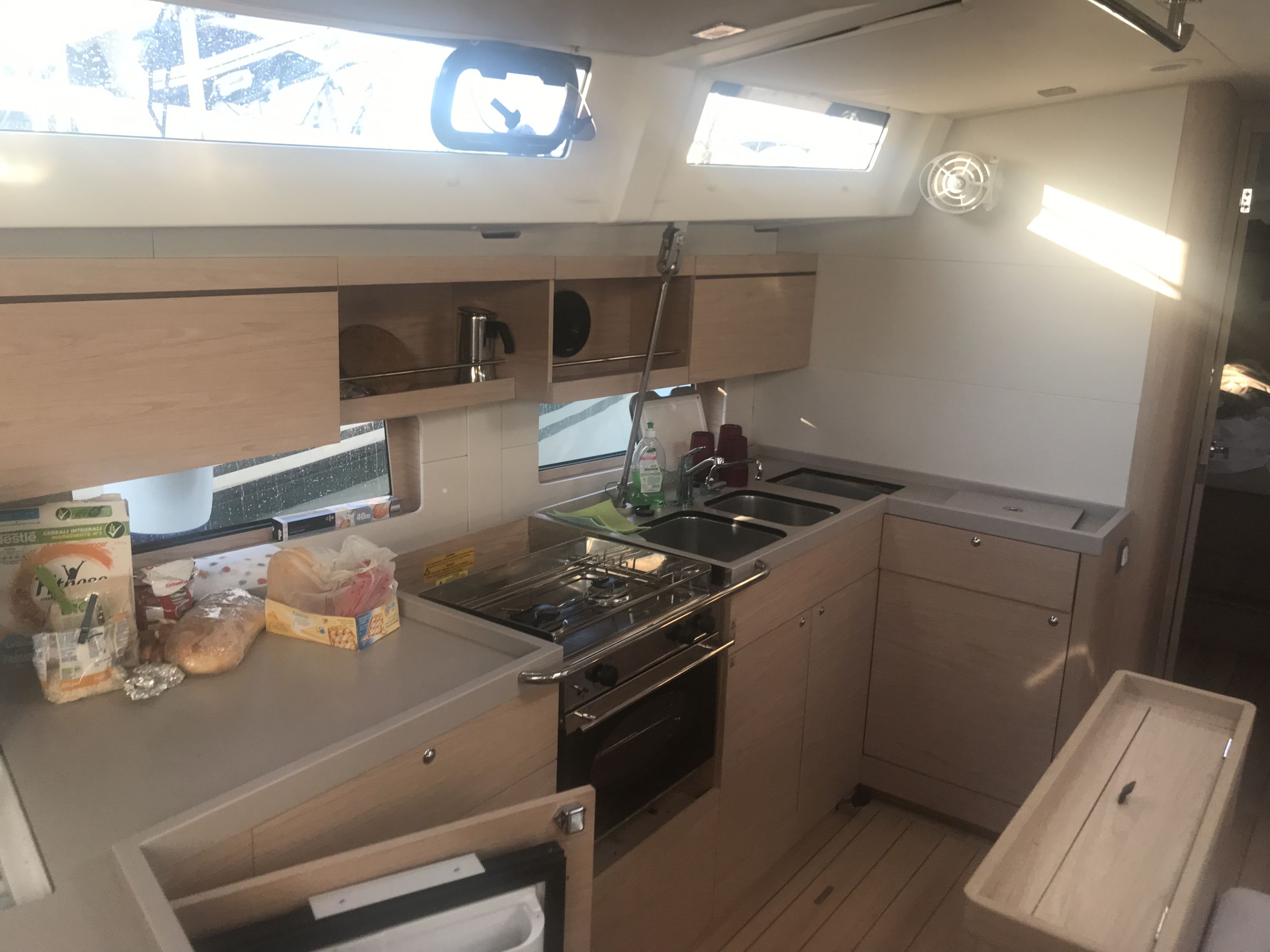 | Inside | Gasherd mit Backofen, Inverter 12V/220V, Kaffeemaschine, Kühlschrank, Landstromkabel, Luftpumpe für Beiboot, Mikrowelle, Radio mit USB, USB Steckdosen in den Kabinen, Ventilator, WC (elektr.) |
