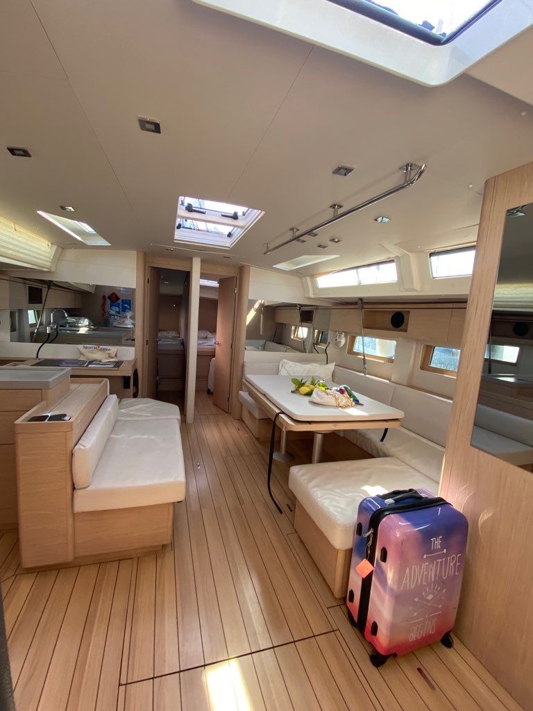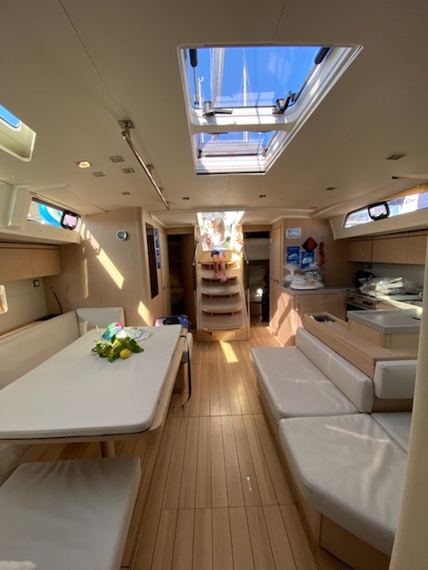 | Inside | Gasherd mit Backofen, Generator, Inverter 12V/220V, Kaffeemaschine, Klimaanlage (ohne Landstrombedarf), Kühlschrank, Landstromkabel, Luftpumpe für Beiboot, Mikrowelle, Radio mit USB, Salontisch absenkbar, USB Steckdosen in den Kabinen, Ventilator, WC (elektr.) |