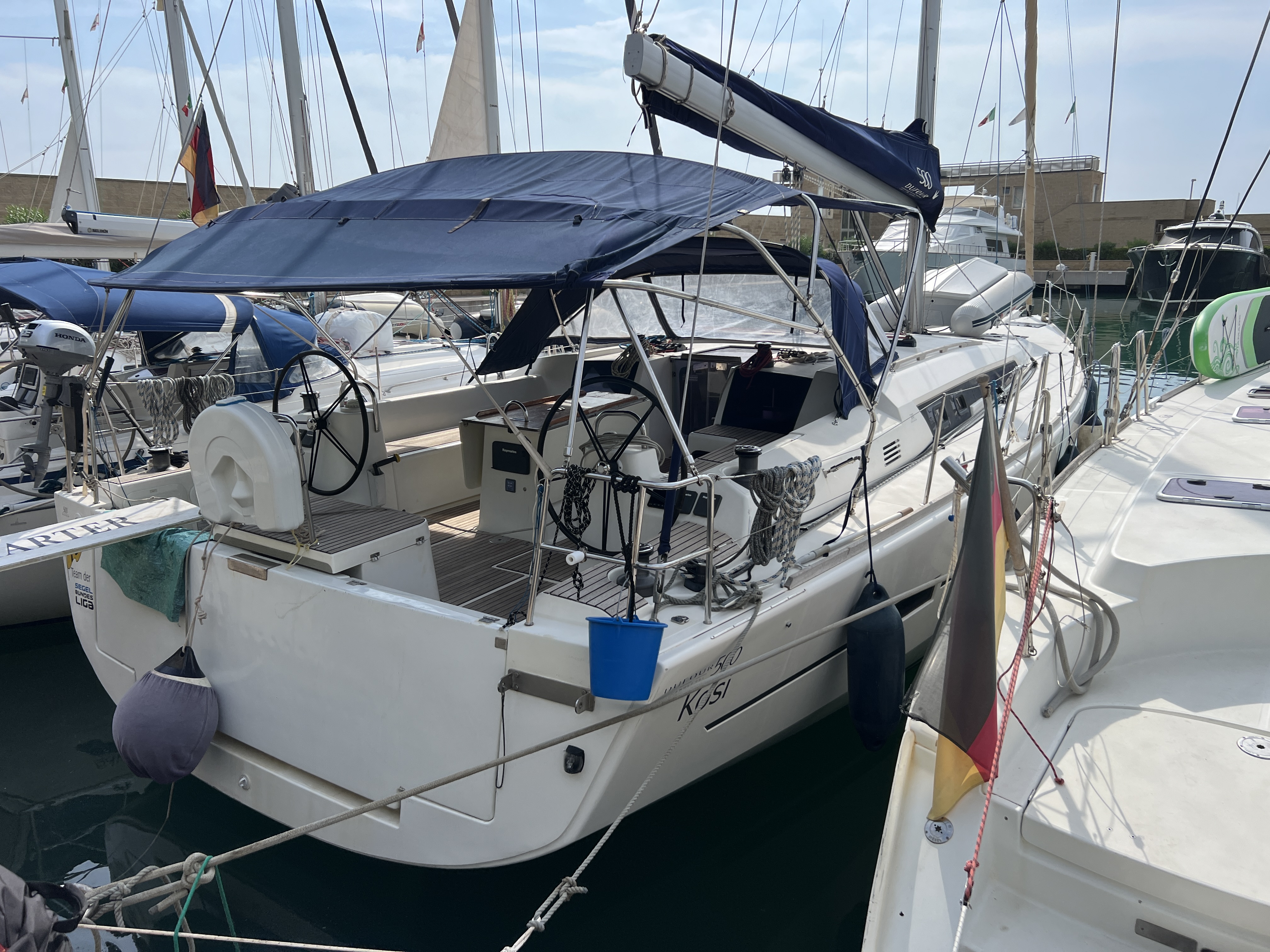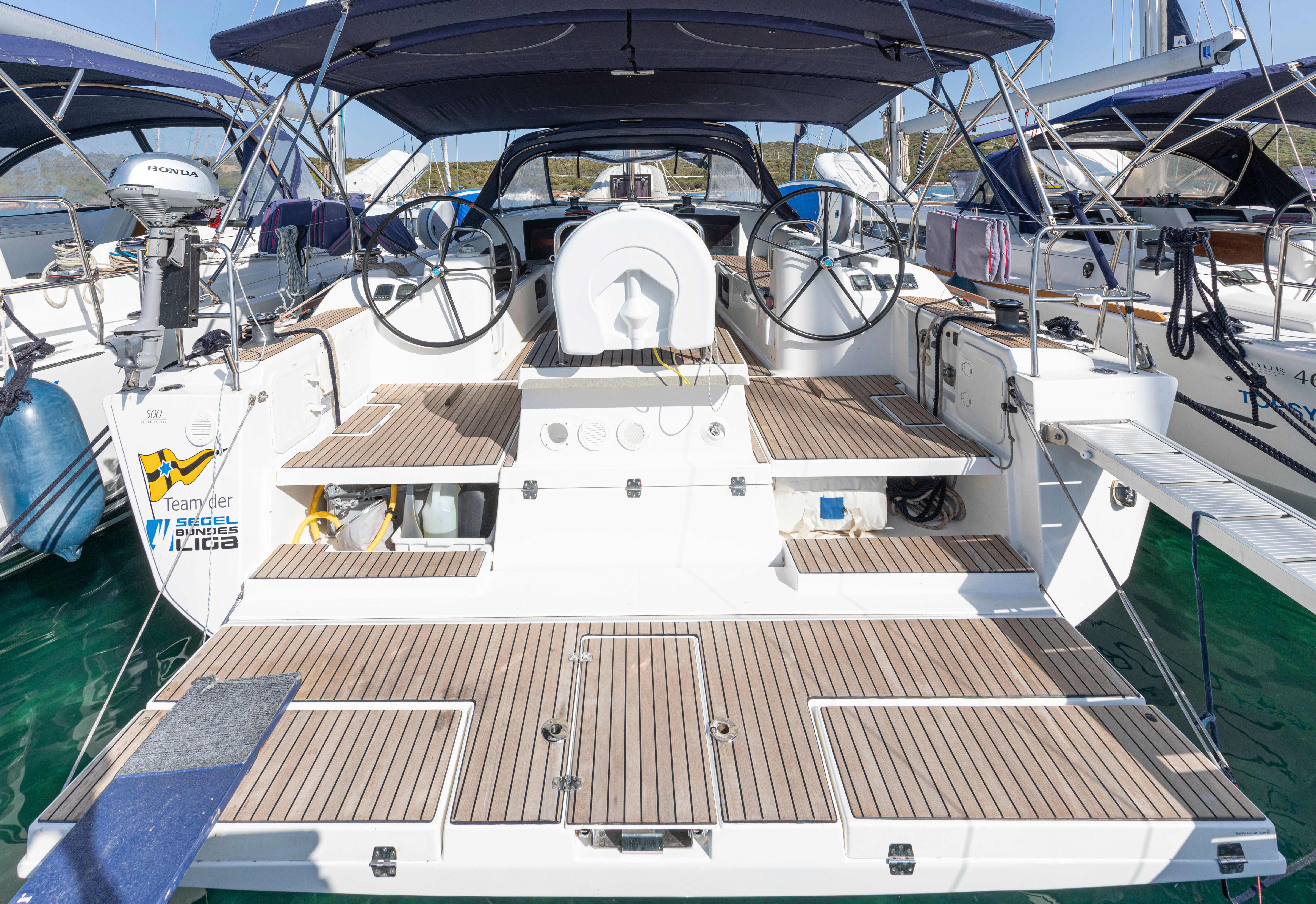 | Outside | 12 V-Anschluss, 220 V-Landanschluss, Anker mit Kette, Badeleiter, Badeplattform, Biminitop, Bootshaken, Cockpitdusche, Cockpitlautsprecher, Cockpitpolster, Cockpittisch, elektr. Ankerwinsch, elektr. Großwinsch, elektr. Winsch, Festmacherleinen, Sprayhood, Winschen |