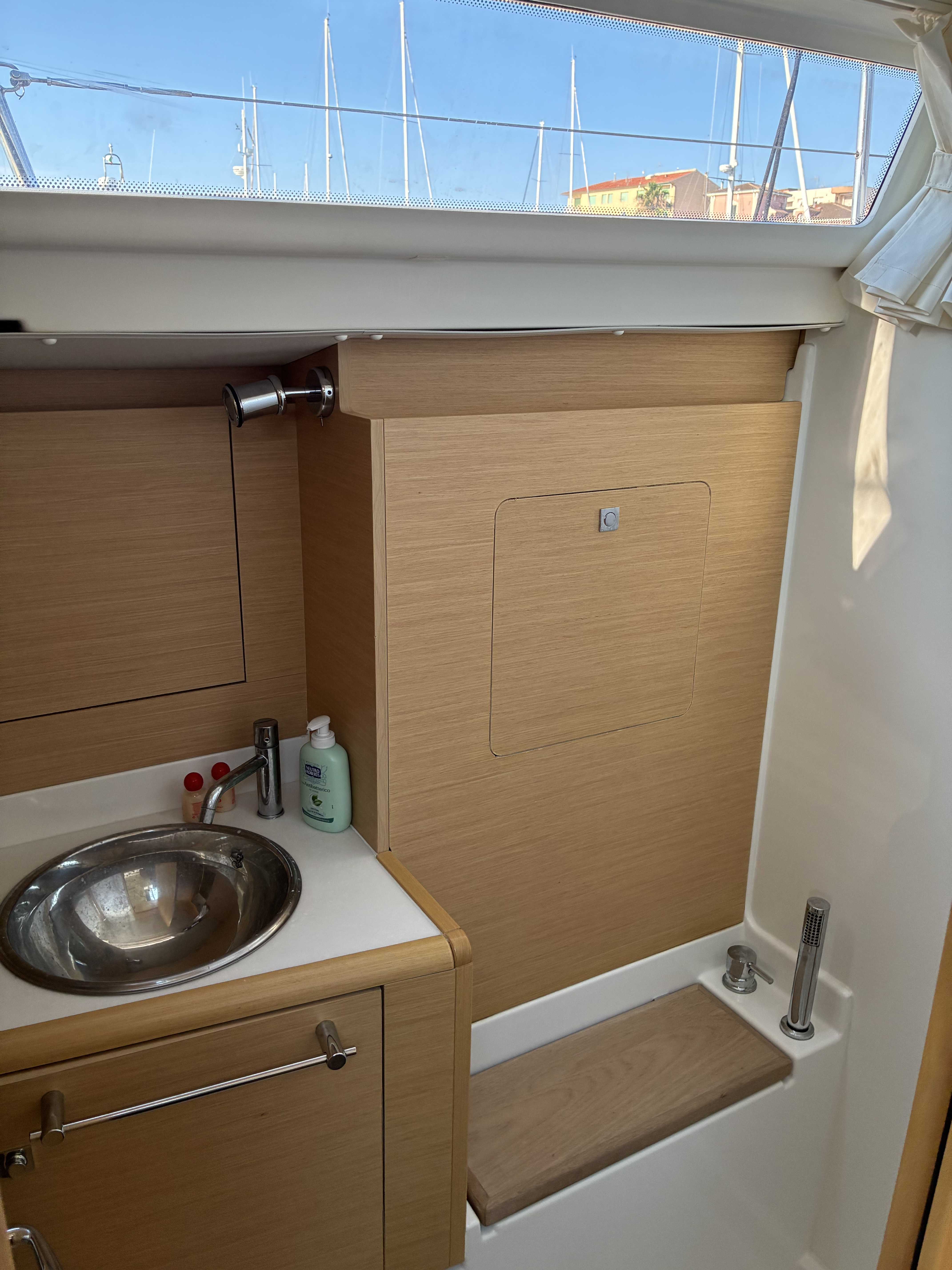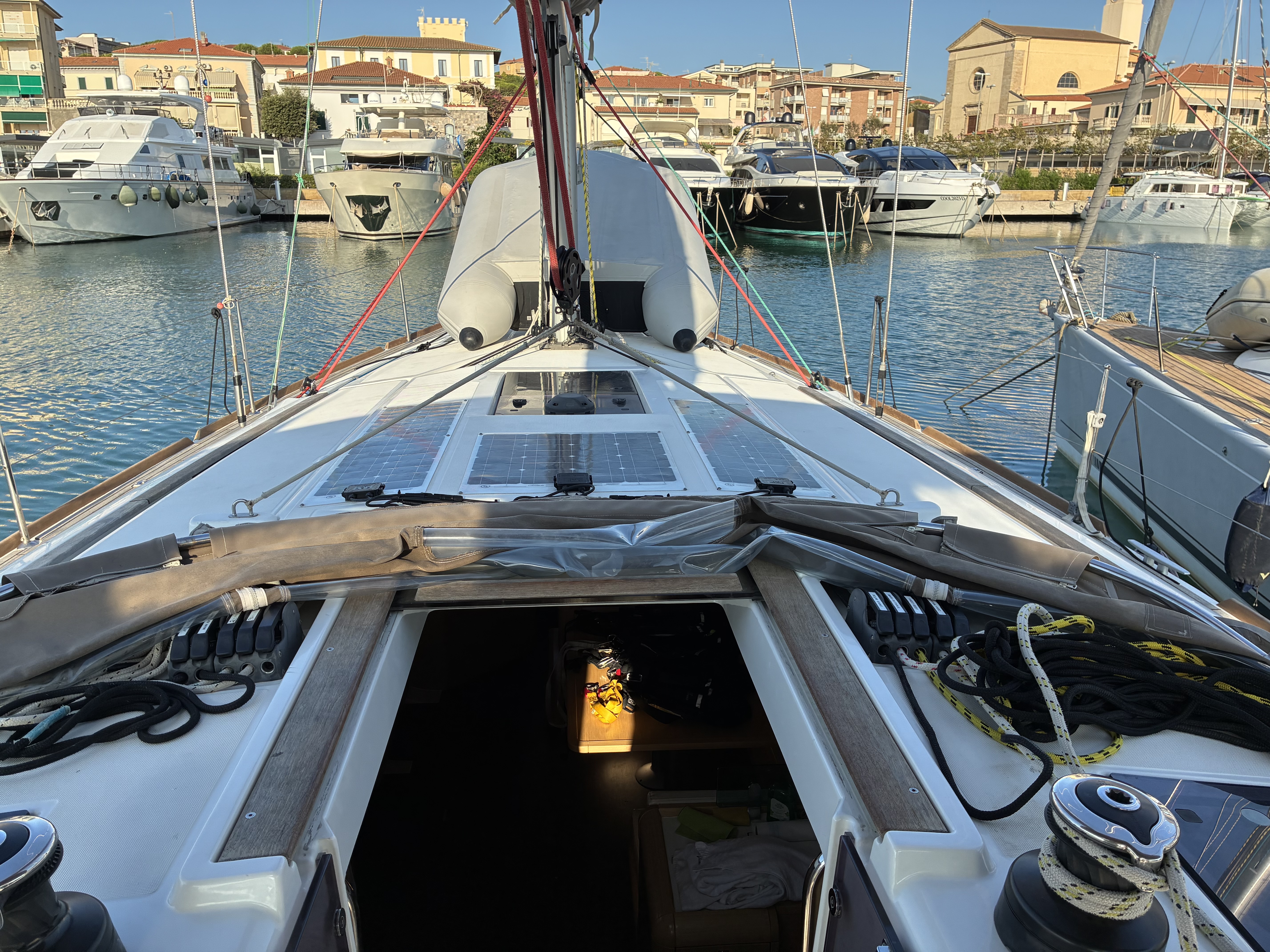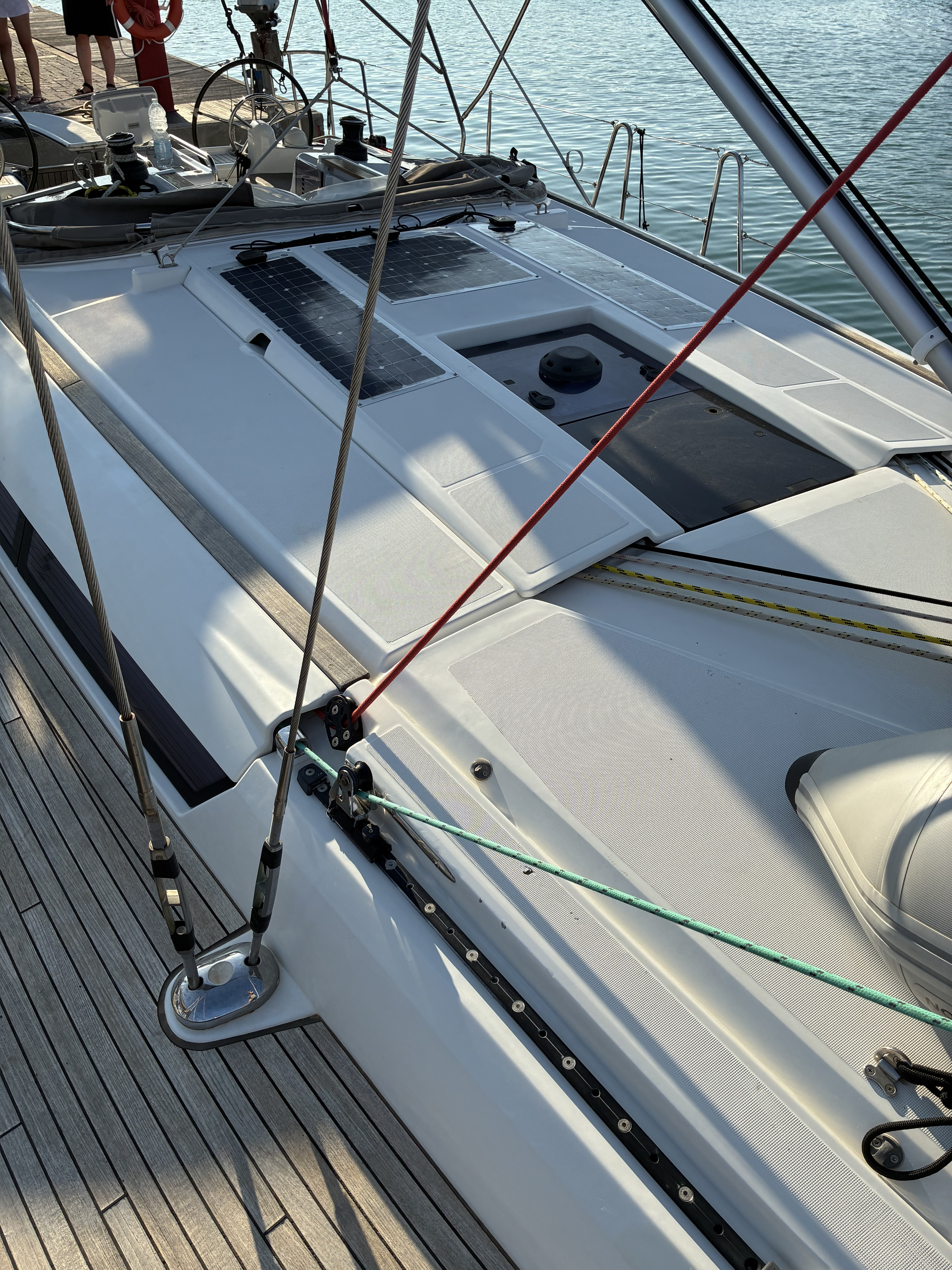 | Outside | 12 V-Anschluss, 220 V-Landanschluss, Anker mit Kette, Badeleiter, Biminitop, Bootshaken, Cockpitdusche, Cockpitlautsprecher, Cockpitpolster, Cockpittisch, elektr. Ankerwinsch, Faltpropeller, Festmacherleinen, Gangway, Segel-Flickwerkzeug, Solaranlage, Sprayhood, Teakdeck, Treibanker, Windex, Winschen |