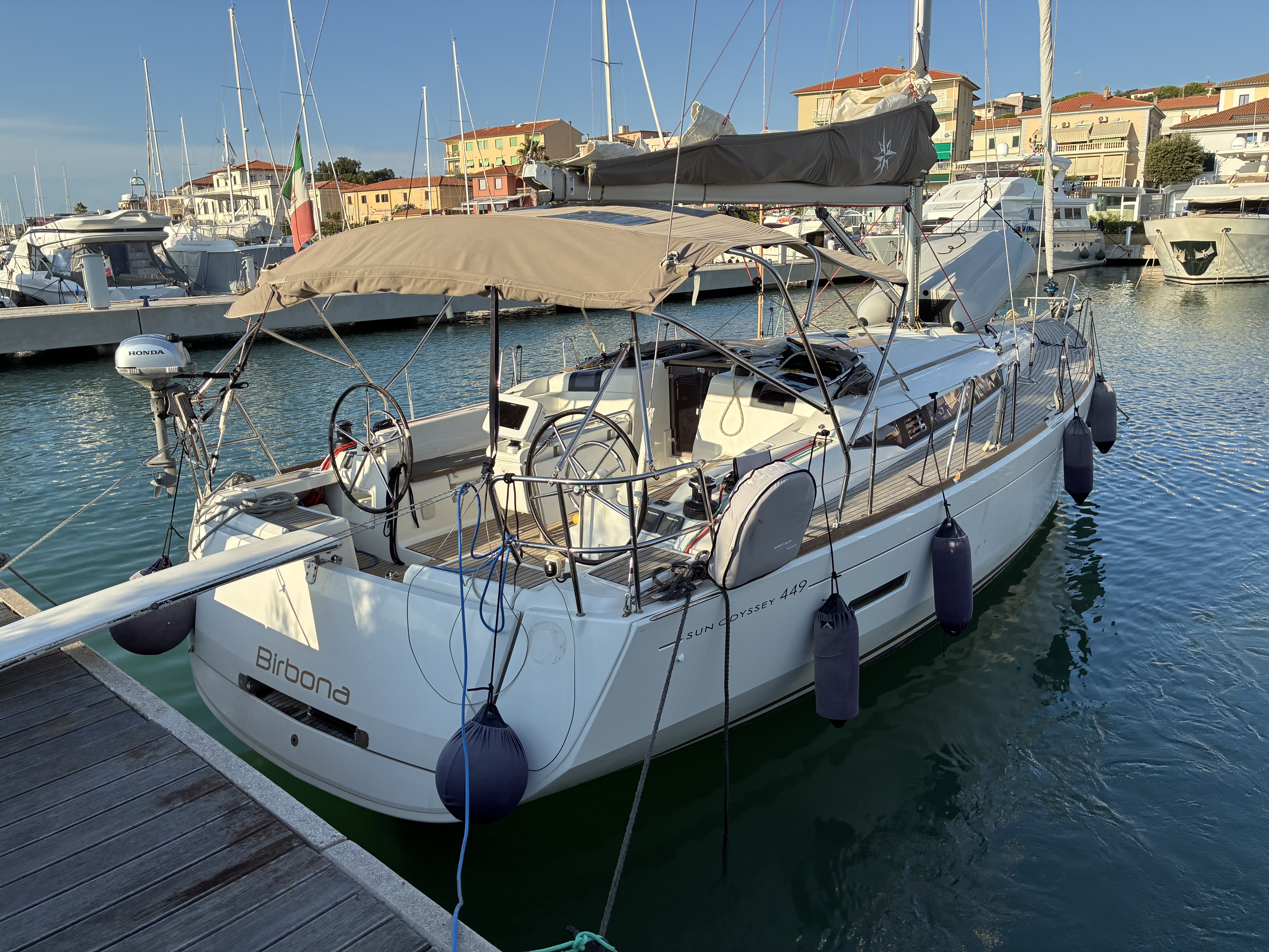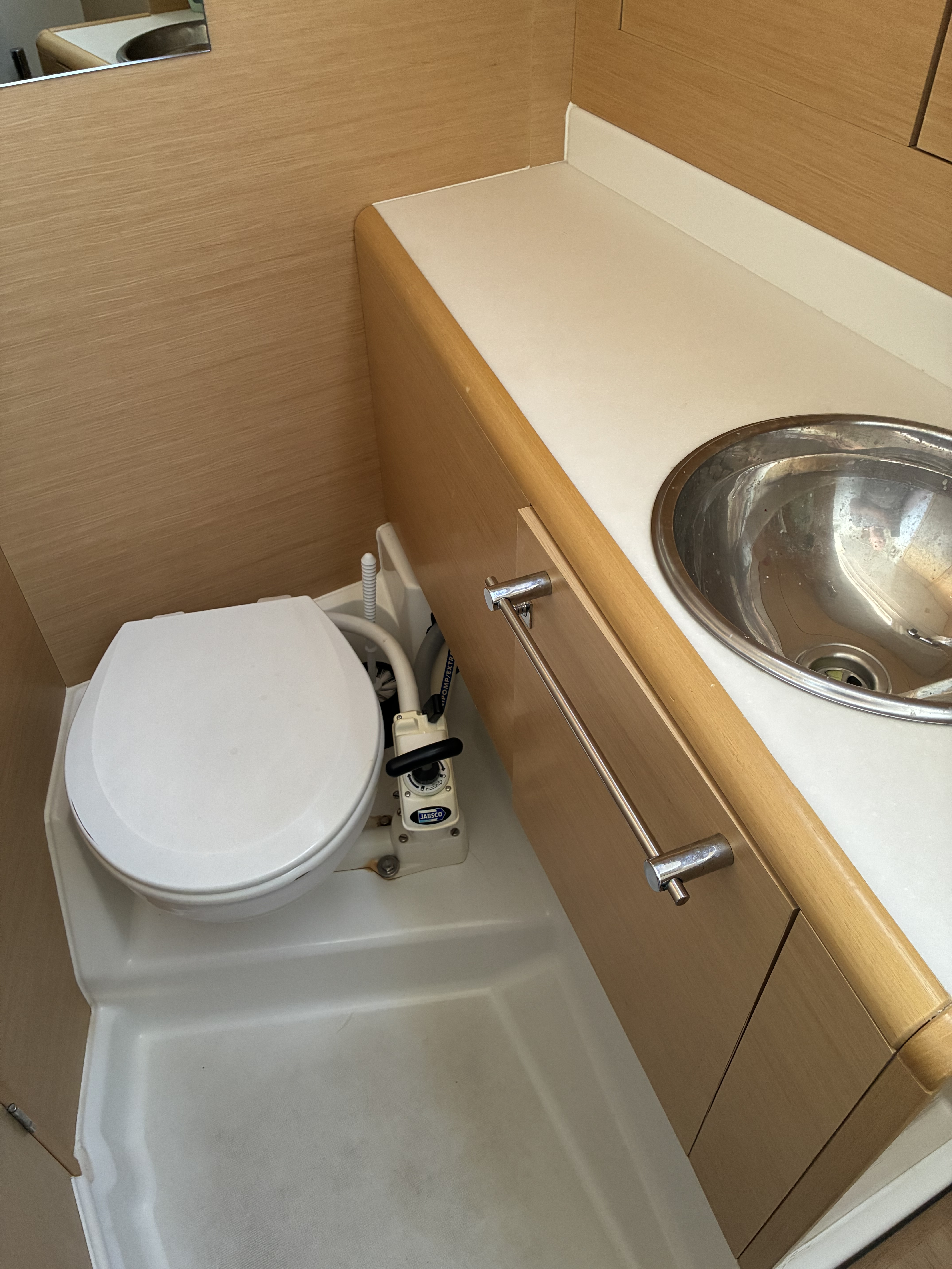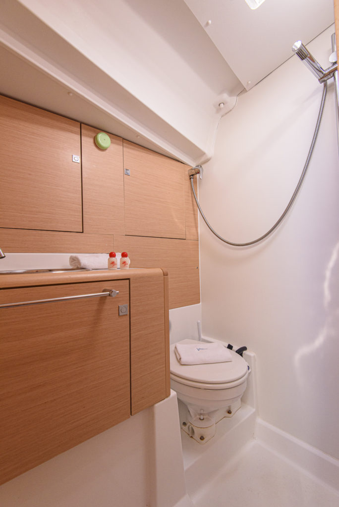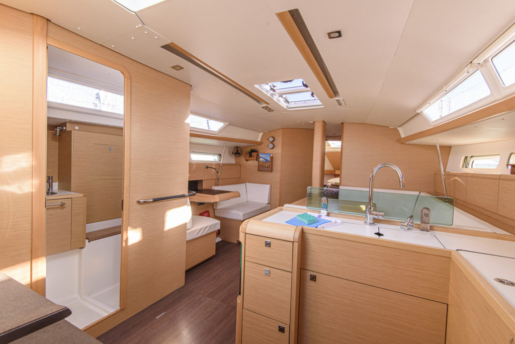 | Outside | 12 V-Anschluss, 220 V-Landanschluss, Anker mit Kette, Badeleiter, Biminitop, Bootshaken, Cockpitdusche, Cockpitlautsprecher, Cockpitpolster, Cockpittisch, elektr. Ankerwinsch, Faltpropeller, Festmacherleinen, Gangway, Segel-Flickwerkzeug, Solaranlage, Sprayhood, Teakdeck, Treibanker, Windex, Winschen |