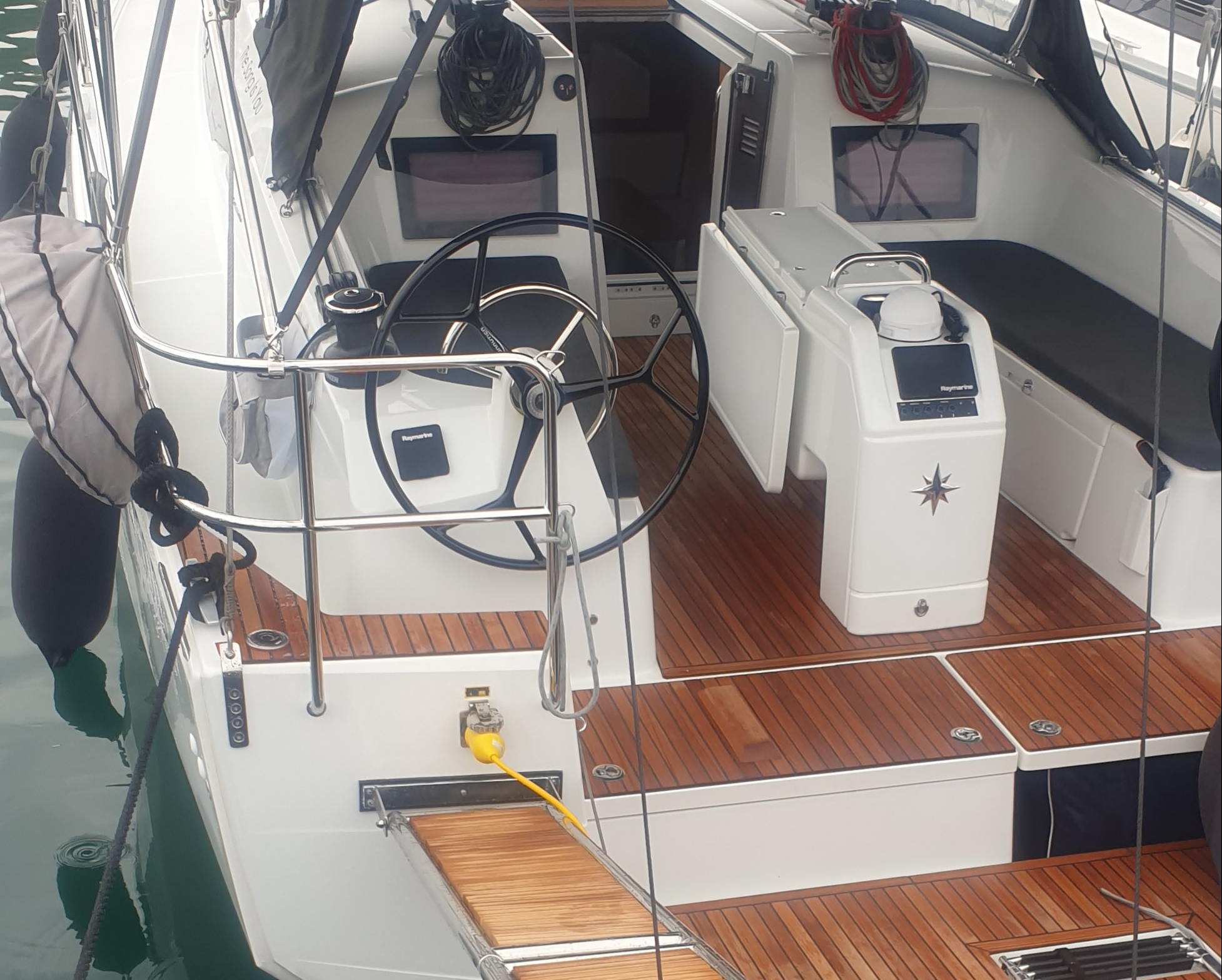 | Outside | 220 V-Landanschluss, Badeplattform, Biminitop, Cockpitdusche, Cockpitlautsprecher, Cockpitpolster, Cockpittisch mit Eisbox, Sprayhood, Teak im Cockpit |