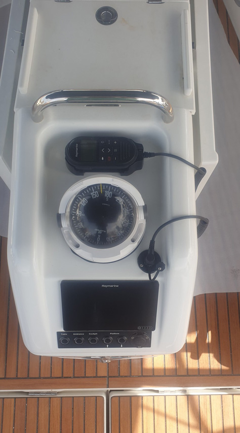 | Navigation | Barometer, Fernglas mit Peilkompass, GPS mit Kartenplotter im Cockpit, Hafenhandbücher, Handpeilkompass, Navigationsbesteck, Seekarten, Tridata (Log, Echolot, Windm.) |