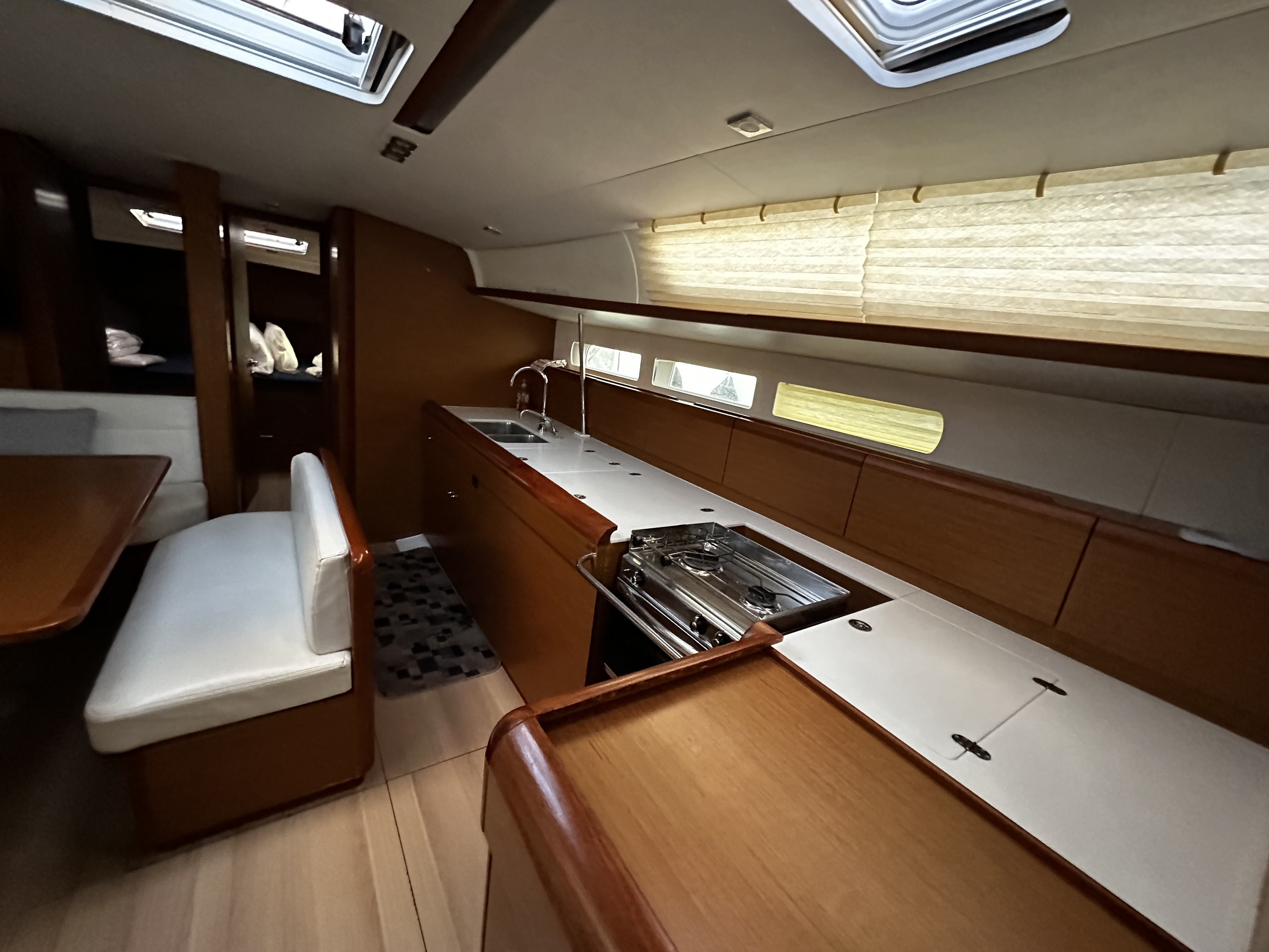 | Outside | Biminitop, Cockpitdusche, Cockpitlautsprecher, Cockpitpolster, elektr. Winsch, Sprayhood, Teak im Cockpit, Unterwasserbeleuchtung |