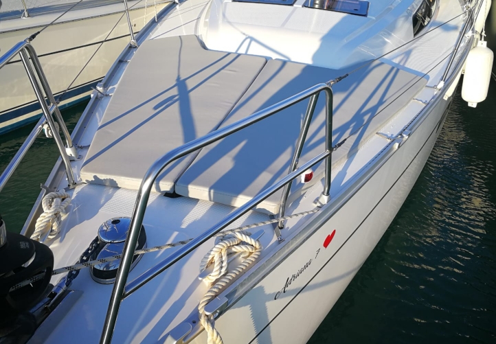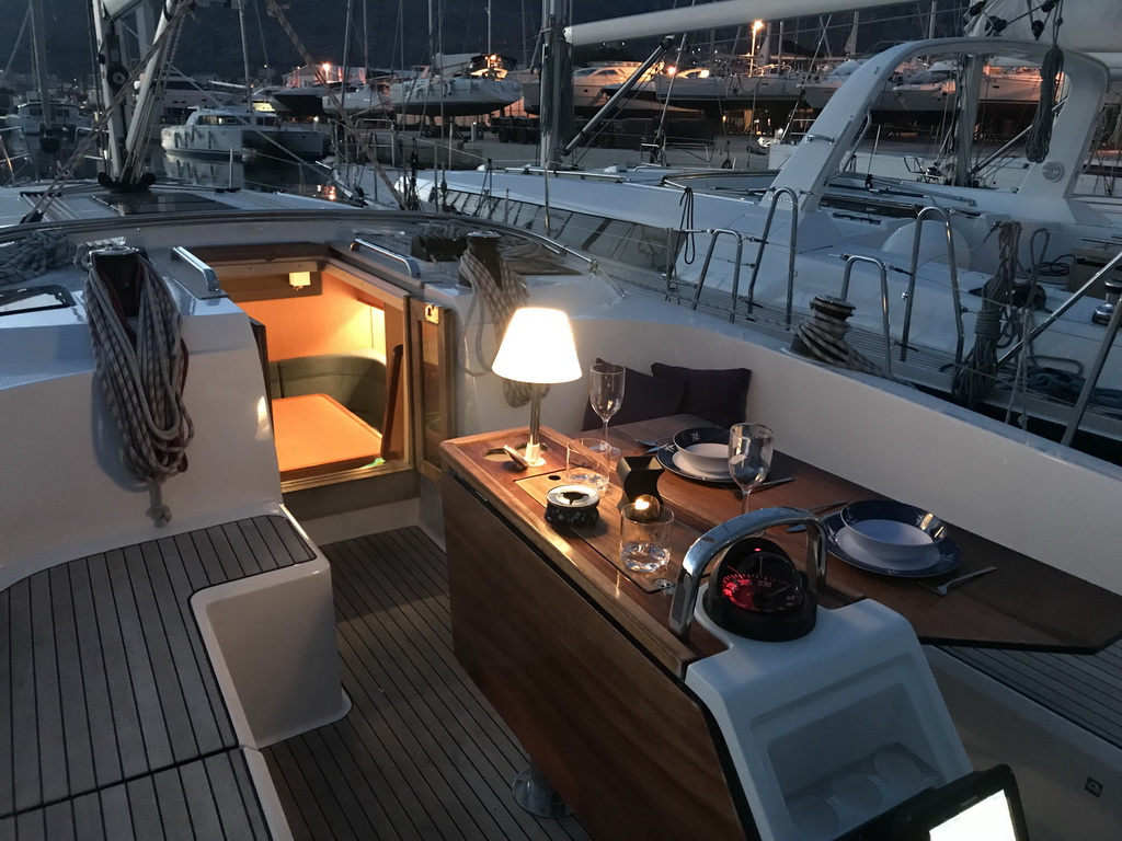 Outside Badeleiter, Badeplattform, Biminitop, Cockpitdusche, Cockpitlautsprecher, Cockpittisch, Deckpolster, elektr. Ankerwinsch, Fender, Gangway, Kugelfender, Kunststoff-Eimer (Pütz), Solaranlage, Sprayhood, Windex, Winschen