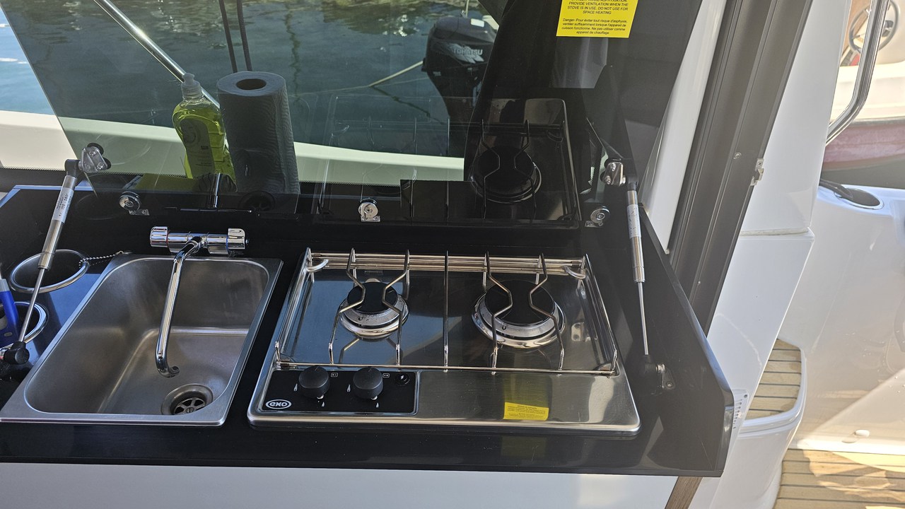 | Outside | 220 V-Landanschluss, Biminitop, Cockpitdusche, Cockpitpolster, Cockpittisch, Deckpolster, elektr. Ankerwinsch, Solaranlage |