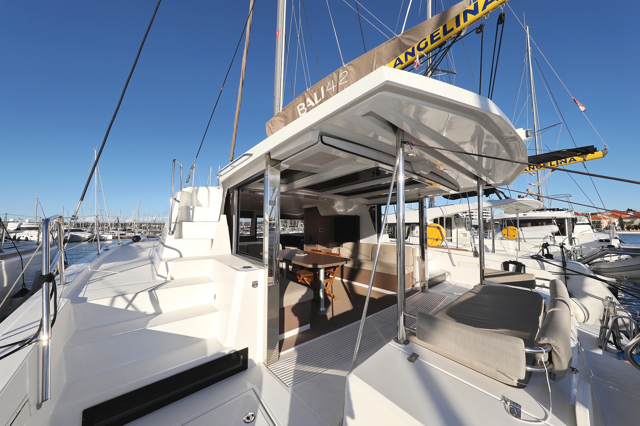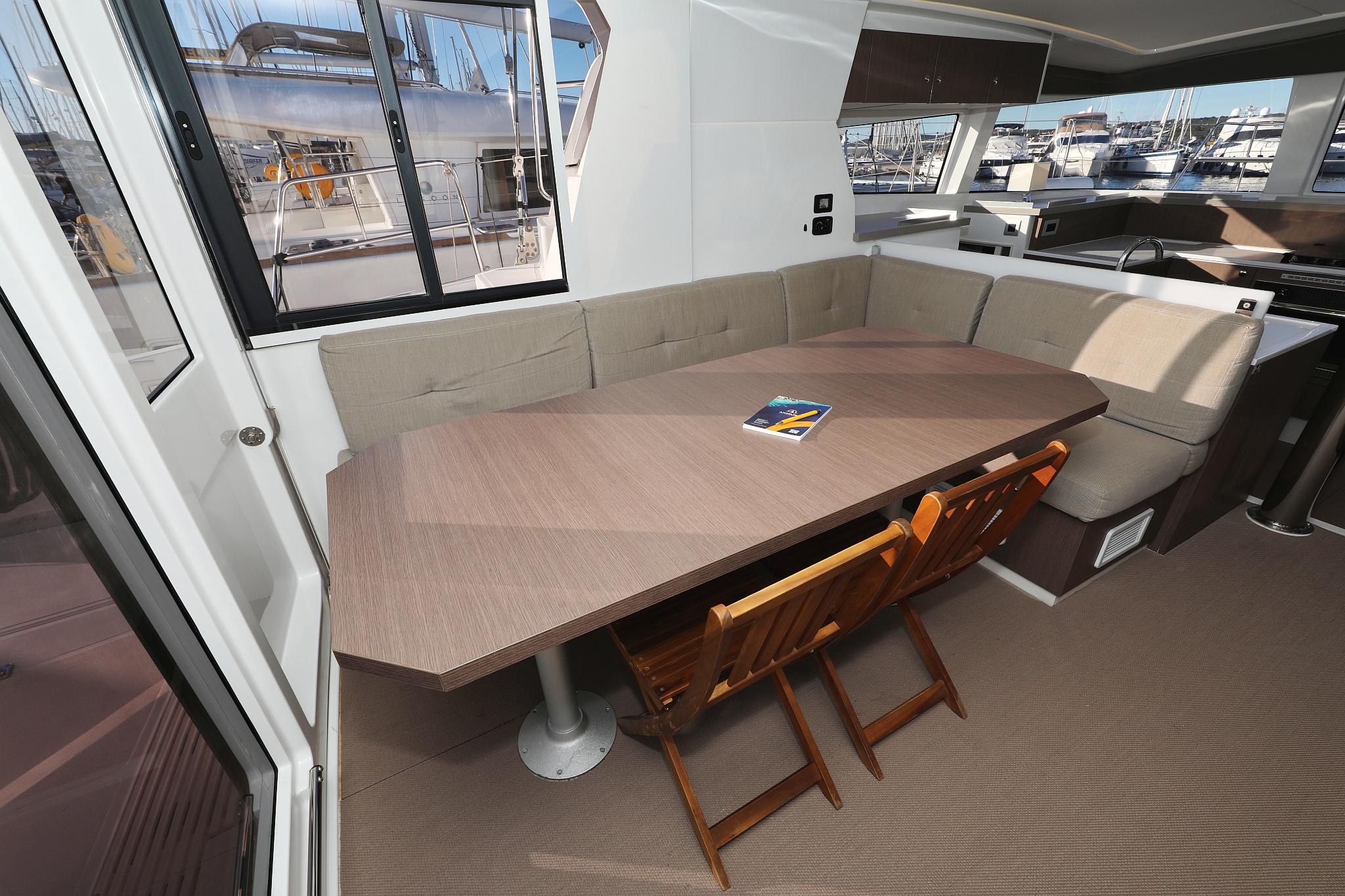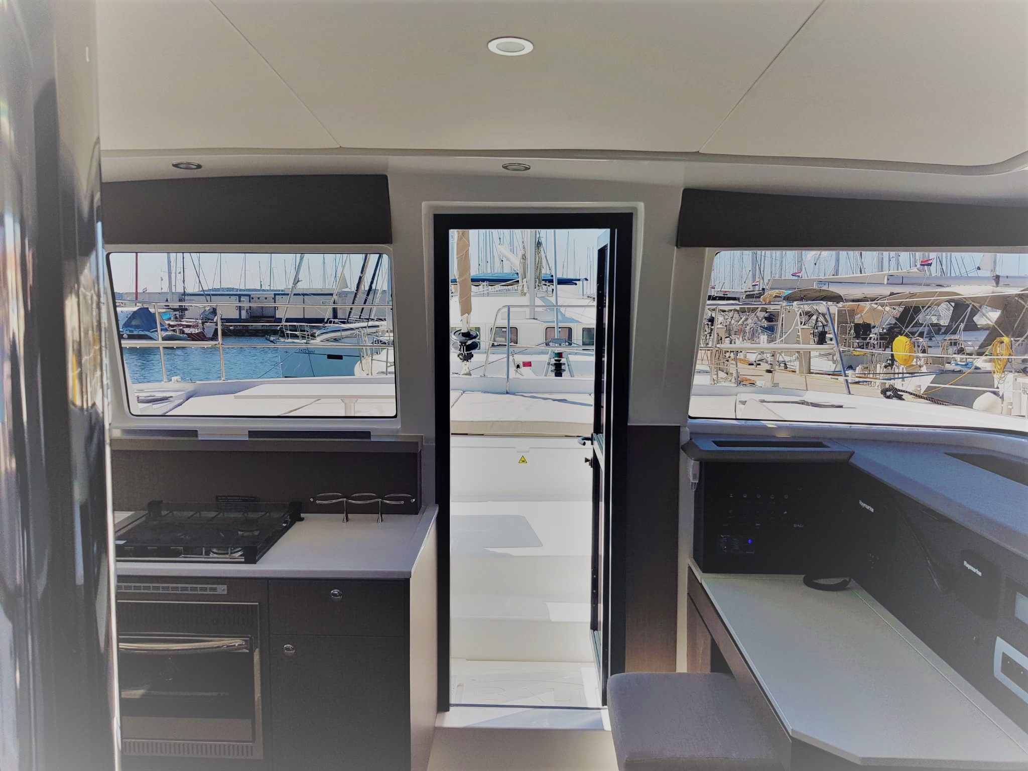 | Outside | 12 V-Anschluss, 220 V-Landanschluss, Anker mit Kette, Bootshaken, Cockpitdusche, Cockpitlautsprecher, Cockpitpolster, Cockpittisch, Deckpolster, elektr. Ankerwinsch, elektr. Winsch, Fender, Festmacherleinen, Gangway, Grill, Hardtop, Solaranlage, Sonnendeck, Wasserschlauch, Winschen |