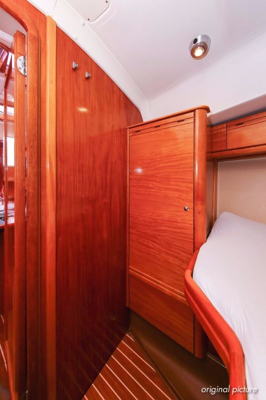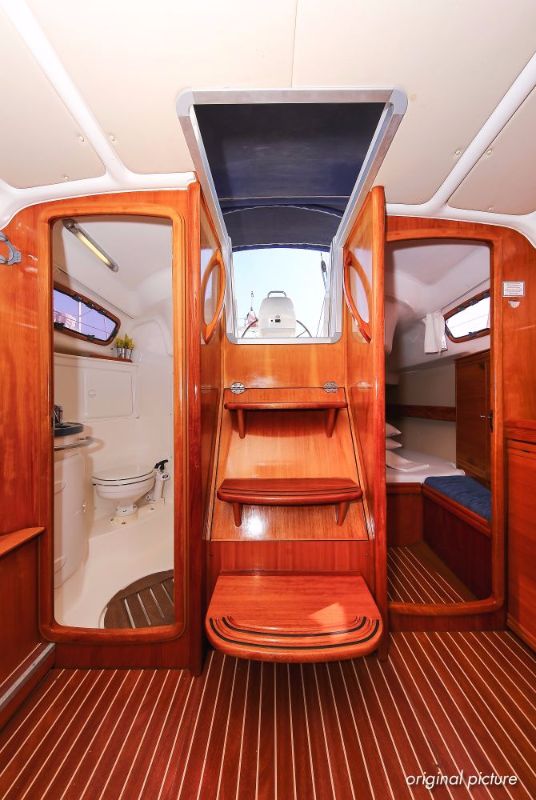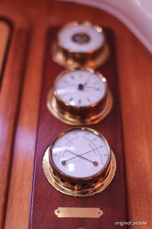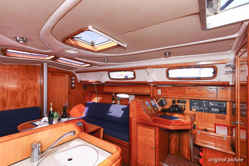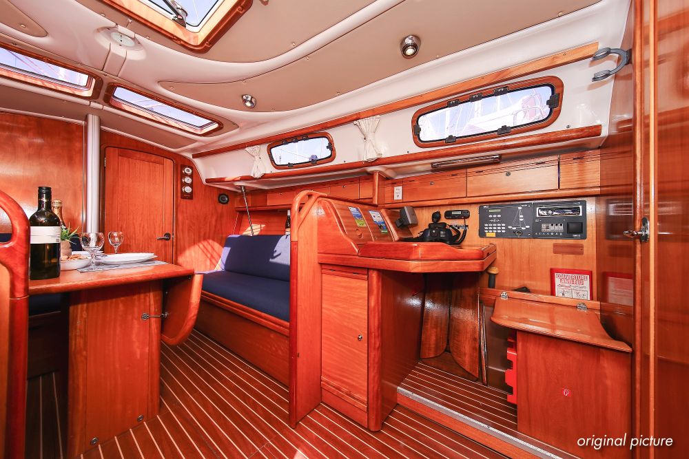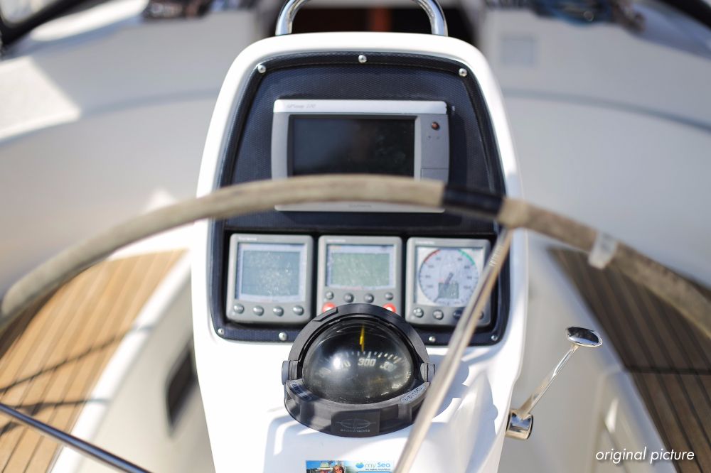 | Navigation | Barometer, Fernglas, Fernglas mit Peilkompass, GPS mit Kartenplotter im Cockpit, GPS mit Kartenplotter im Salon, Hafenhandbücher, Handpeilkompass, Navigationsbesteck, Seekarten, Tridata (Log, Echolot, Windm.) |