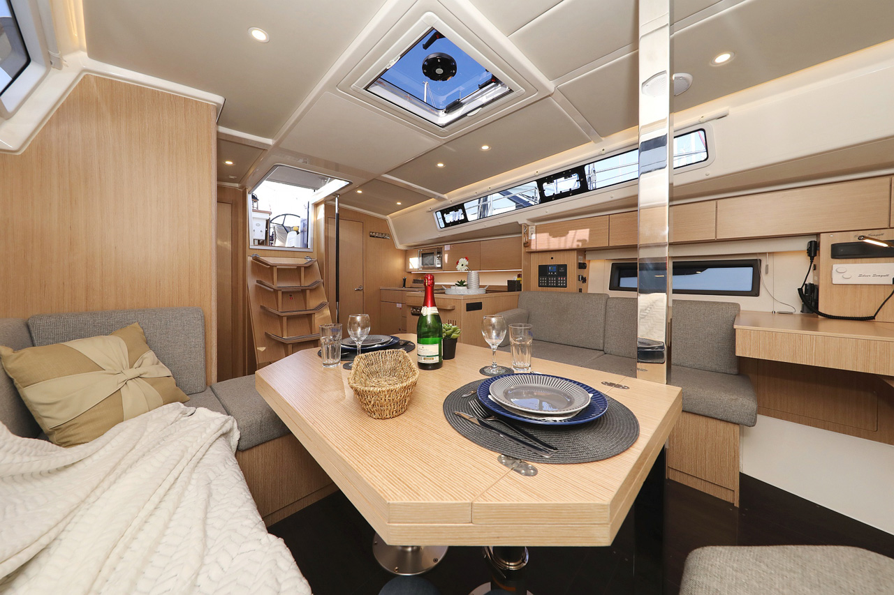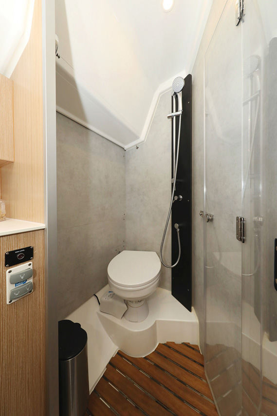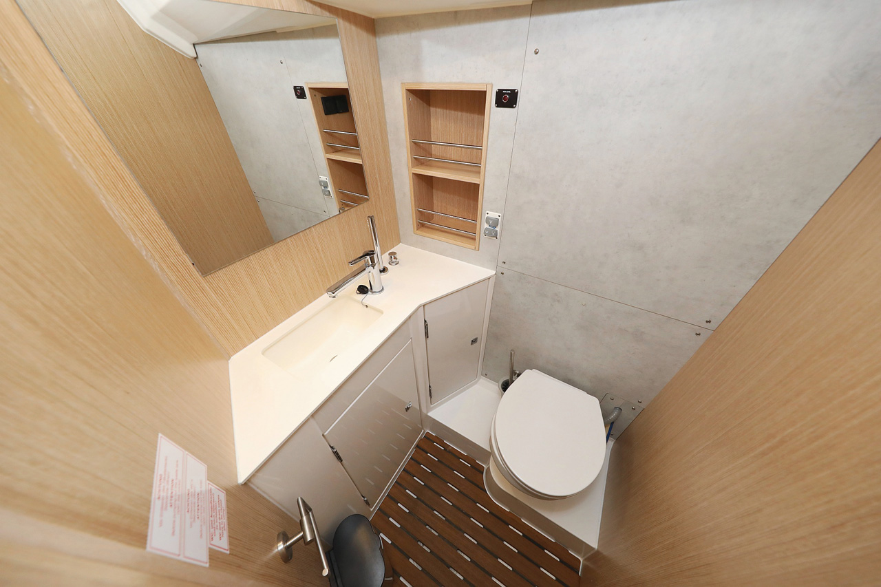| Inside | Borduhr, DVD-Player, FUSION Sound System, Heizung, Inverter 12V/220V, Kühlbox, Kühlschrank, Ladegerät, Luftpumpe für Beiboot, Mikrowelle, Pantryausstattung, Radio mit Bluetooth, Salontisch absenkbar, Warmwasser, WC (elektr.) |