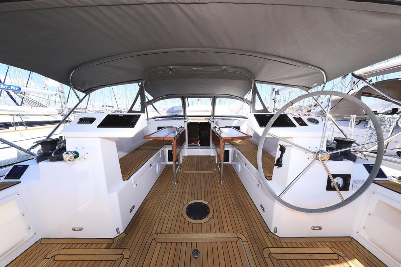 | Outside | 220 V-Landanschluss, Badeplattform, Biminitop, Cockpitdusche, Cockpitlautsprecher, Cockpitpolster, Cockpittisch, Delta-Anker, elektr. Ankerwinsch, elektr. Genuawinsch, Fender, Festmacherleinen, Seereling, Solaranlage, Sprayhood, Teak im Cockpit, Wantenschneider, Windex |