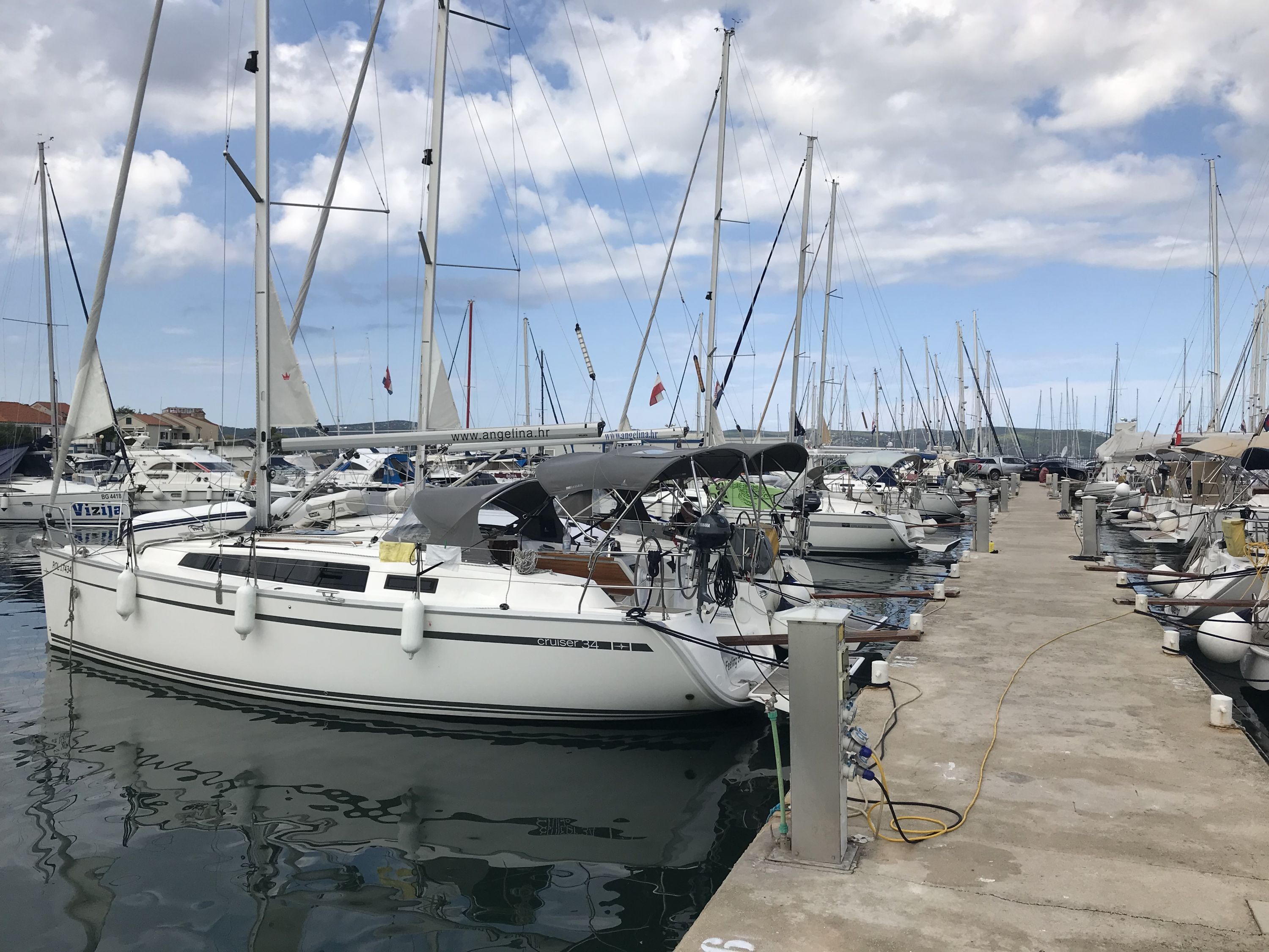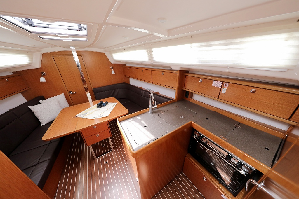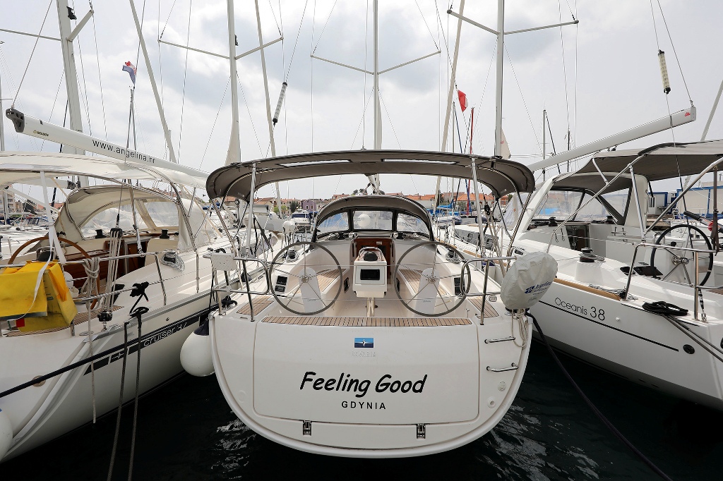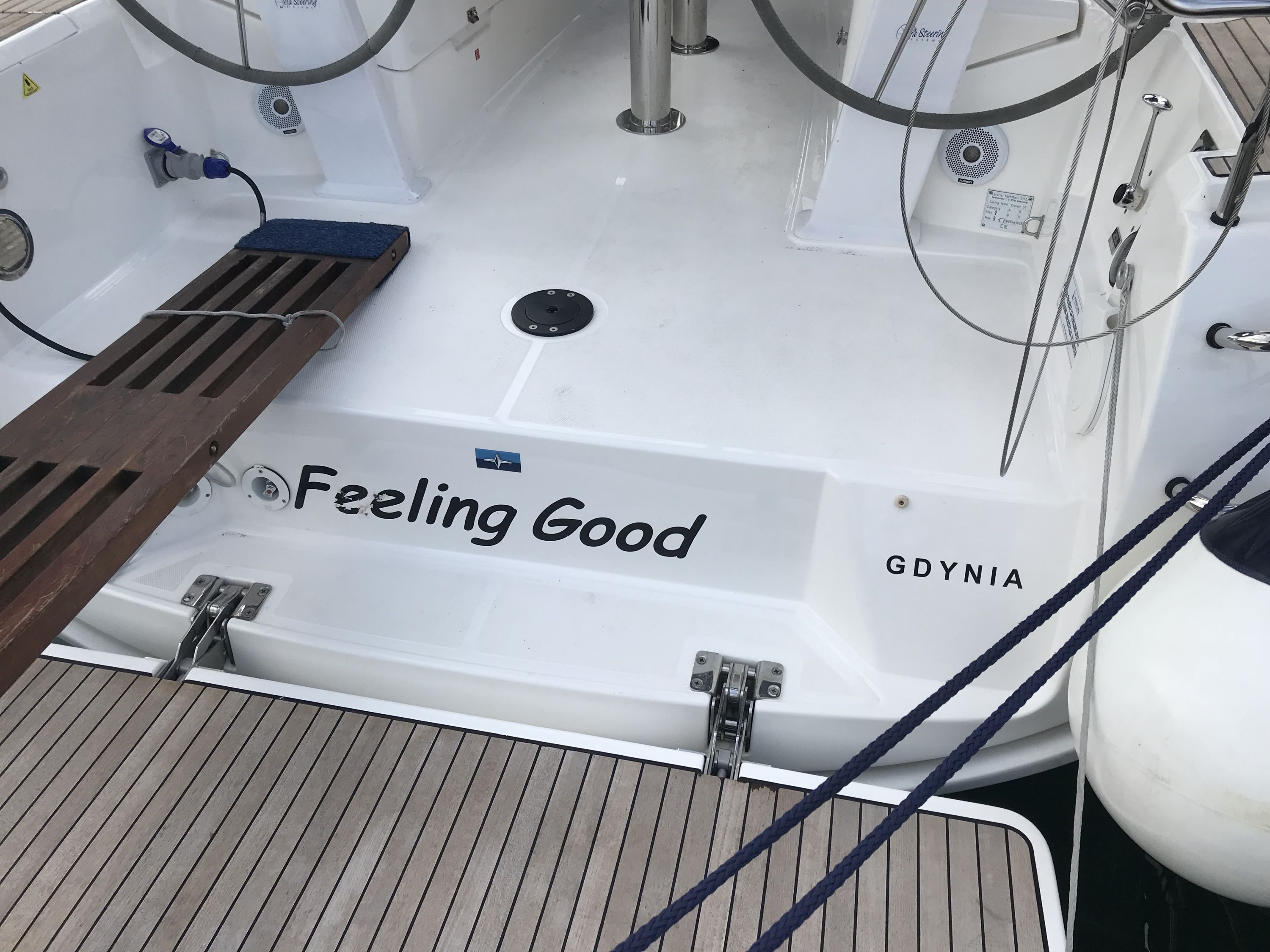 | Outside | 220 V-Landanschluss, Badeplattform, Biminitop, Bootshaken, Cockpitdusche, Cockpitlautsprecher, Cockpitpolster, Cockpittisch, Delta-Anker, elektr. Ankerwinsch, Fender, Festmacherleinen, Gangway, Kugelfender, Sprayhood, Teak auf Badeplattform, Teak im Cockpit, Wasserschlauch, Winschen |
