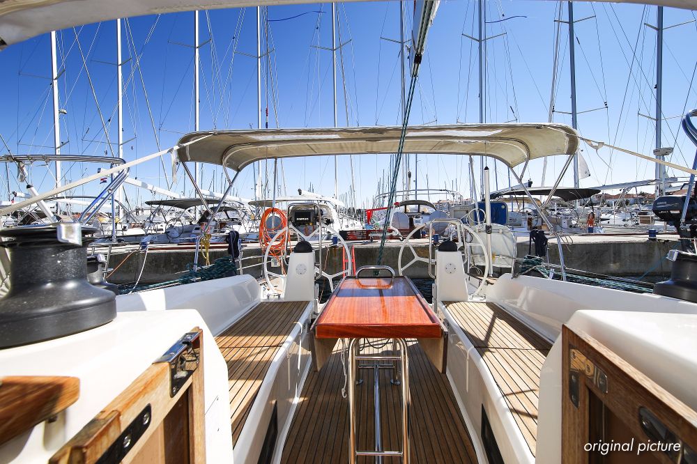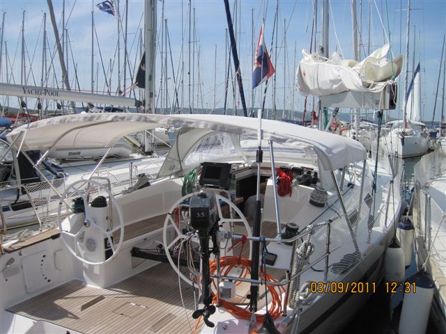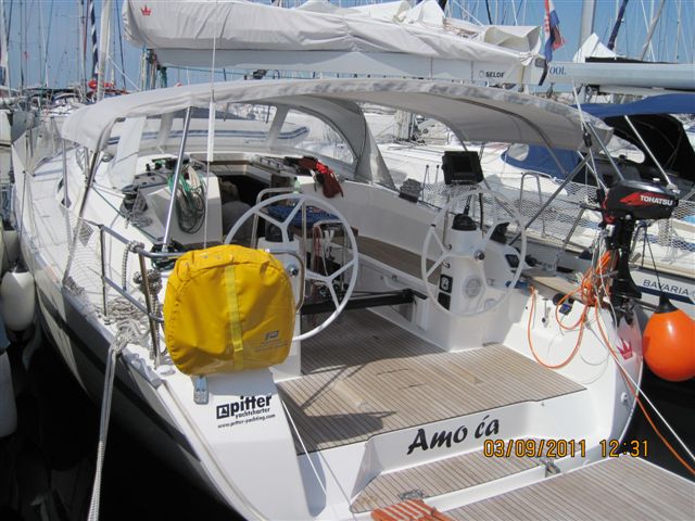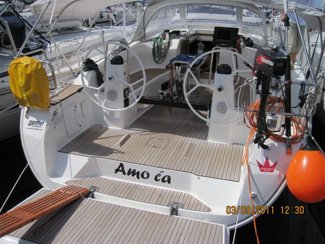 | Outside | 220 V-Landanschluss, Anker mit Kette, Ankerwinsch, Badeplattform, Biminitop, Bootshaken, Cockpitdusche, Cockpitlautsprecher, Cockpittisch, Dieselkanister , elektr. Ankerwinsch, Faltpropeller, Fender, Festmacherleinen, Gangway, Kugelfender, Kunststoff-Eimer (Pütz), Sprayhood, Teak im Cockpit, Wantenschneider, Wasserkanister , Wasserschlauch, Windex |