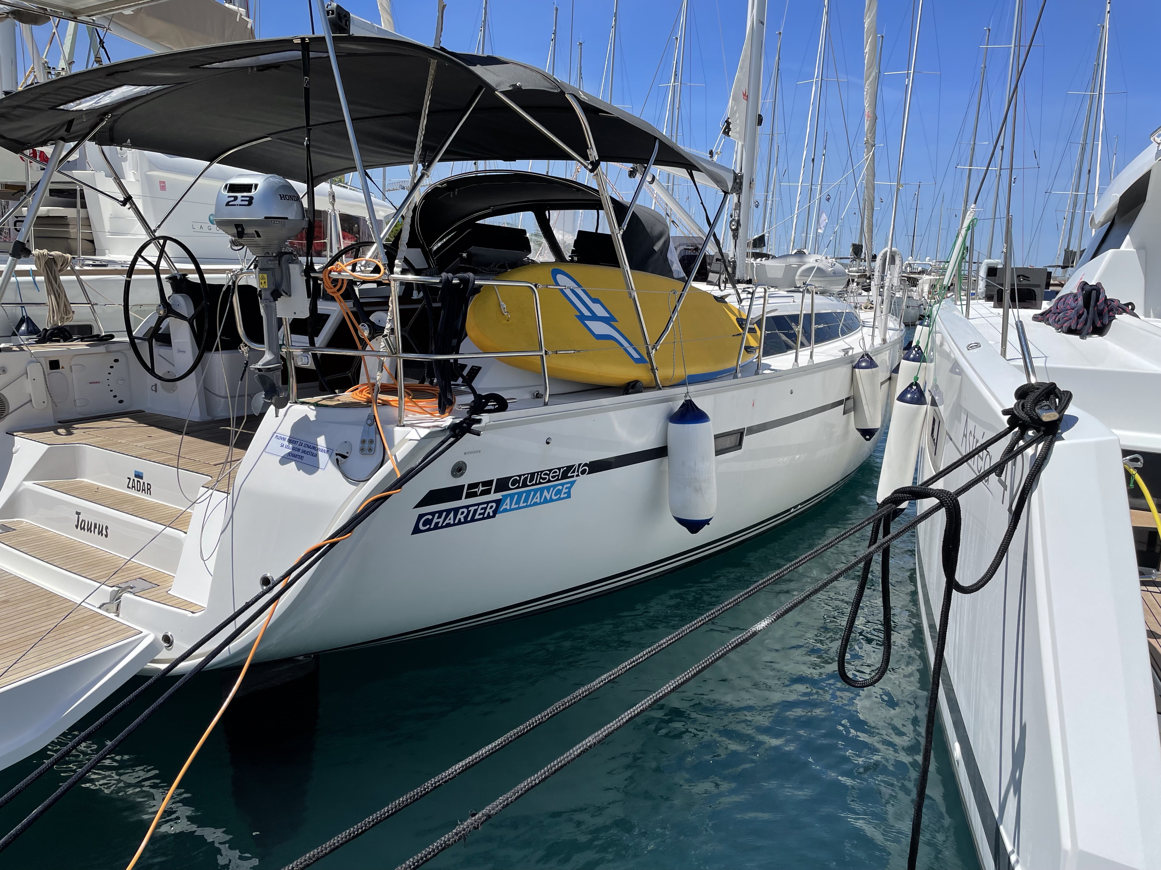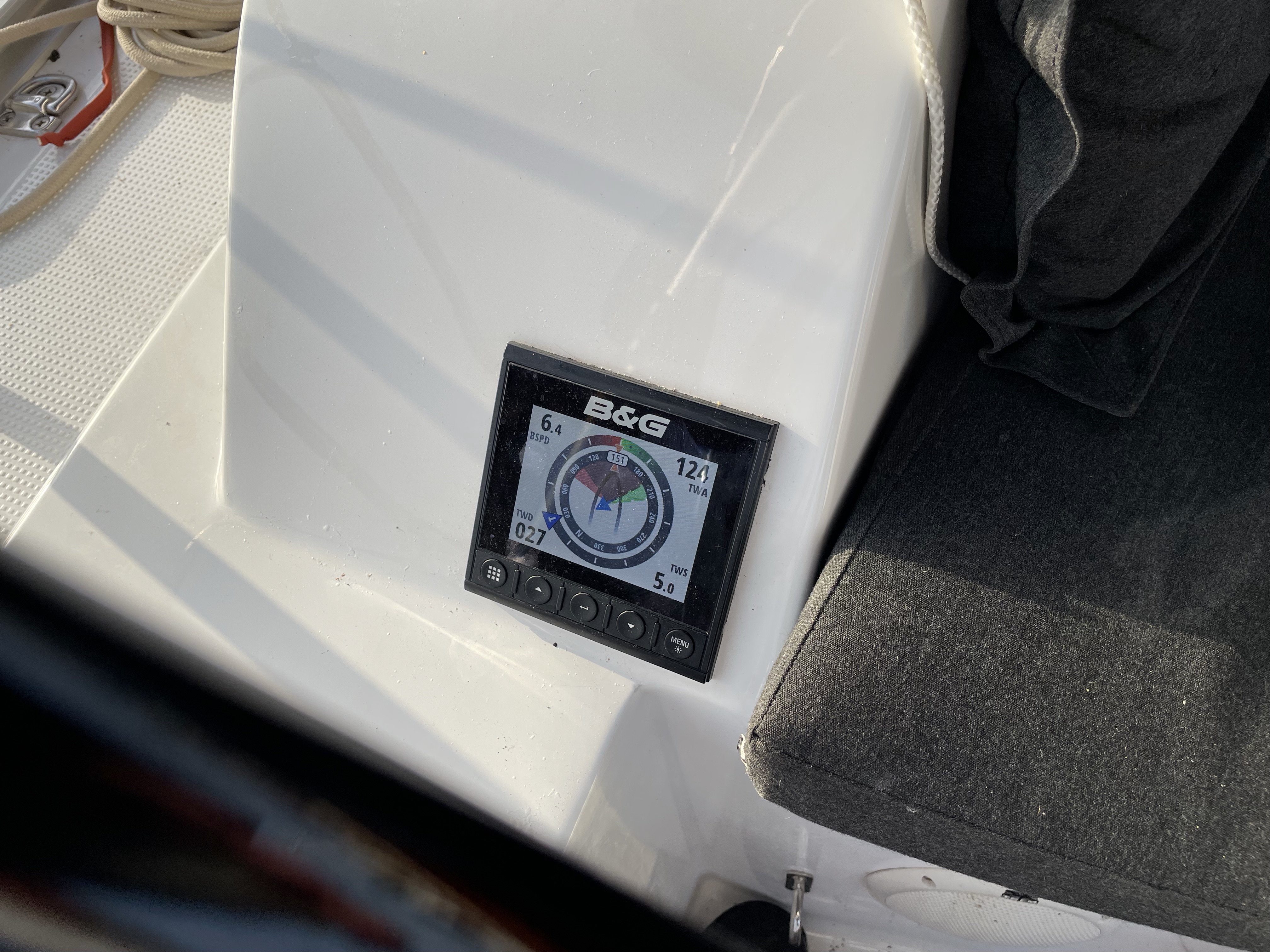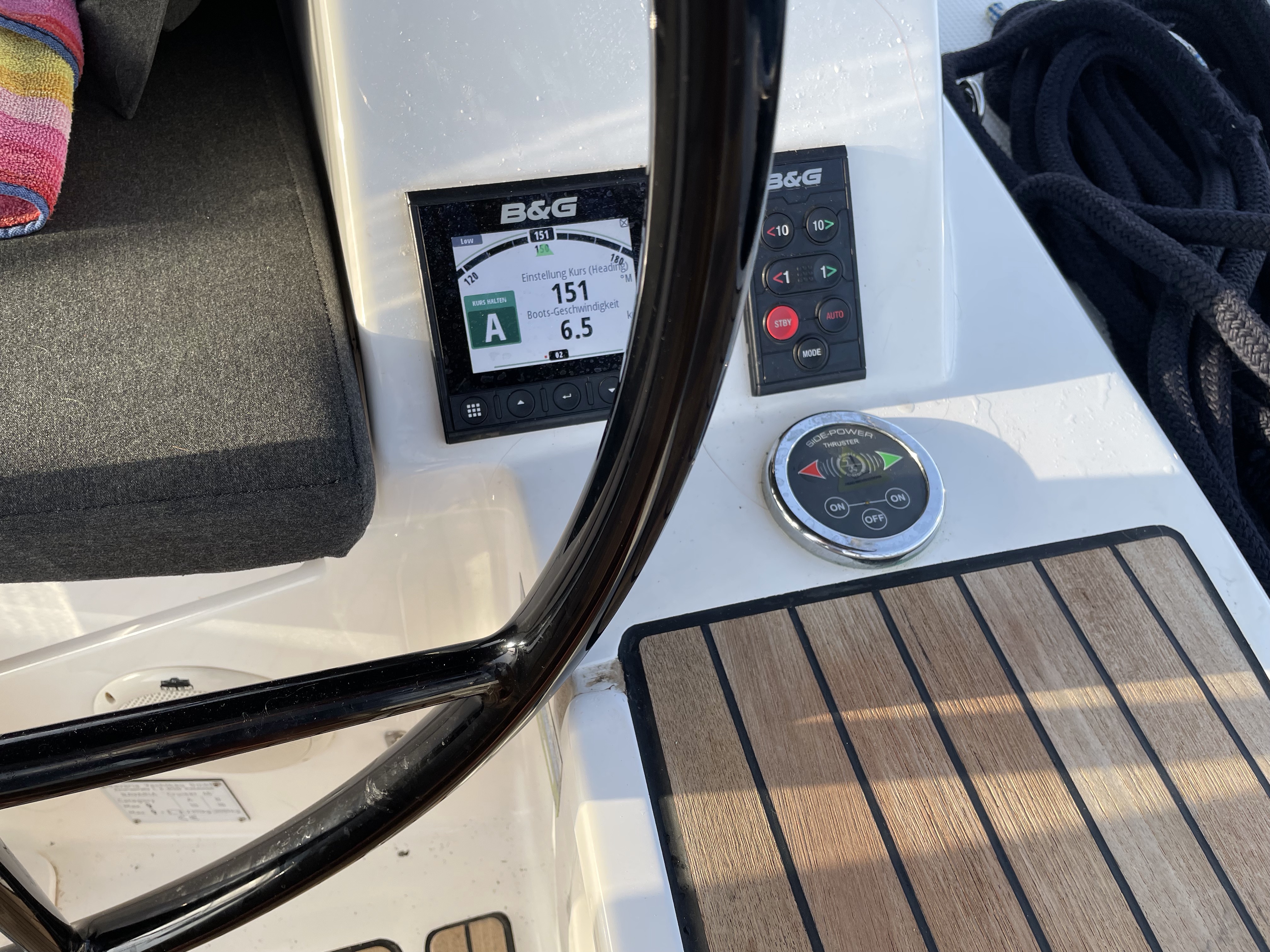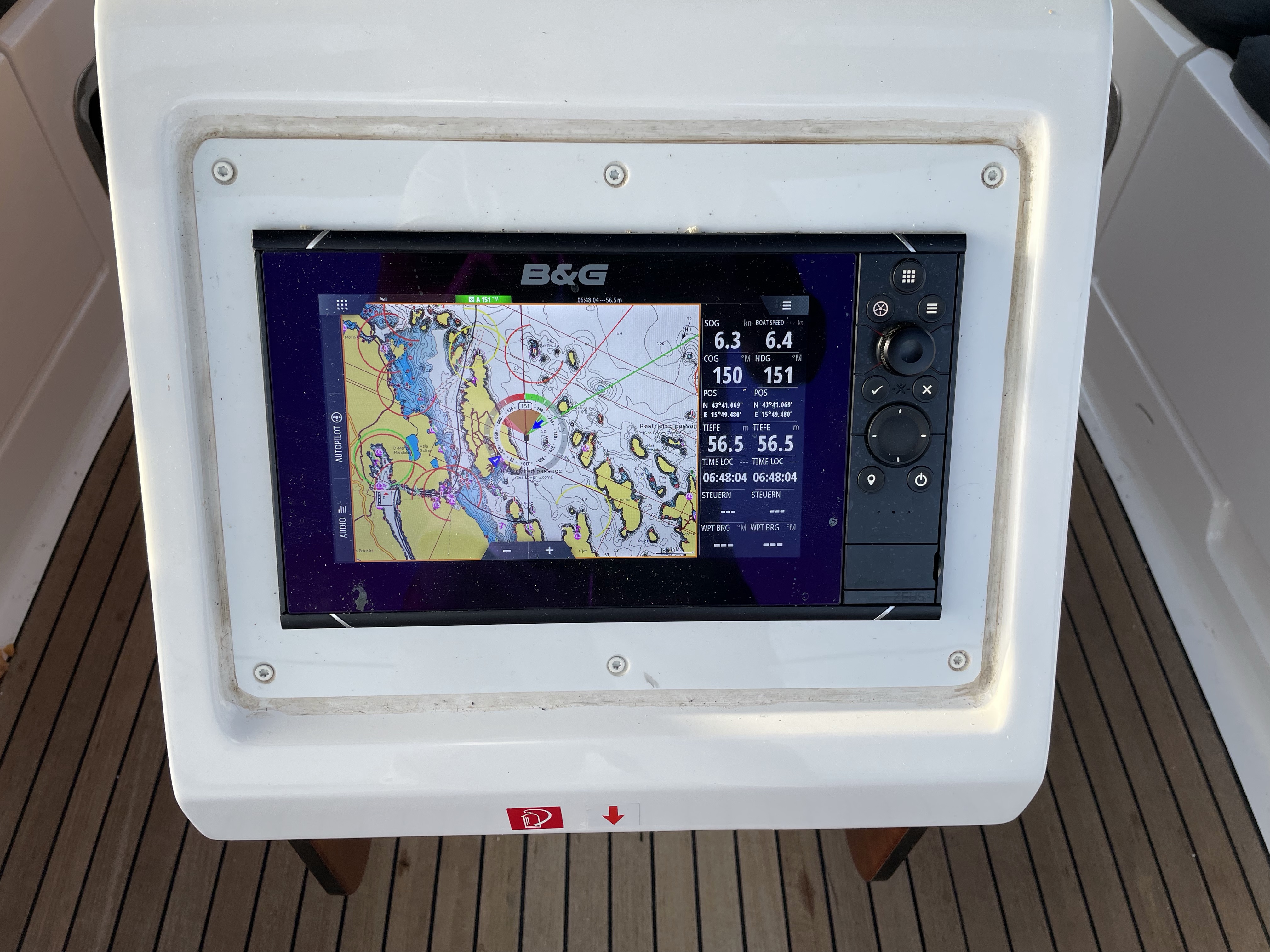 | Navigation | Barometer, Fernglas mit Peilkompass, GPS mit Kartenplotter im Cockpit, Hafenhandbücher, Navigationsbesteck, Seekarten, Tridata (Log, Echolot, Windm.) |